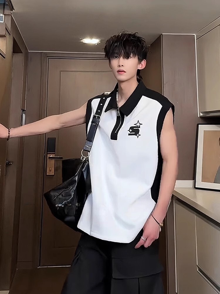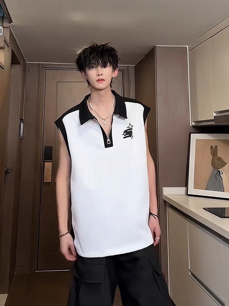 半拉鍊背心男款夏季美式高街痞帥撞色運動坎肩高級感翻領無袖t恤