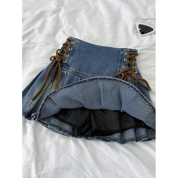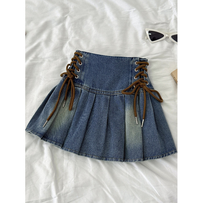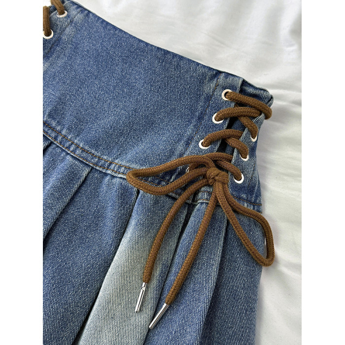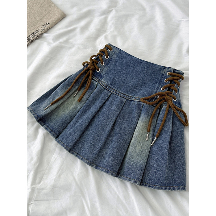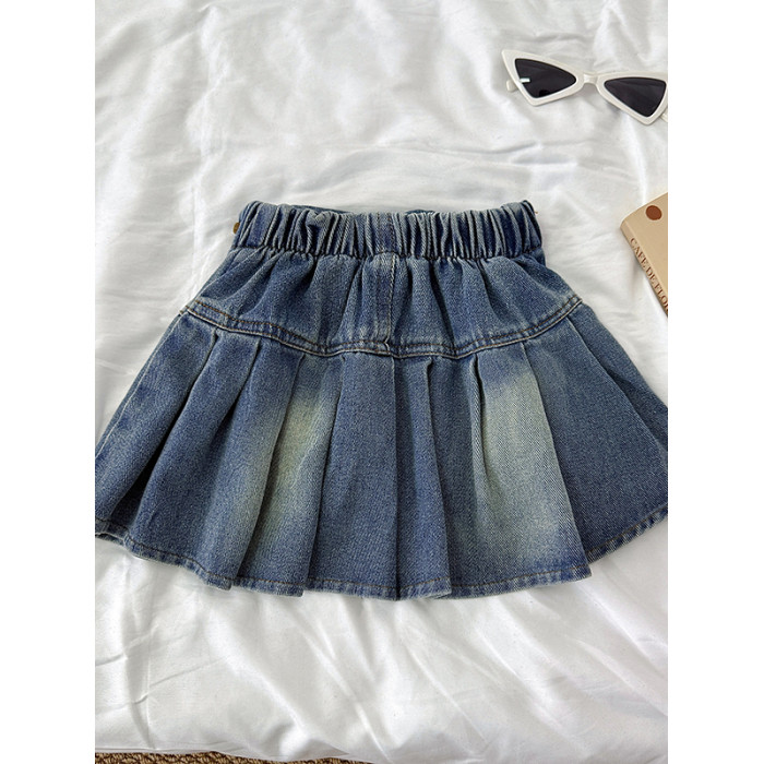 女童綁繩牛仔裙兒童松緊高腰百搭A字裙漸變雙綁帶半身裙百褶短裙