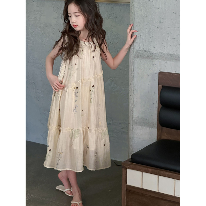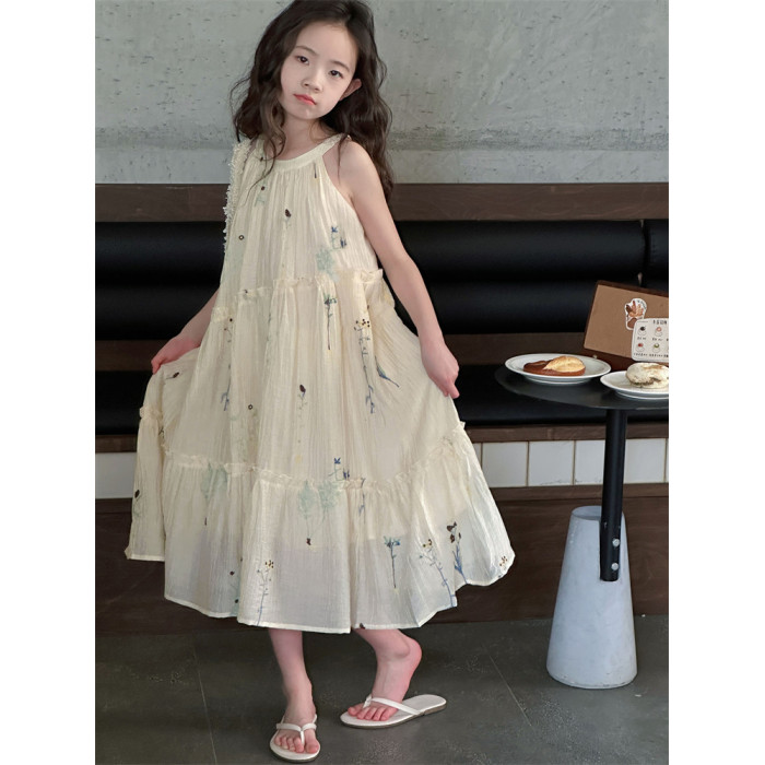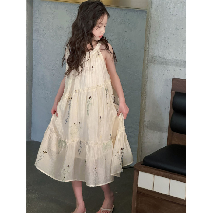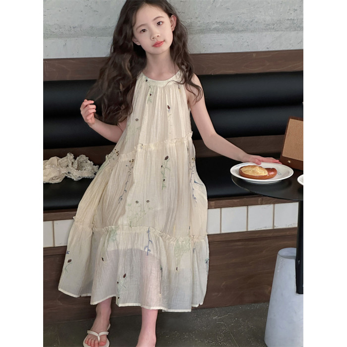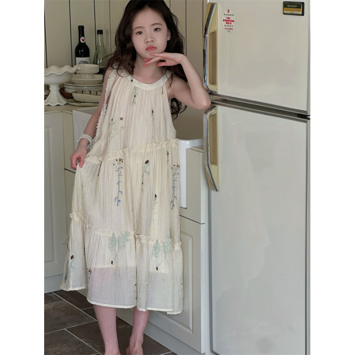 女童掛脖刺綉連衣裙2025新款女孩夏季雪紡吊帶裙度假風裙子中大童