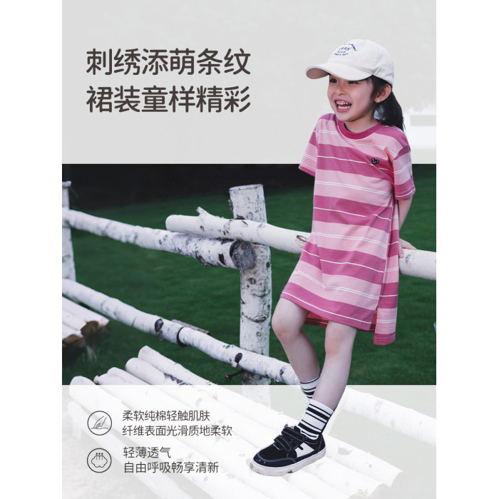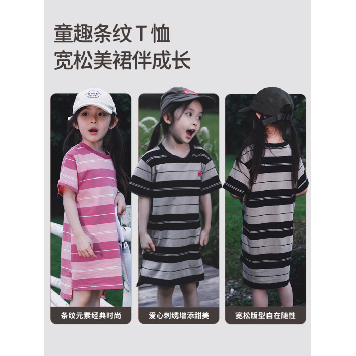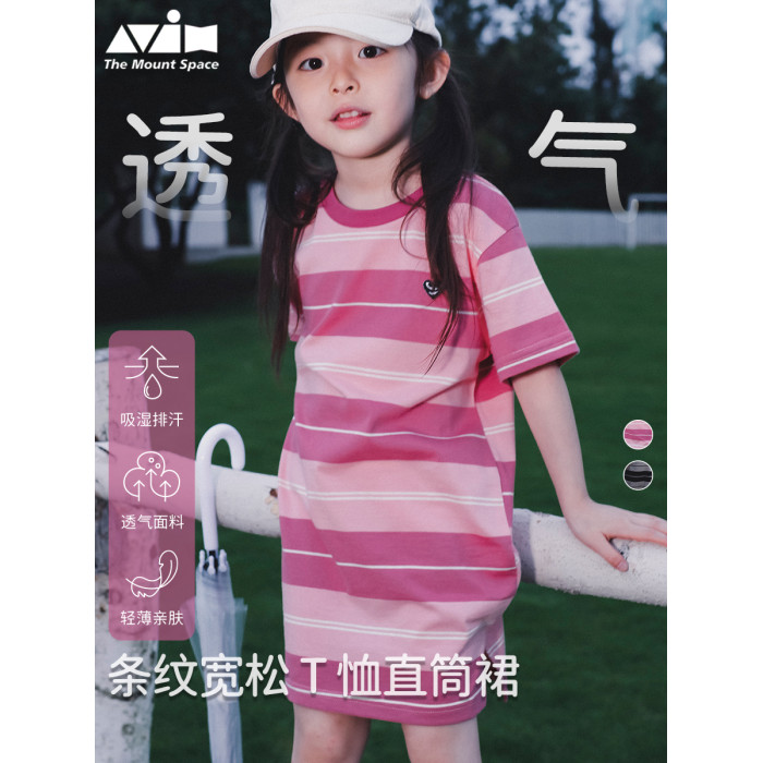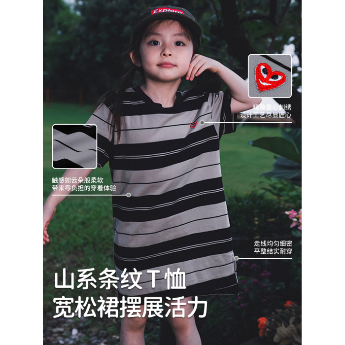 衫野跡畫山系戶外女童短袖t恤2025夏季新款兒童中長款條紋上衣潮