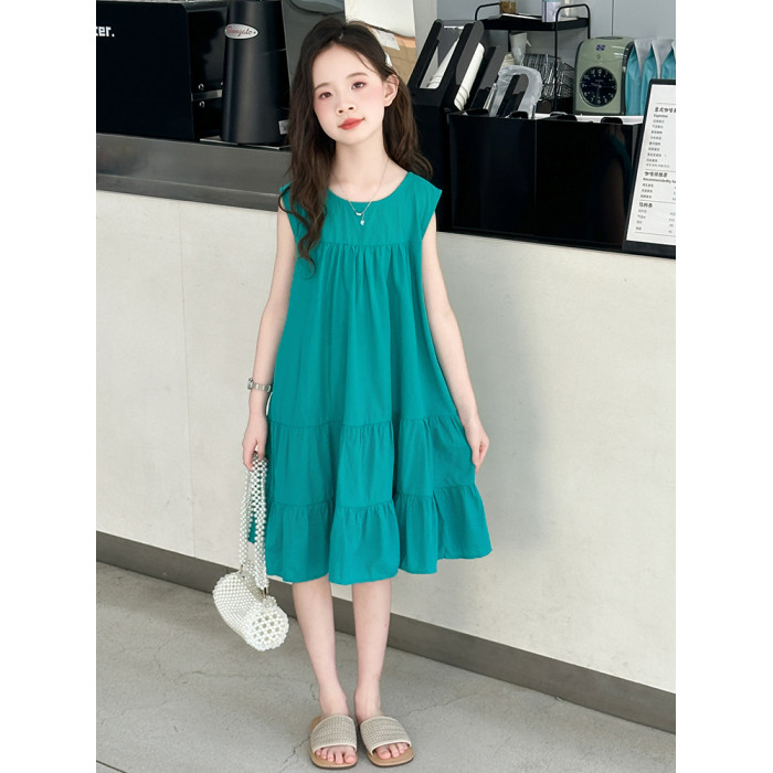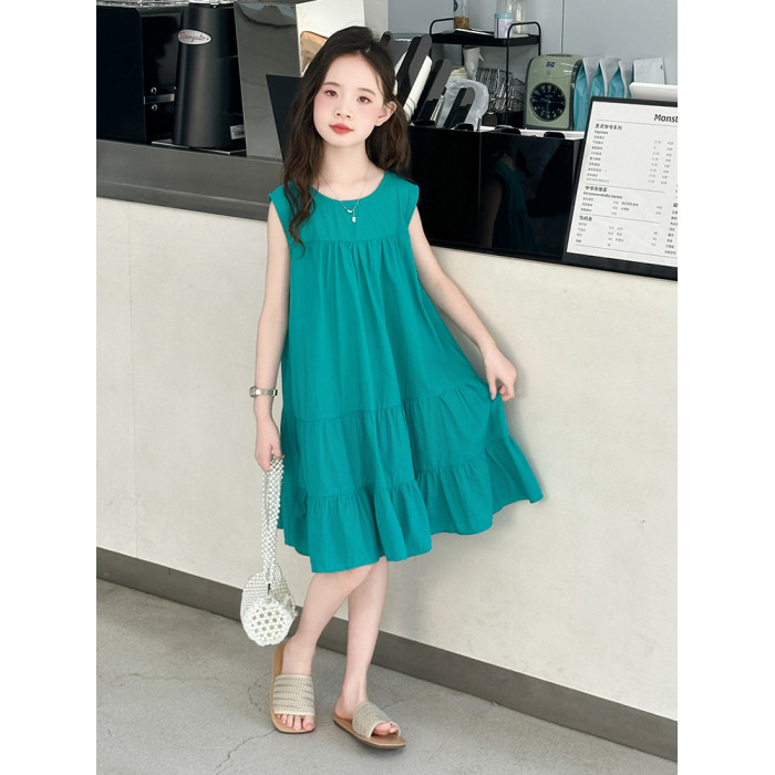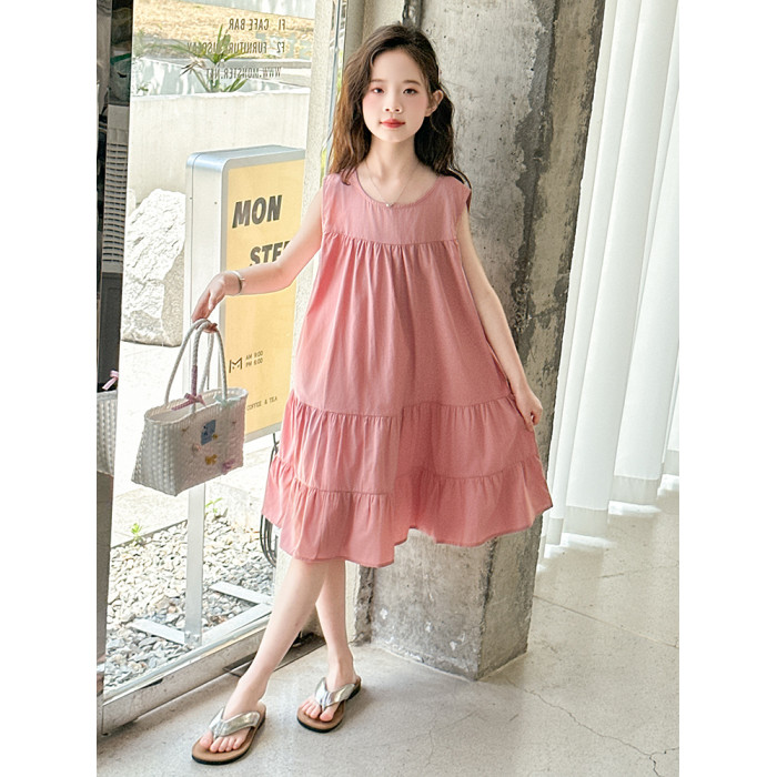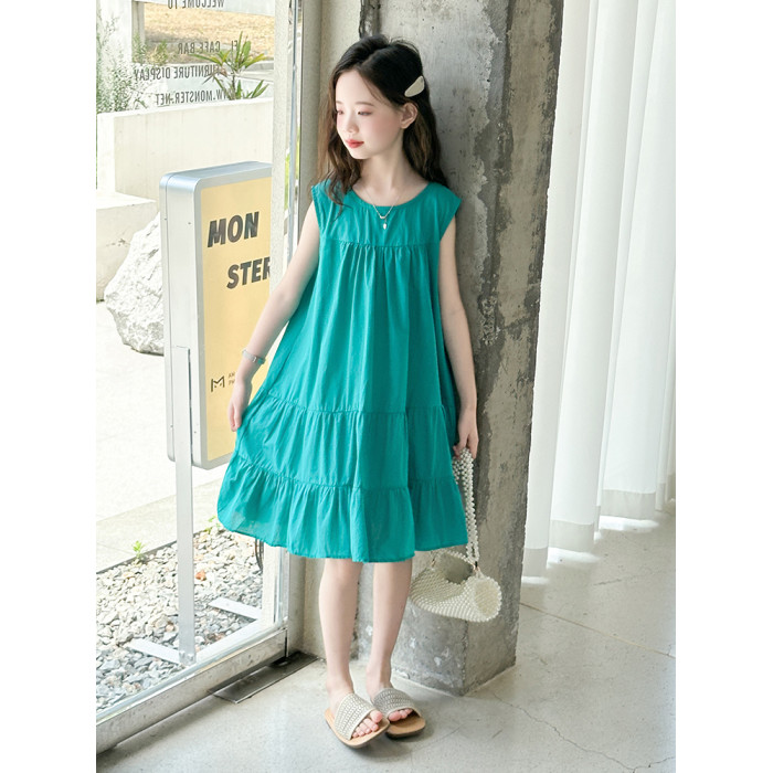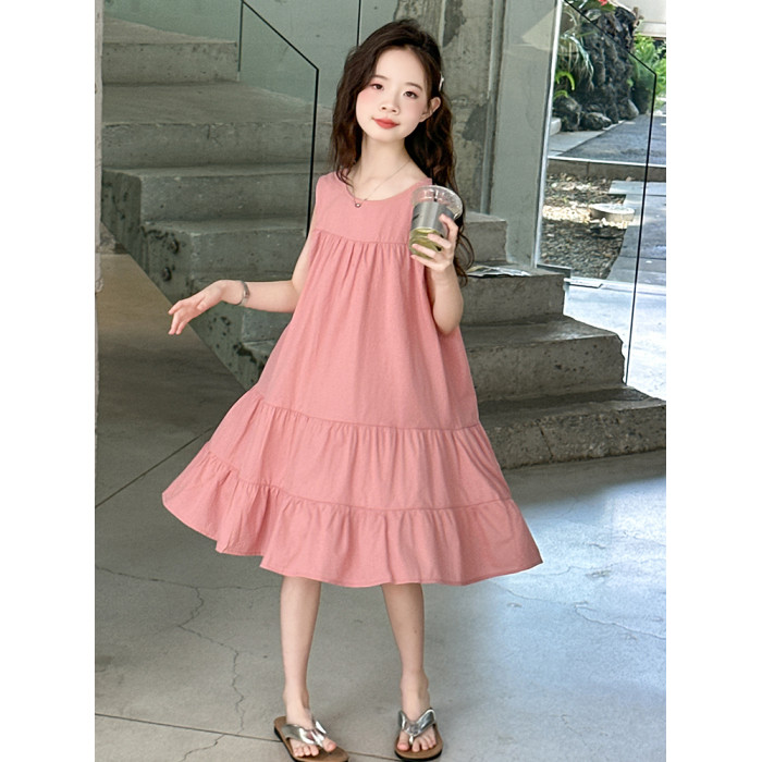女童連衣裙純棉單層薄款中裙寬松系釦無袖背心裙夏款涼快兒童裙子