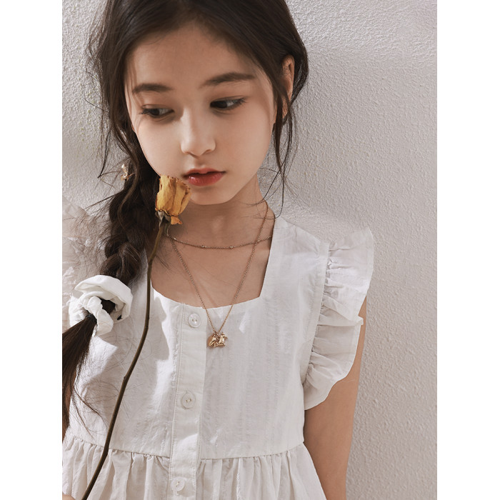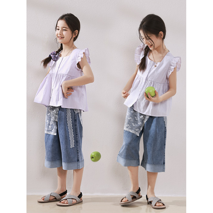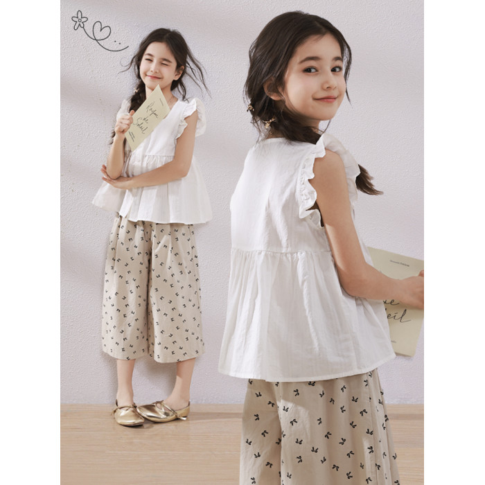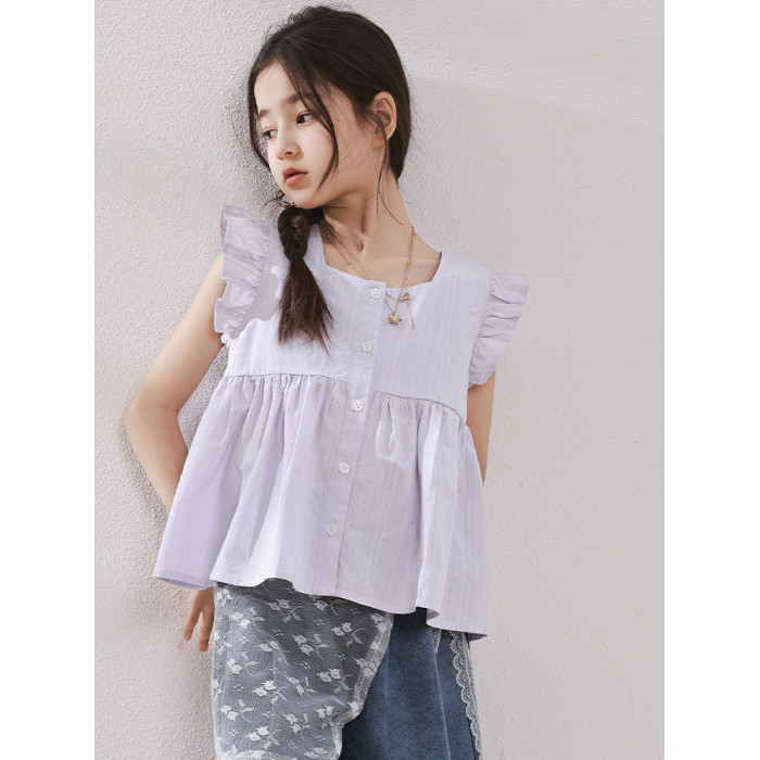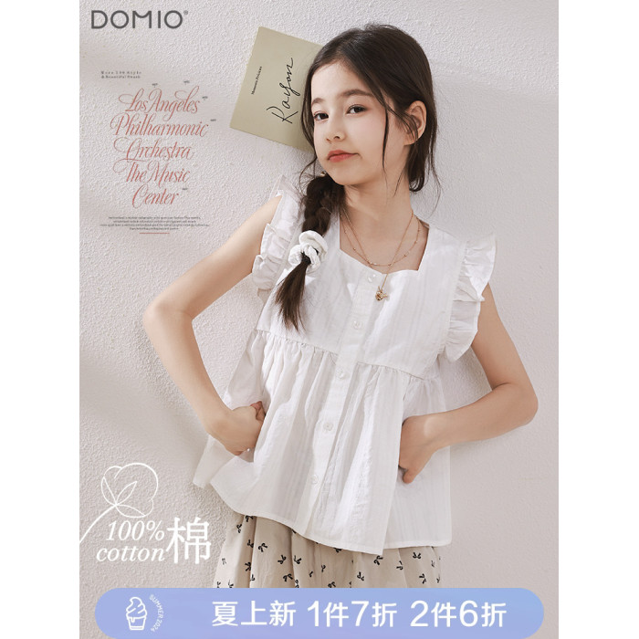 DOMIO女童襯衫純棉25夏季新品飛袖荷葉邊背心中大童無袖娃娃衫