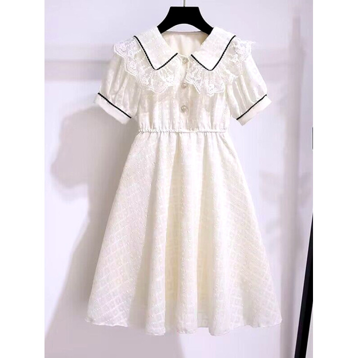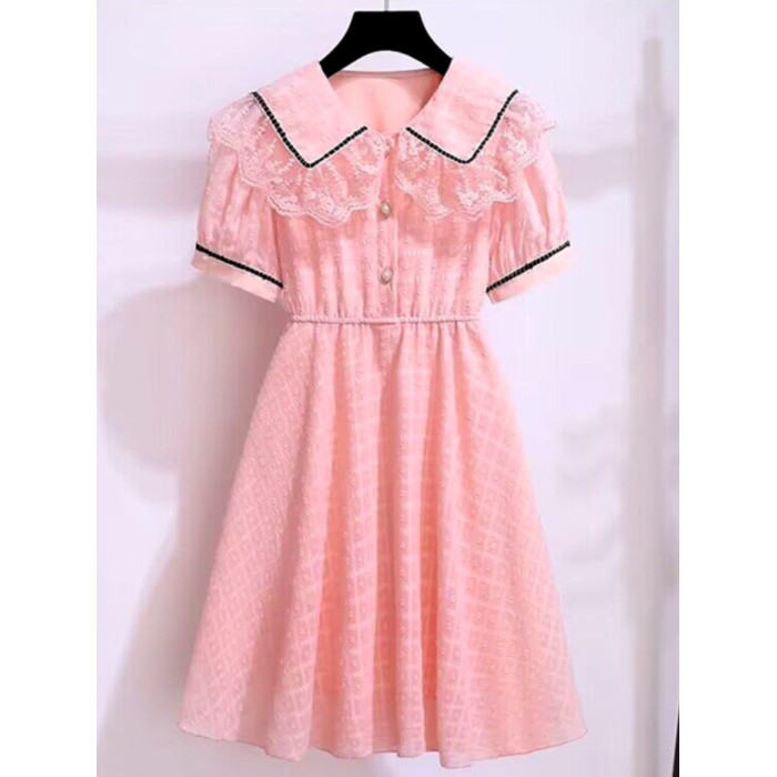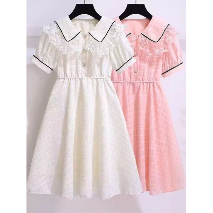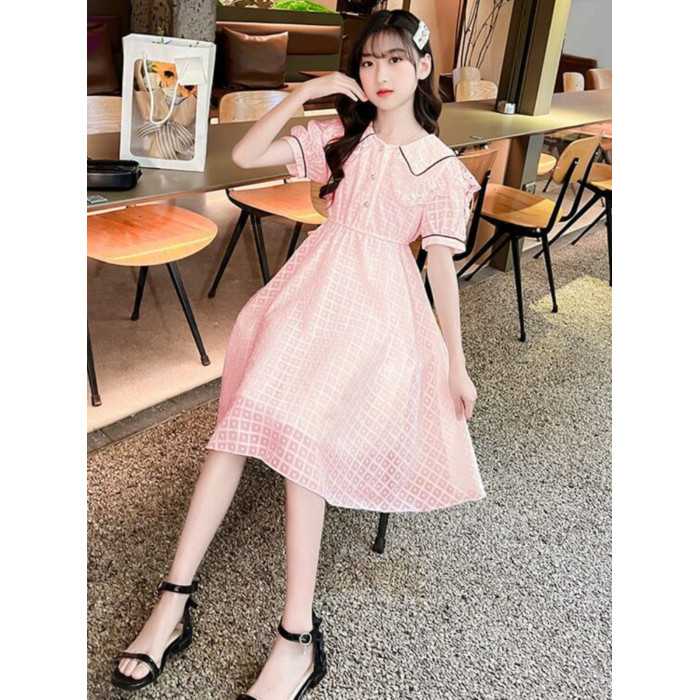 女童連衣裙短袖夏季薄款洋氣蕾絲娃娃領公主裙中大童雪紡裙子長裙