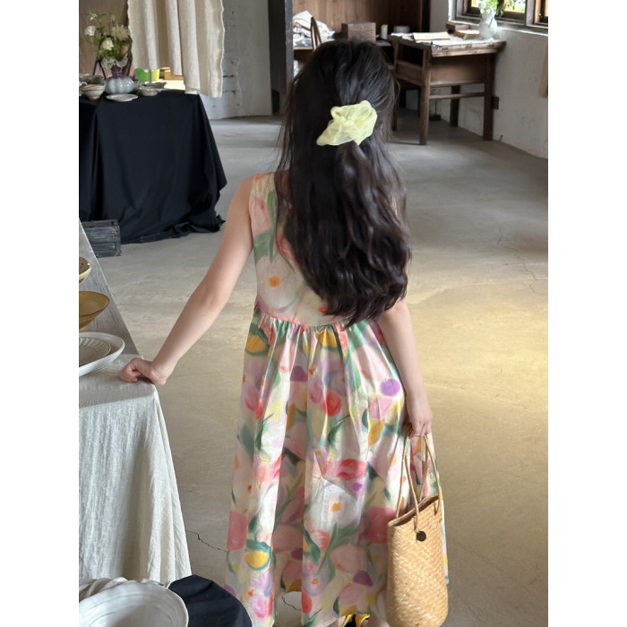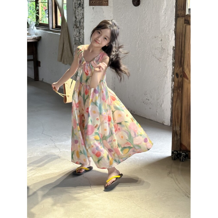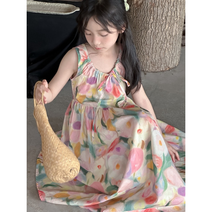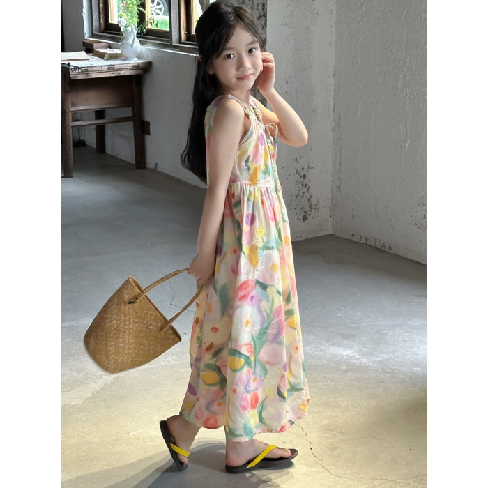 背心連衣裙2025夏中大童女童油畫風大花長款連衣裙夏季度假風長裙