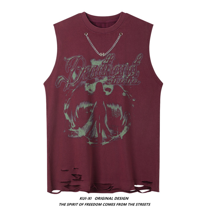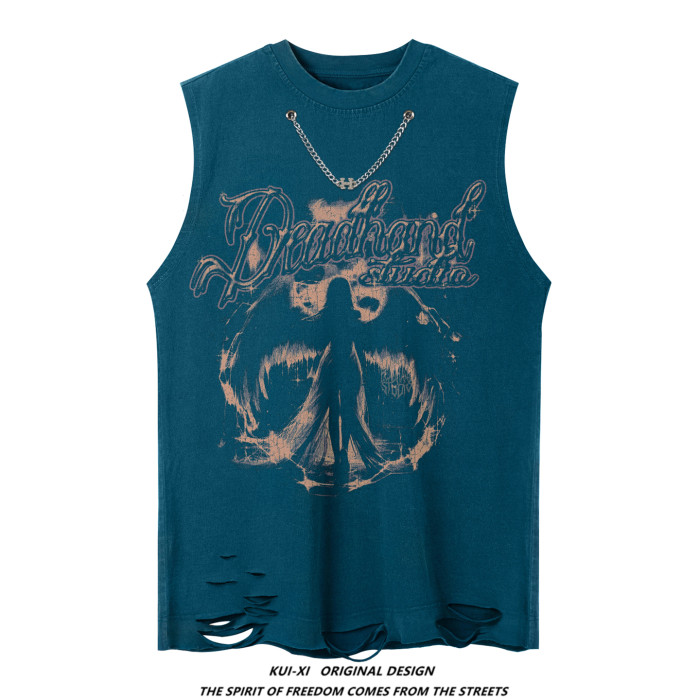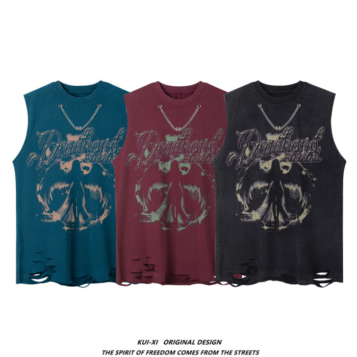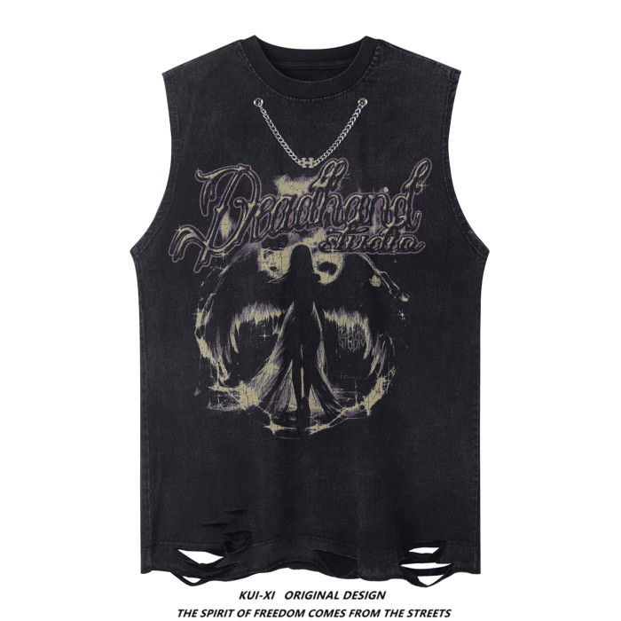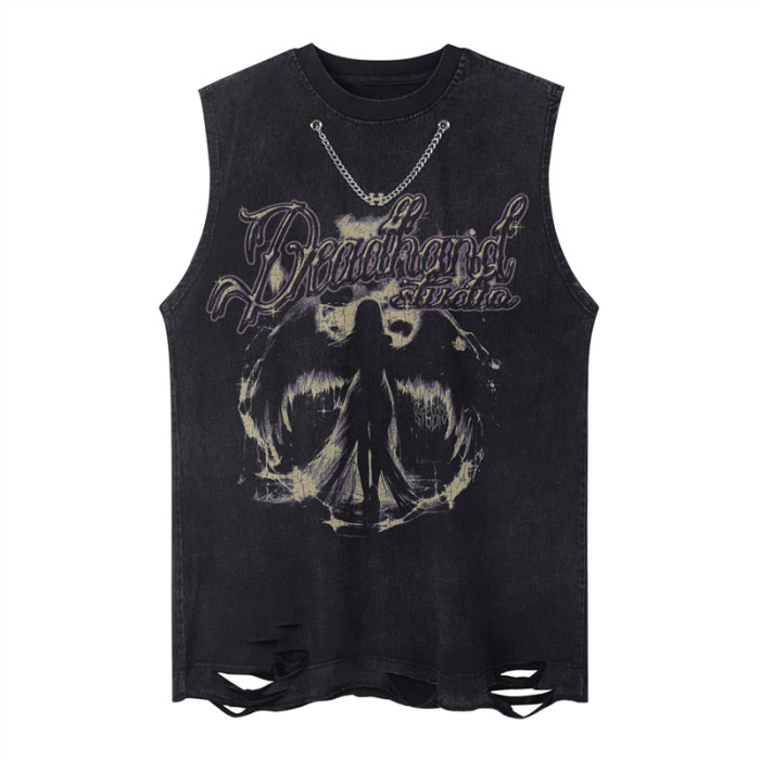 美式復古暗黑喪系小衆天使印花項鍊背心男女寬松嘻哈破洞無袖T恤