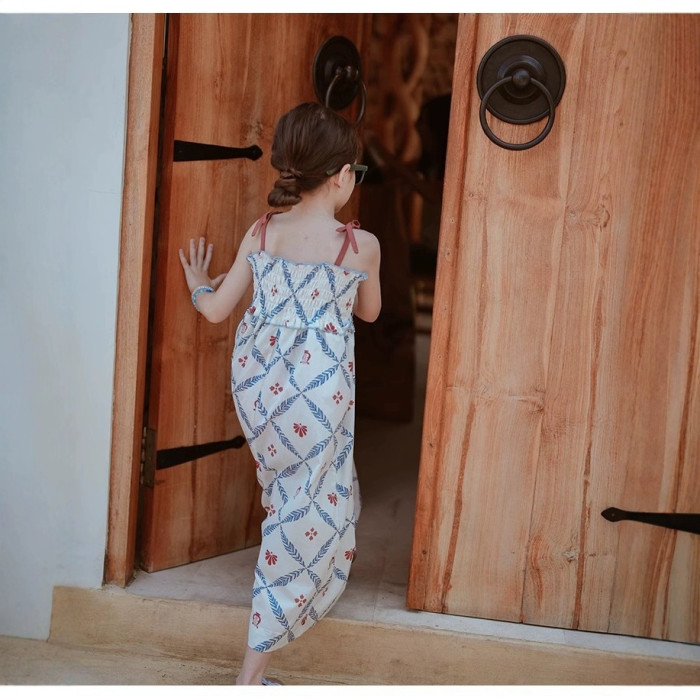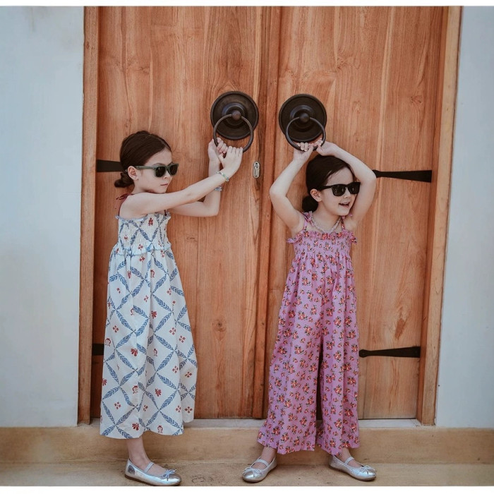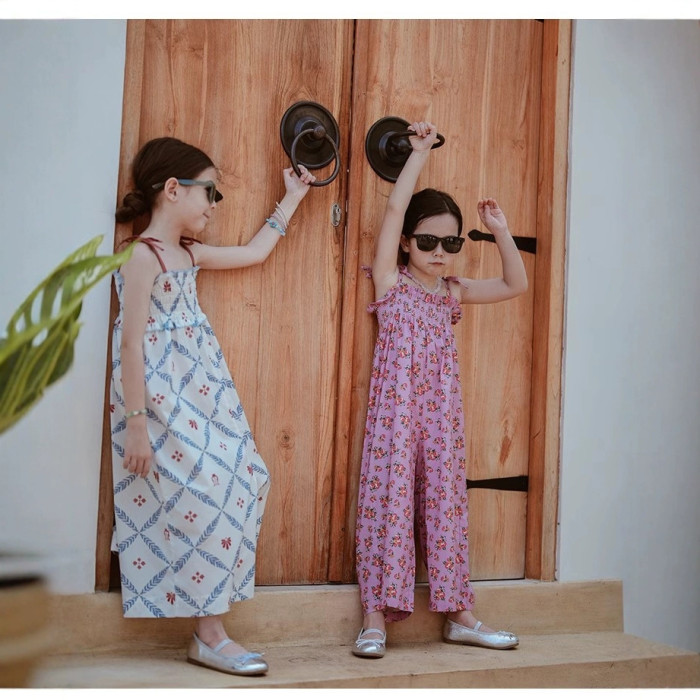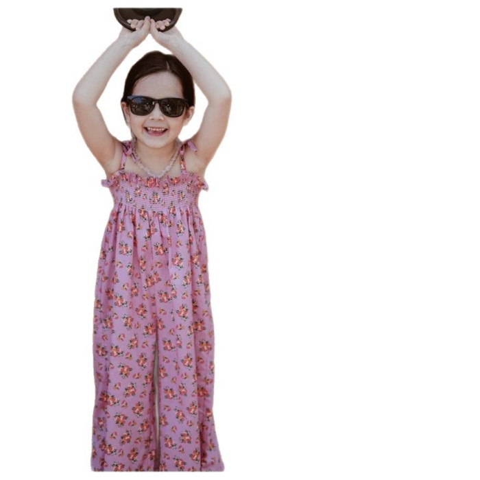韓國童裝女童復古顯白碎花吊帶連體褲夏季連身褲吊帶褲寬松濶腿褲