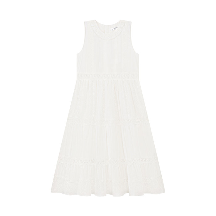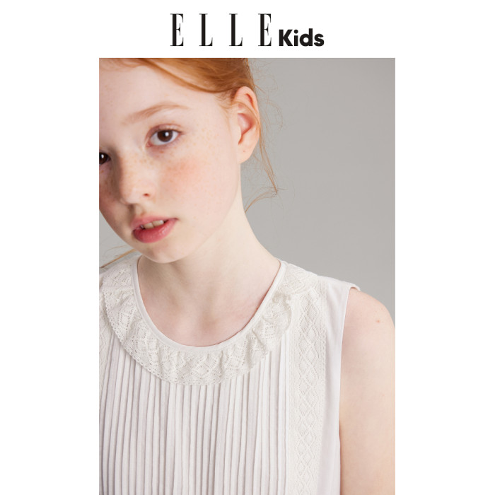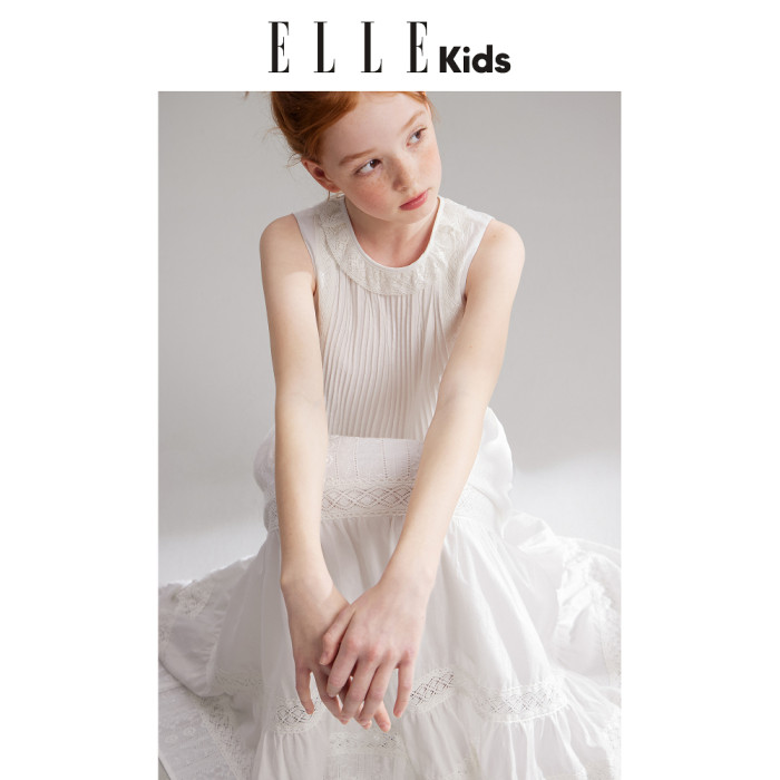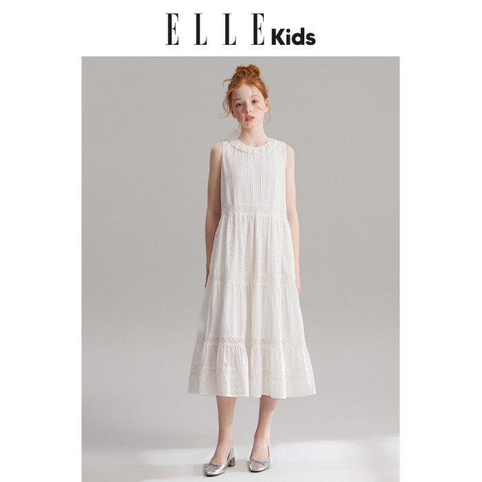 ELLEkids童裝 花邊拼接無袖連衣裙女童夏季新款法式度假綉花裙子