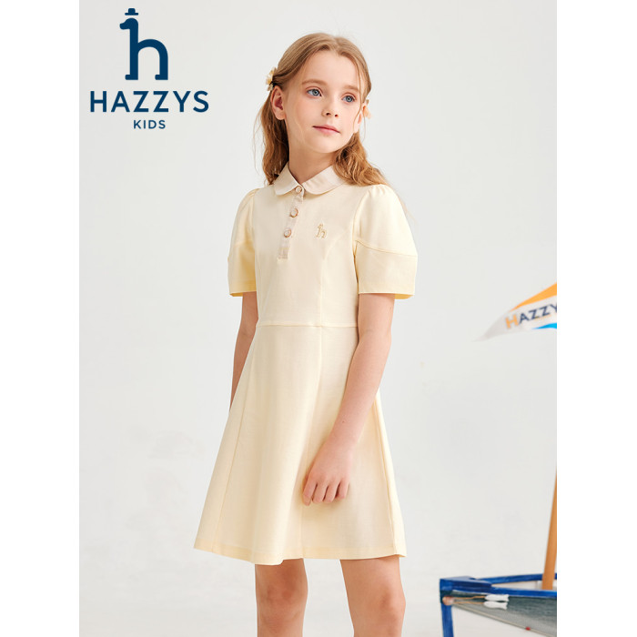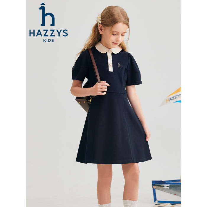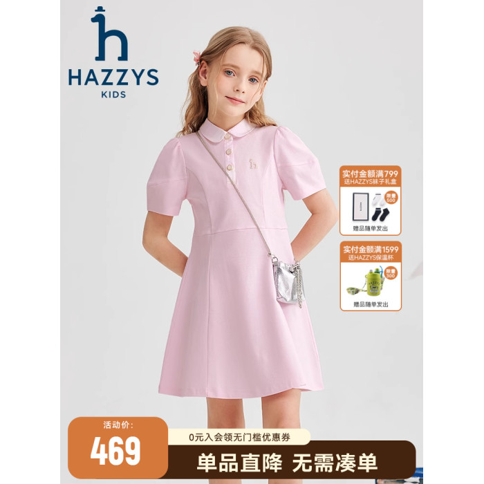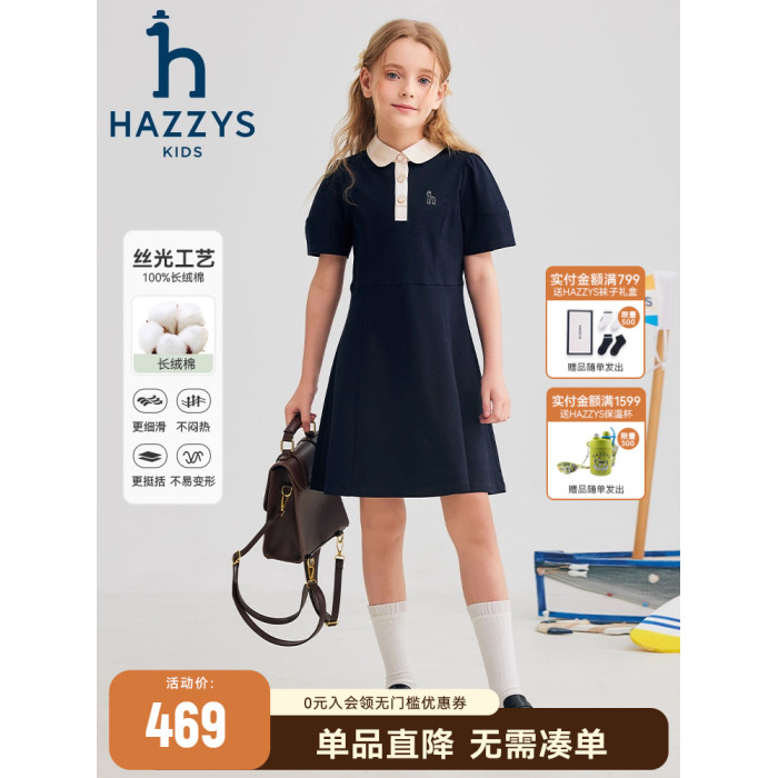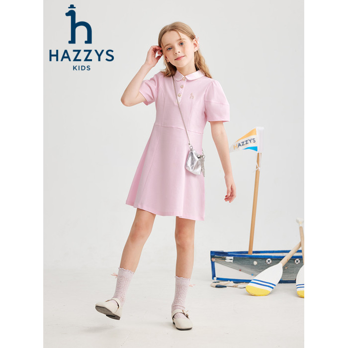 hazzys哈吉斯童裝女童連衣裙2025夏新絲光長絨棉泡泡袖甜美POLO裙