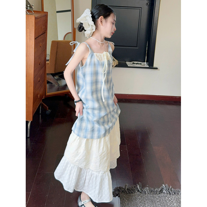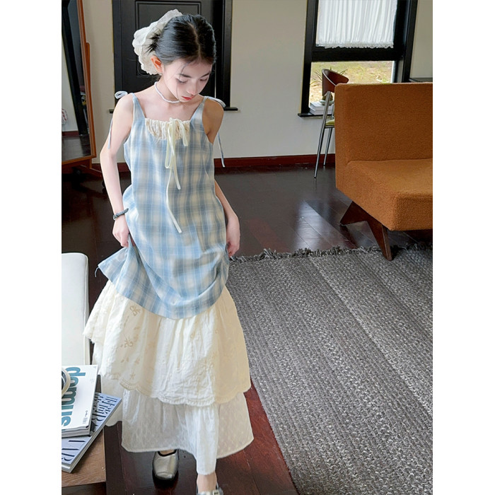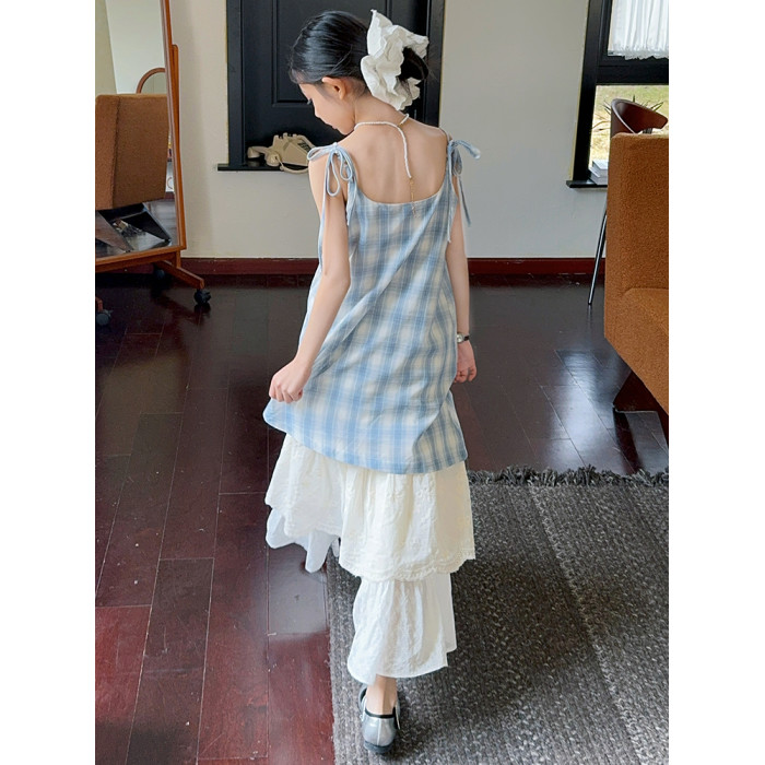 女童藍色格子吊帶裙連衣裙2025新款夏季假兩件海邊穿搭度假長裙子