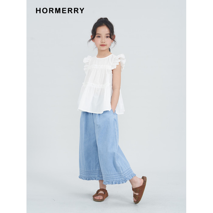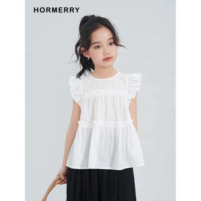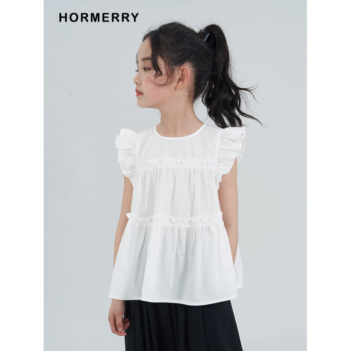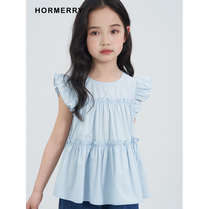 赫米童裝 2025夏季新款女童小飛袖荷葉擺娃娃衫純棉襯衫背心上衣