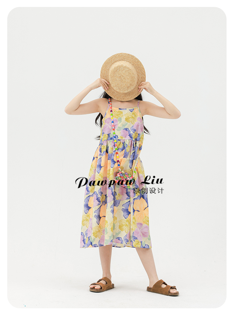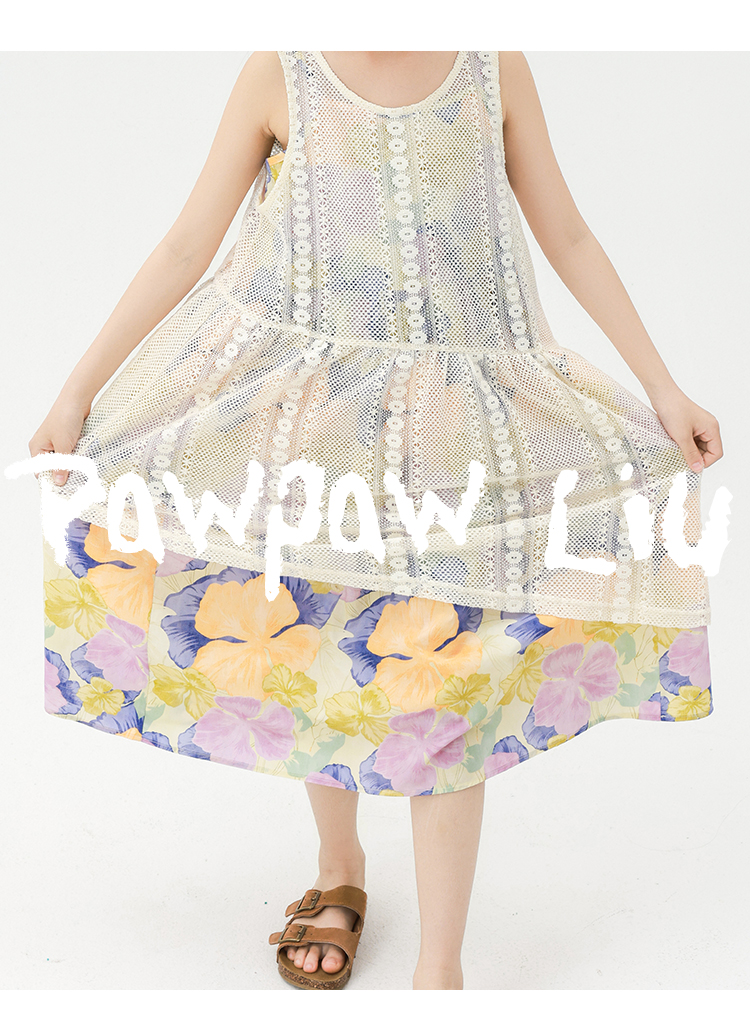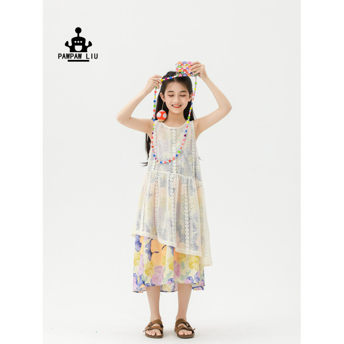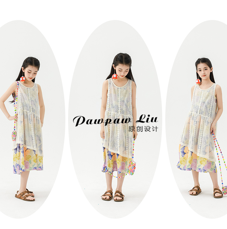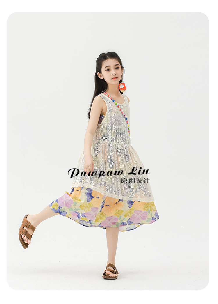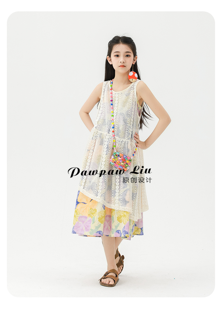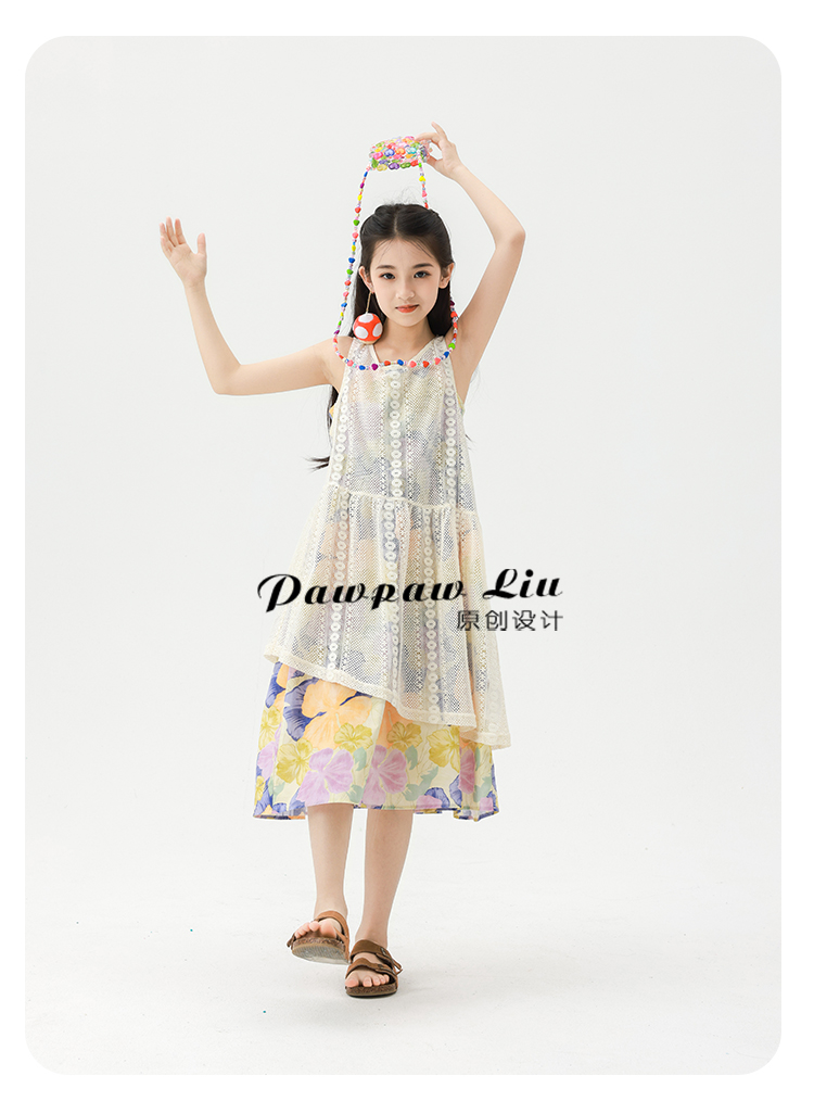 Pawpaw Liu原創設計女童夏套裝2025新款兒童碎花吊帶裙+蕾絲罩衫