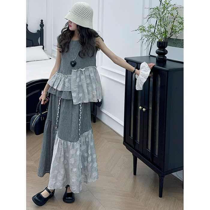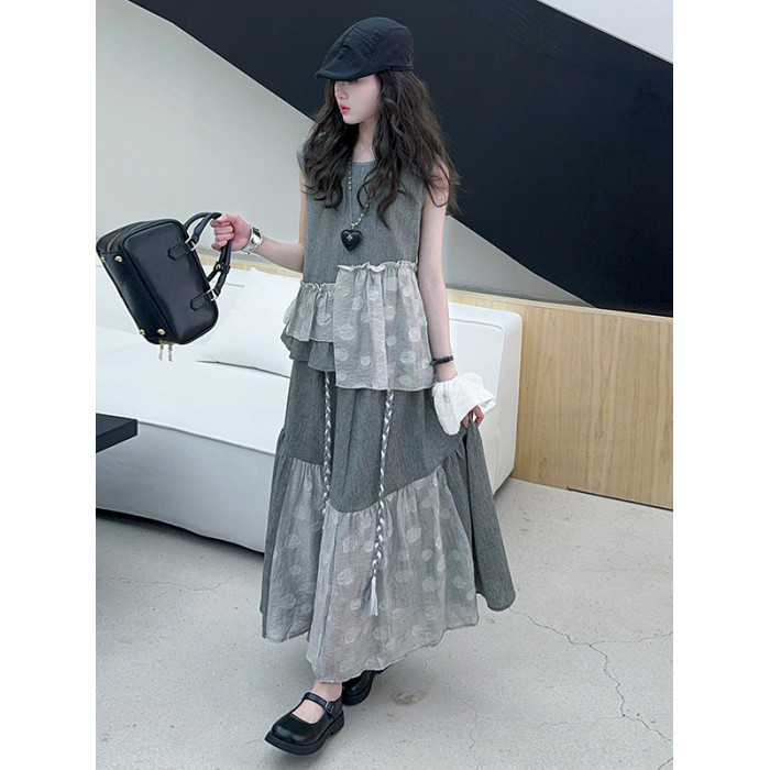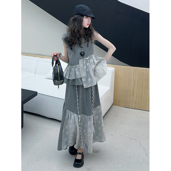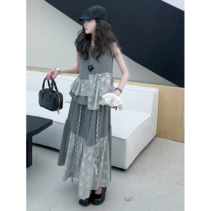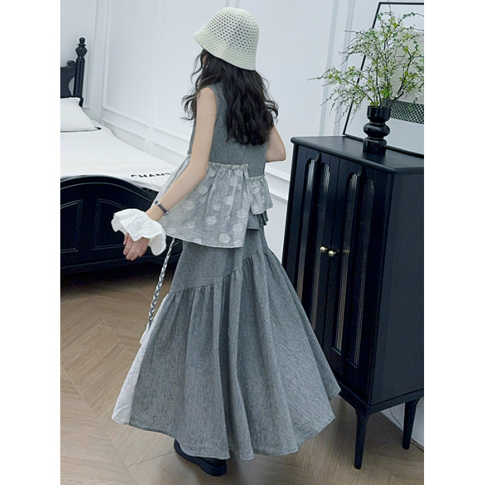 女童裙子夏款2025年兒童夏裝設計感套裙拼接無袖上衣半身裙兩件套