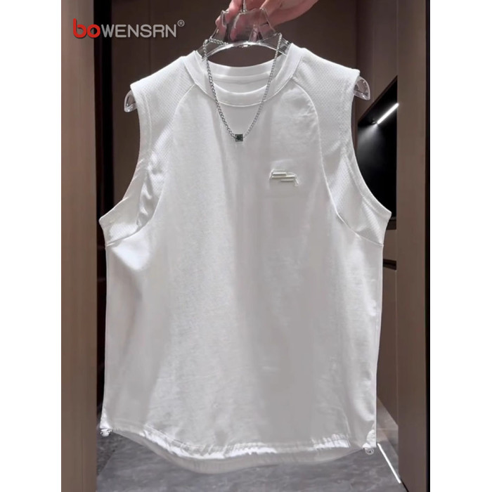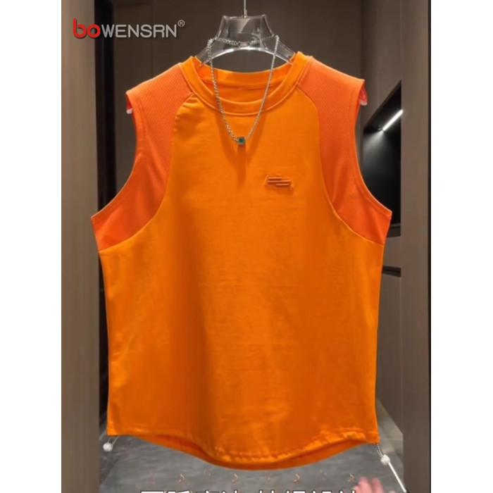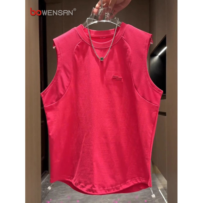 拼接網孔無袖t恤男士背心2025新款夏季潮流美式寬松透氣上衣男款