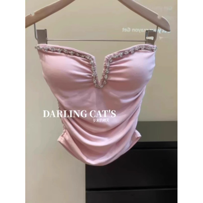 一慄莎子~韓系名媛風重工鑲鑽褶皺抹胸背心女純欲風修身內搭上衣
