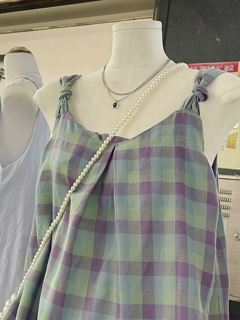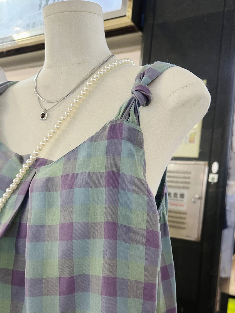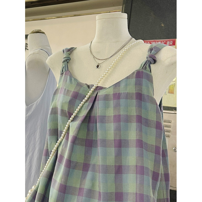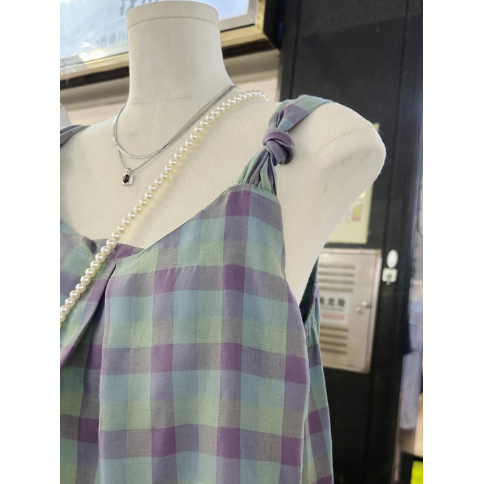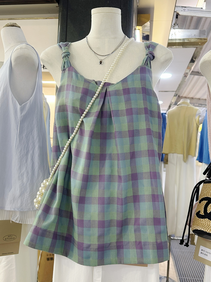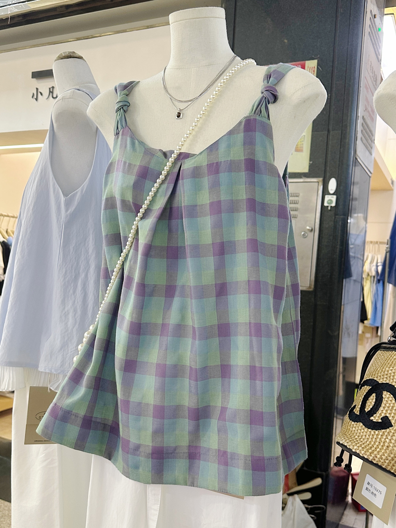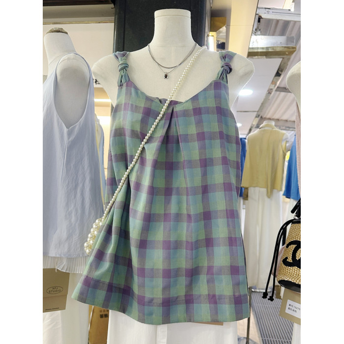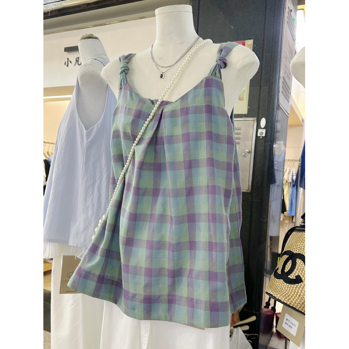 一慄莎子~設計感格子掛脖吊帶背心女韓版小衆寬松別致無袖上衣