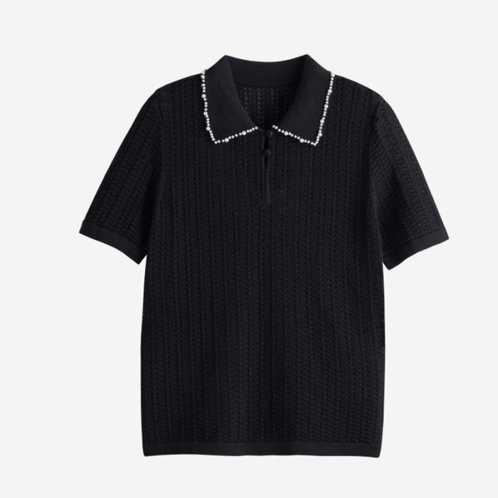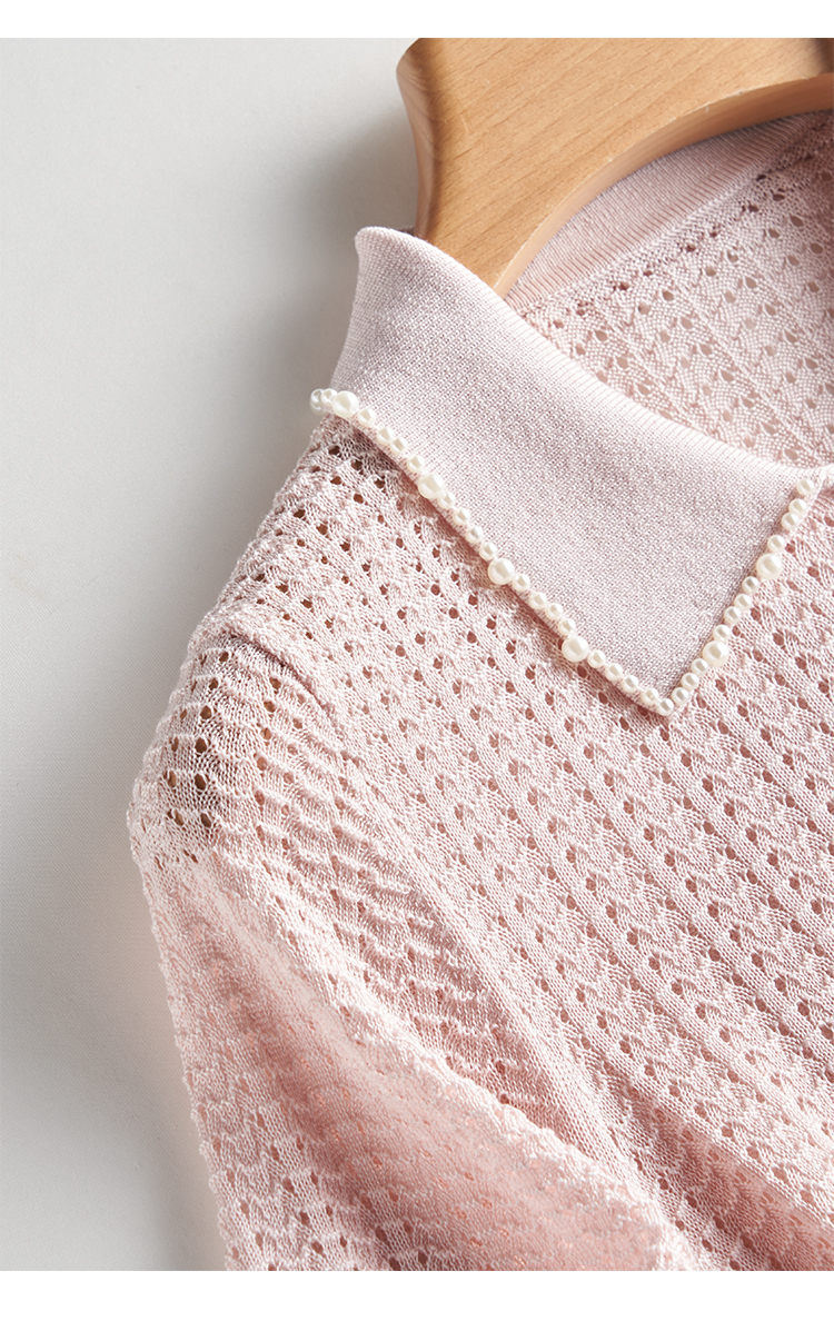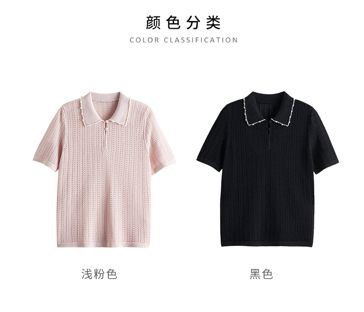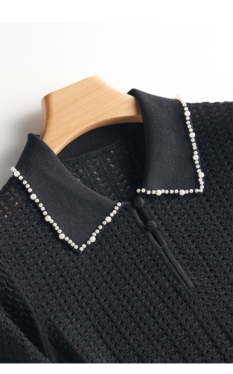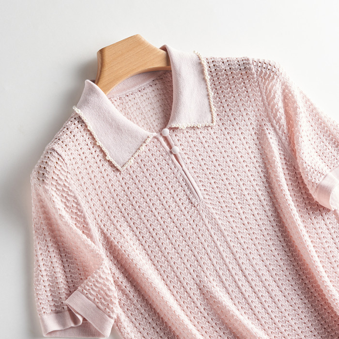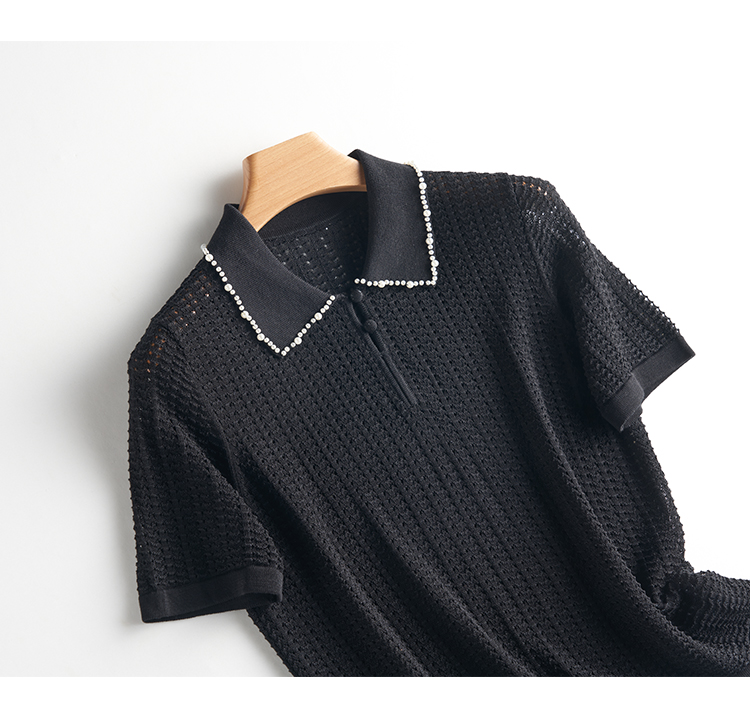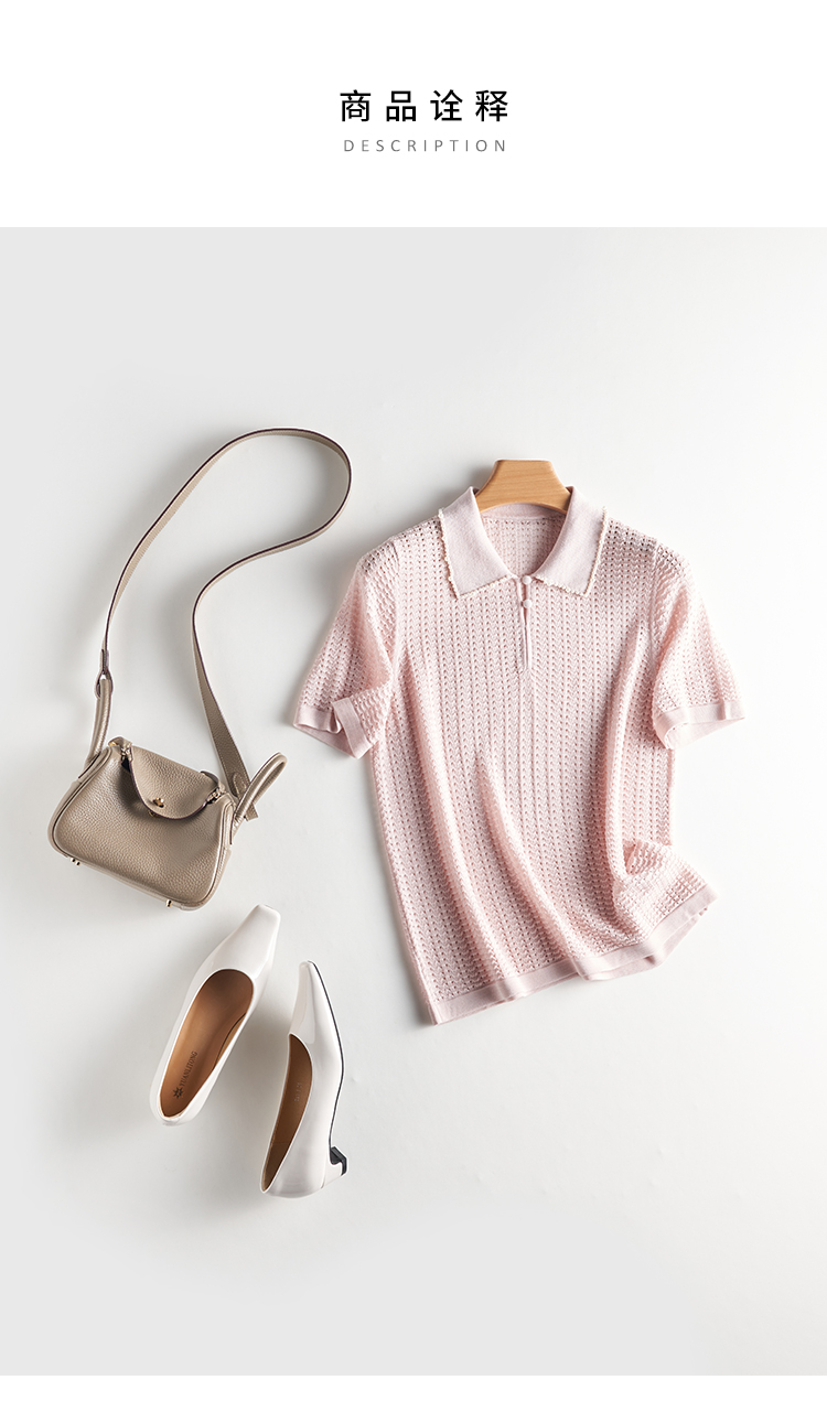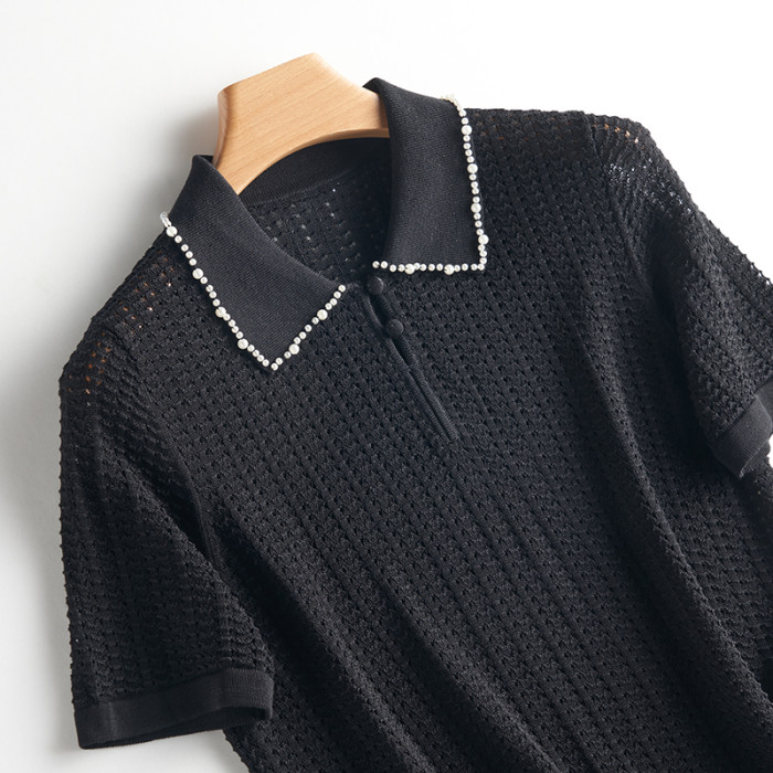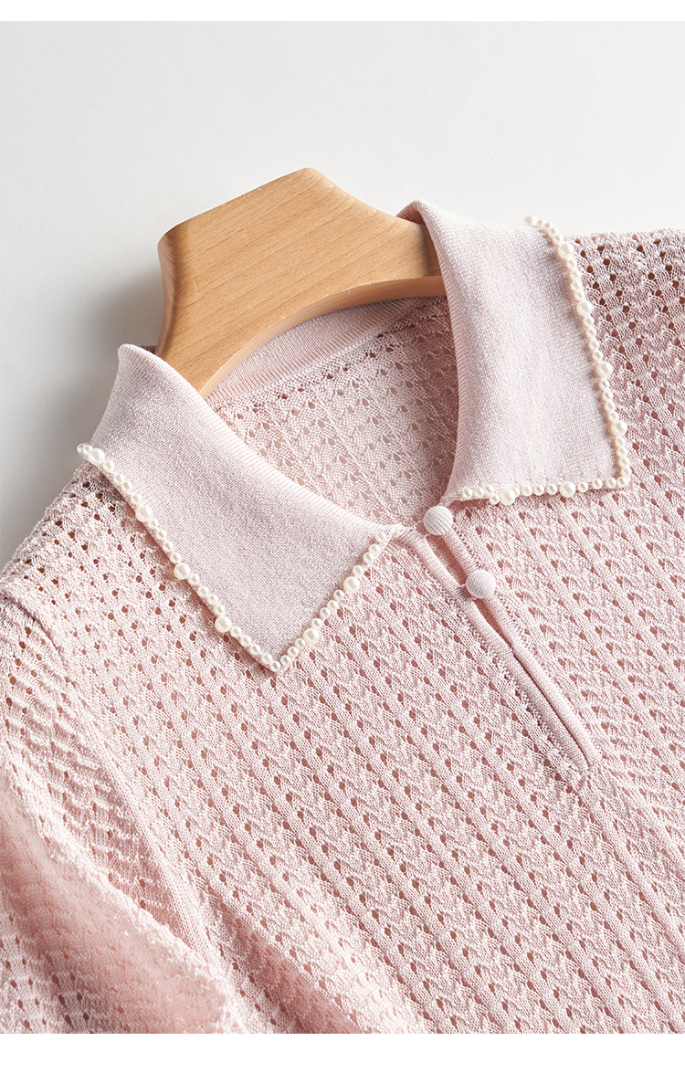 輕奢小香風~桑蠶絲短袖女polo衫珍珠翻領萊賽爾天絲寬松針織衫薄