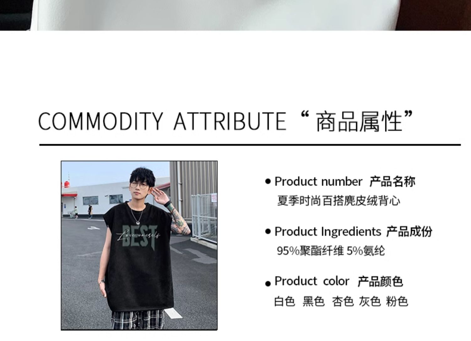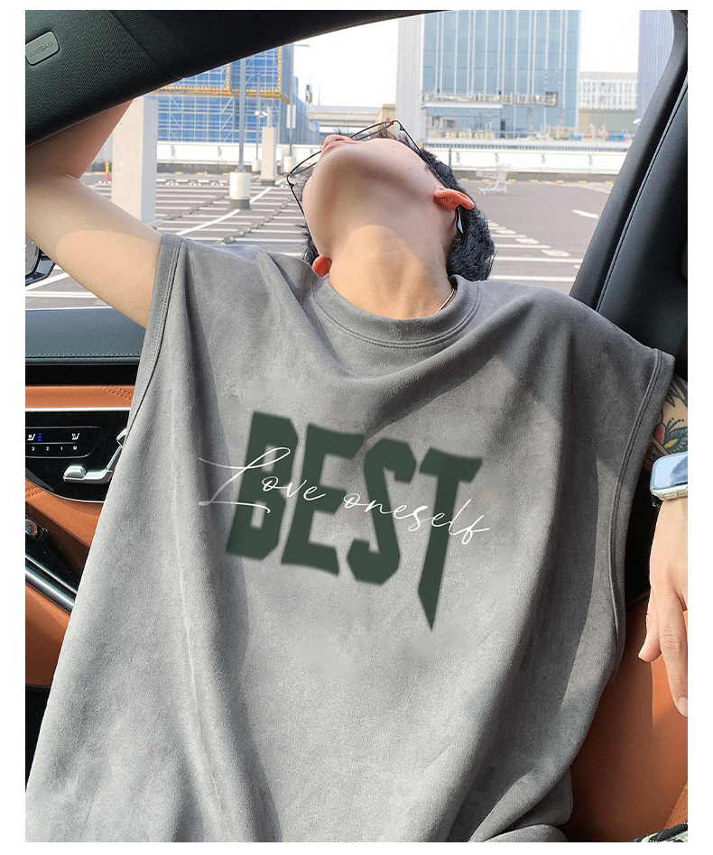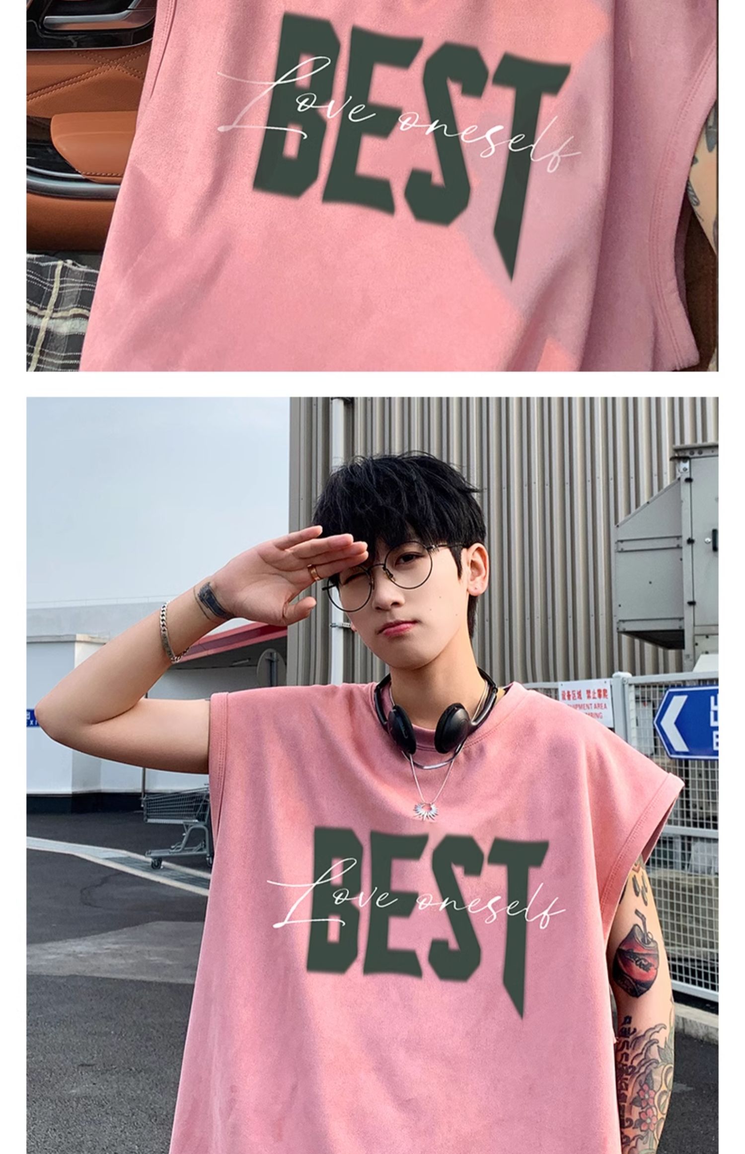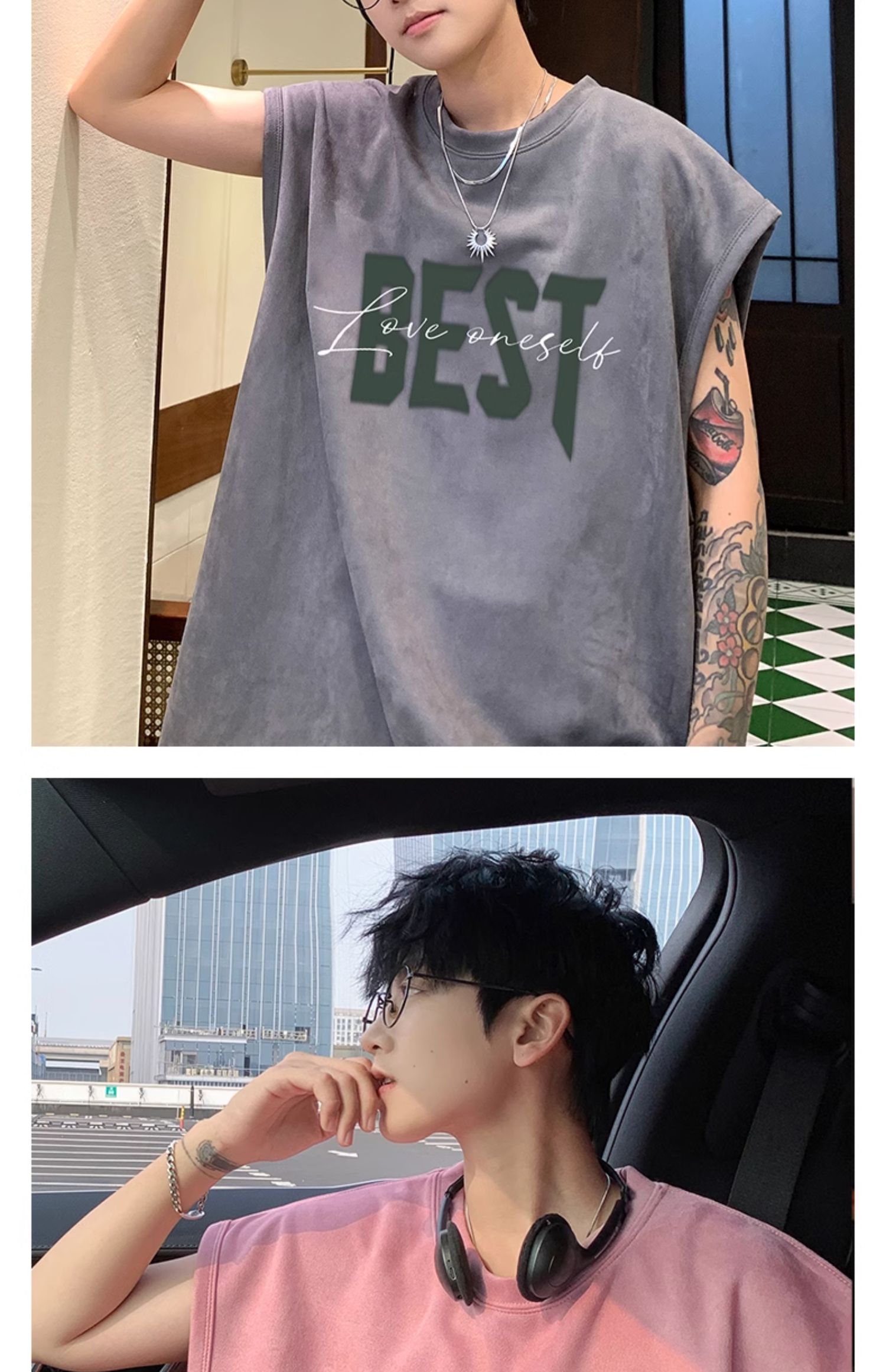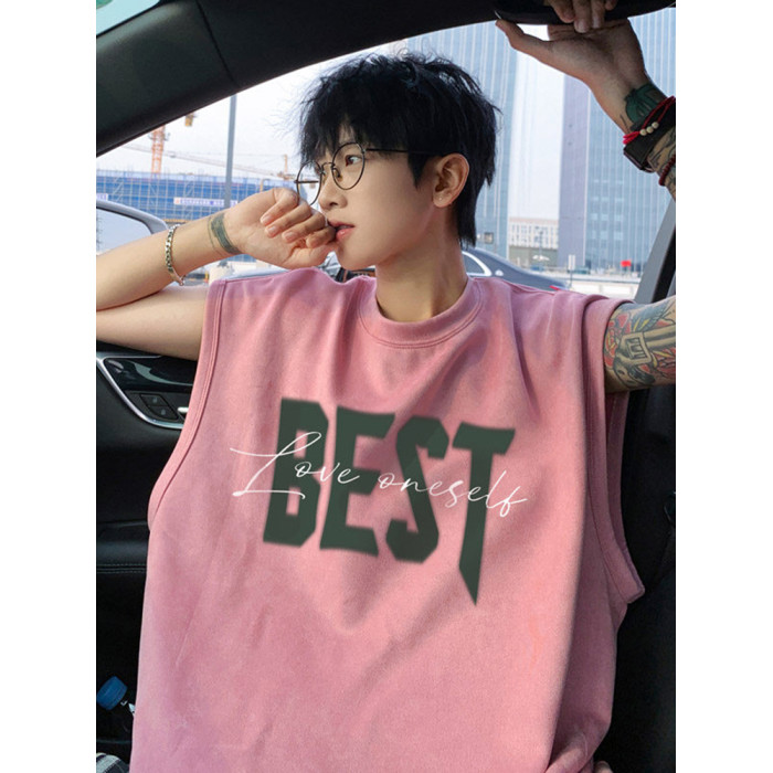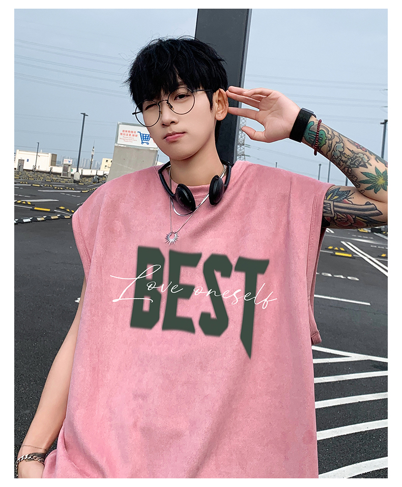 粉色重磅麂皮背心男款夏季潮流潮牌寬松大碼無袖t恤男生坎肩短袖