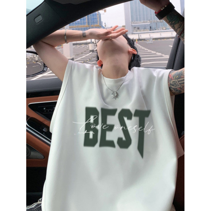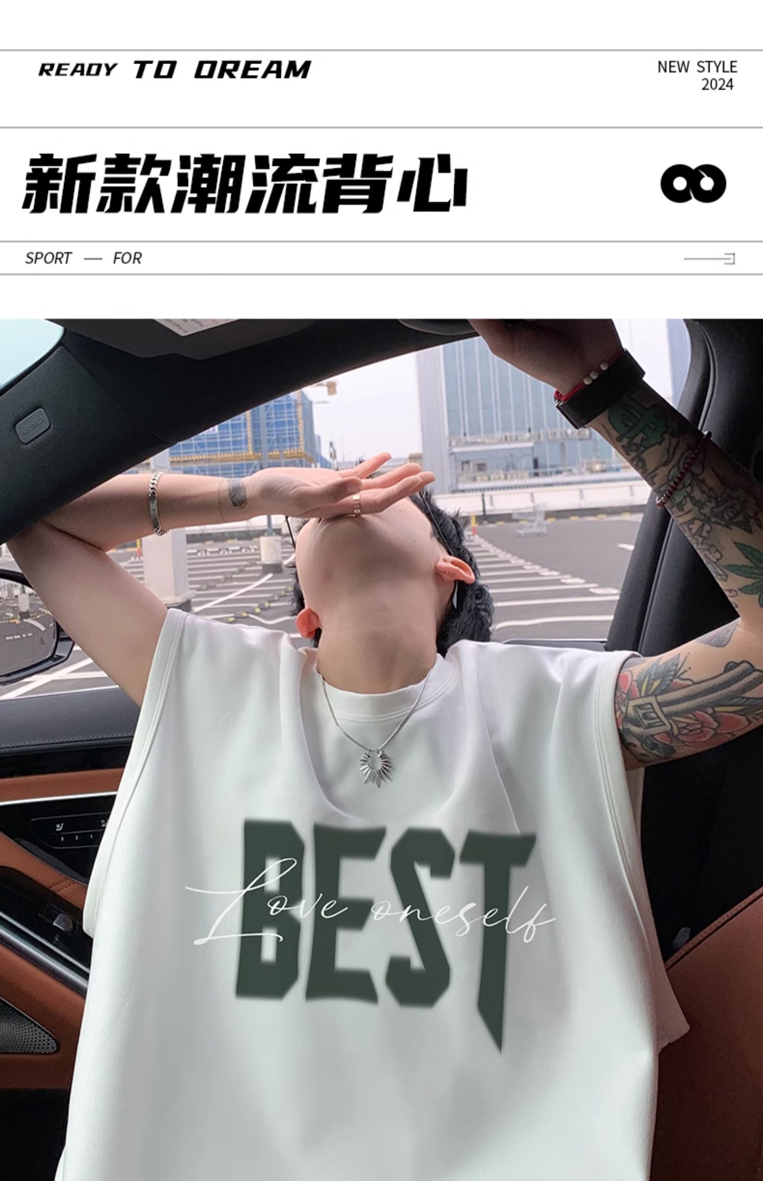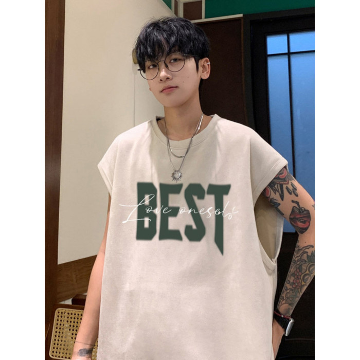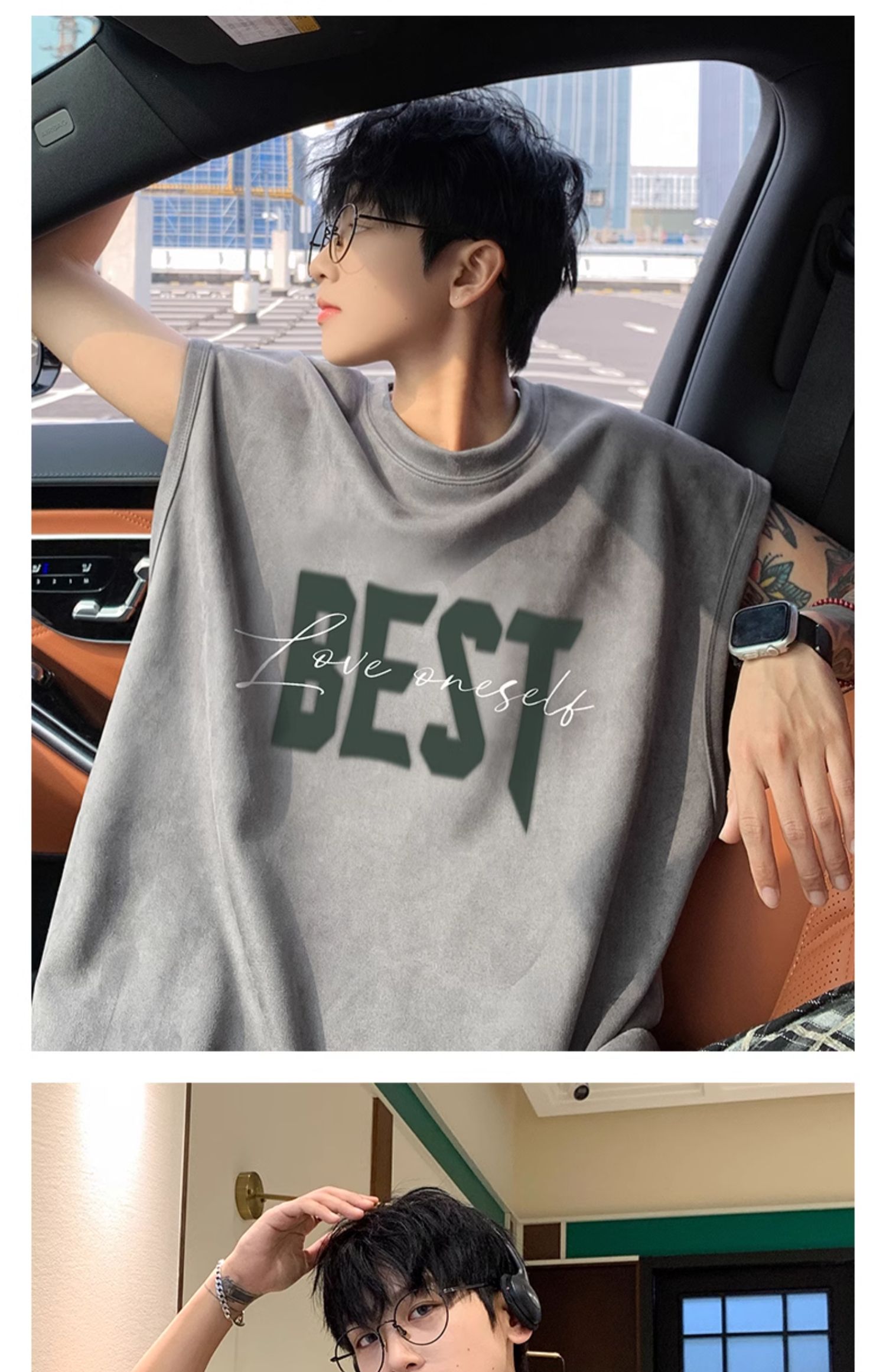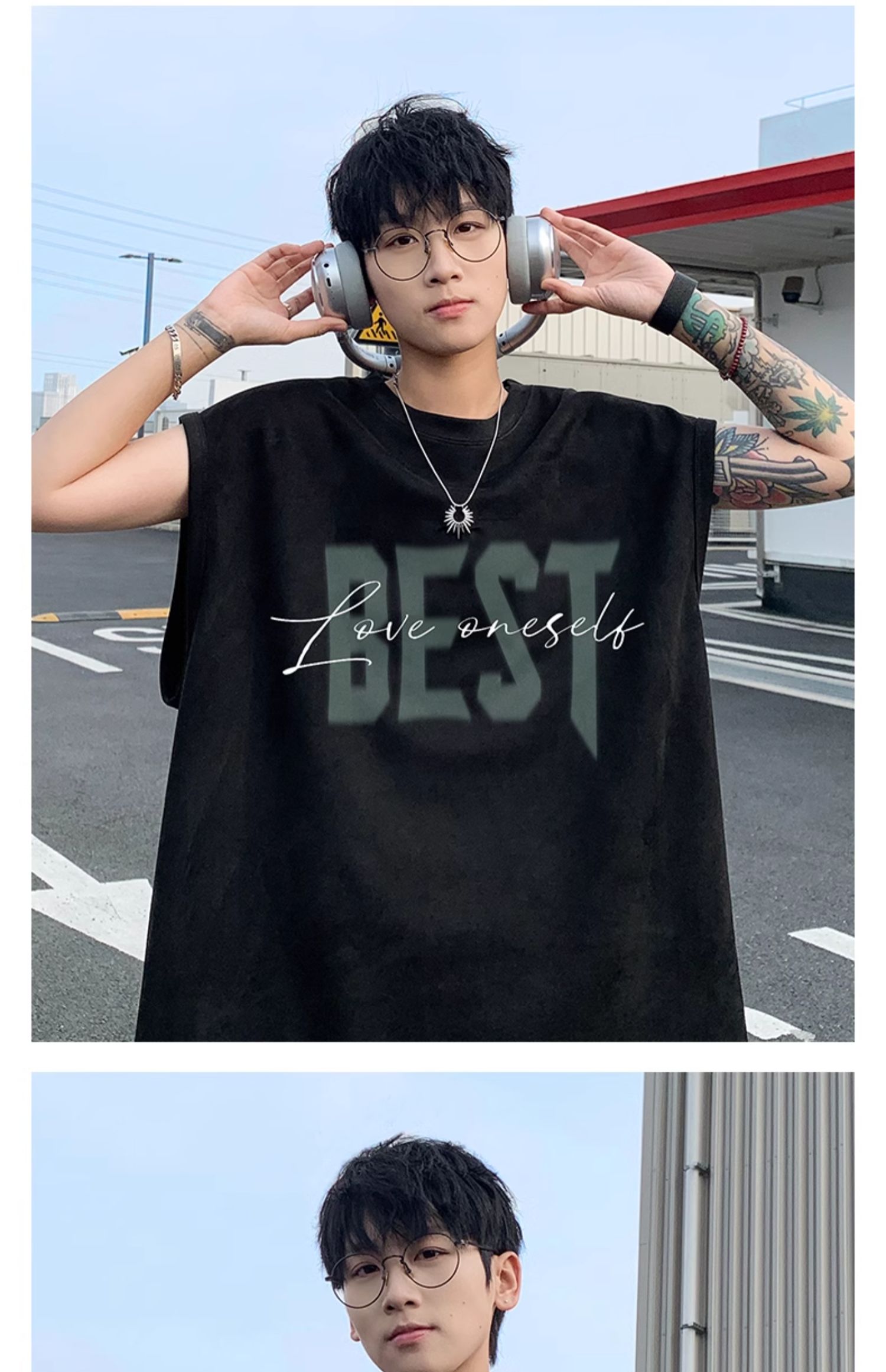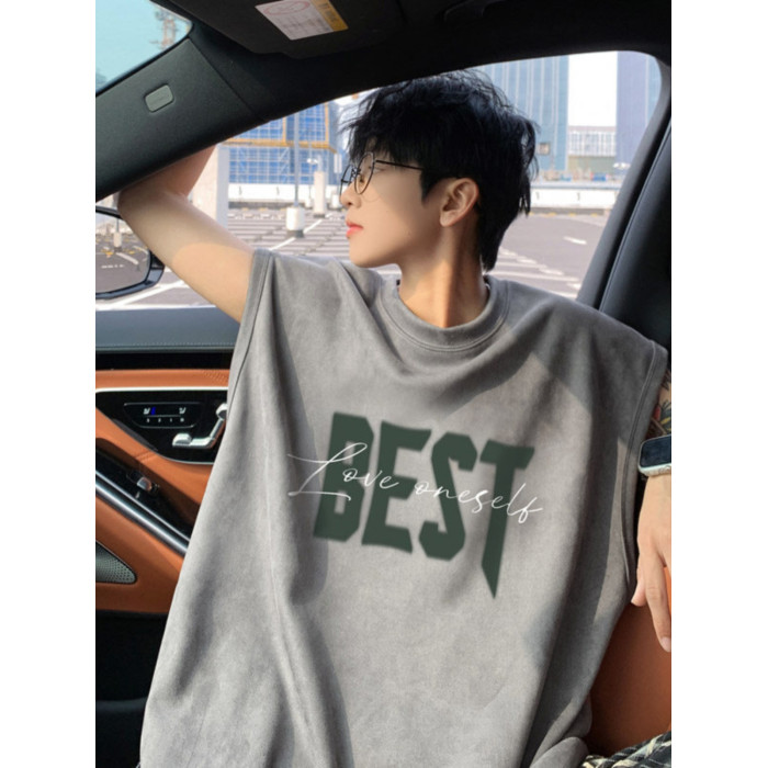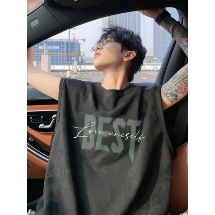 粉色重磅麂皮背心男款夏季潮流潮牌寬松大碼無袖t恤男生坎肩短袖
