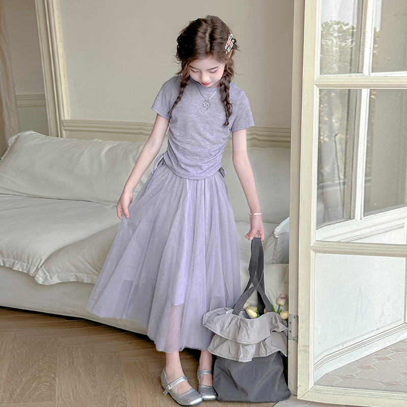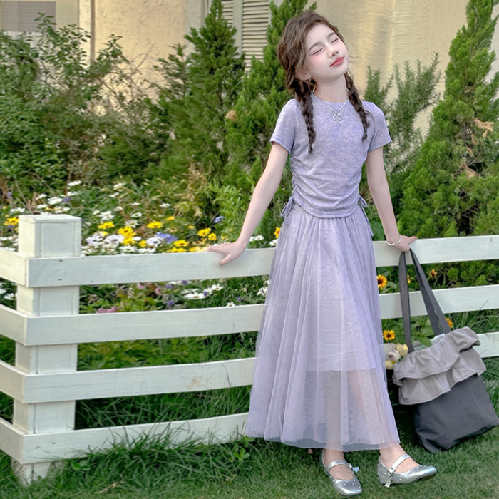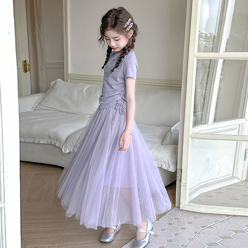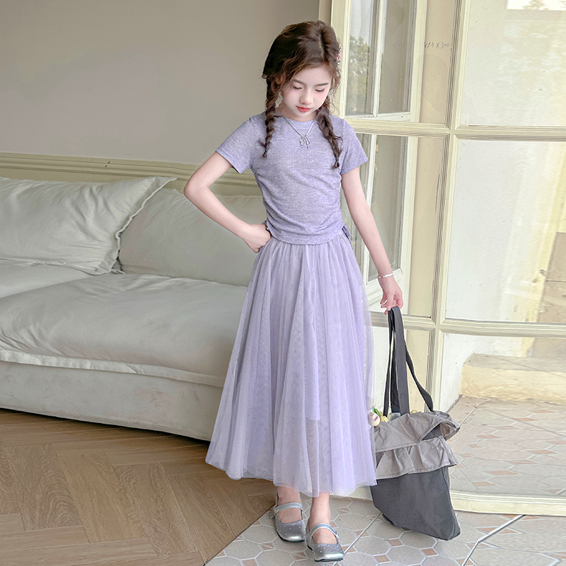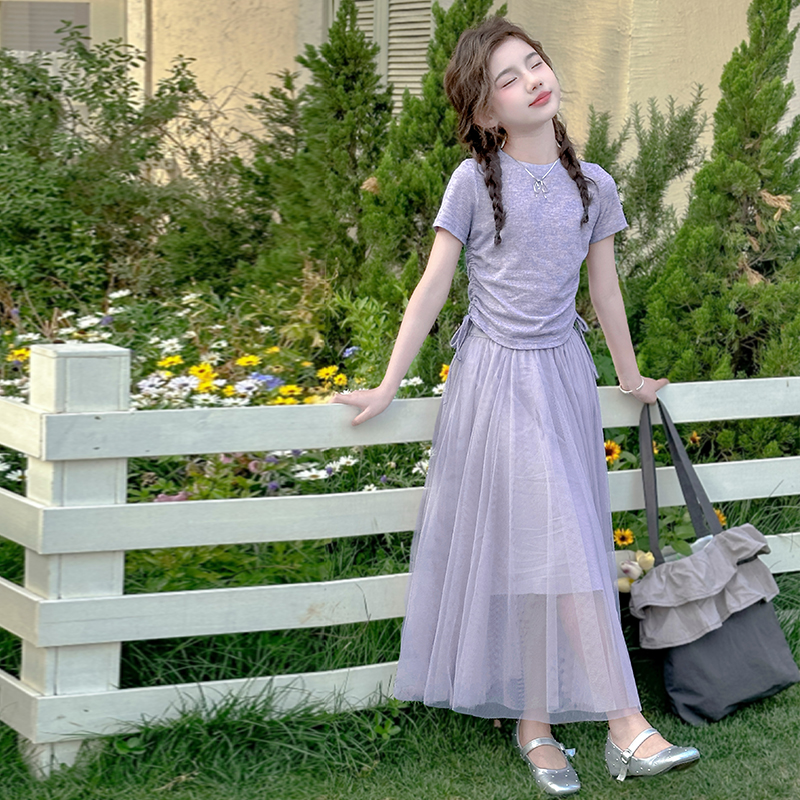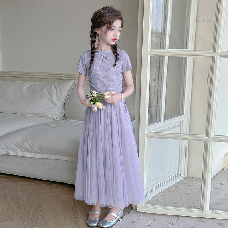 女童夏裝紫色連衣裙大兒童夏季裙子套裝女孩短袖紗裙薄款公主長裙