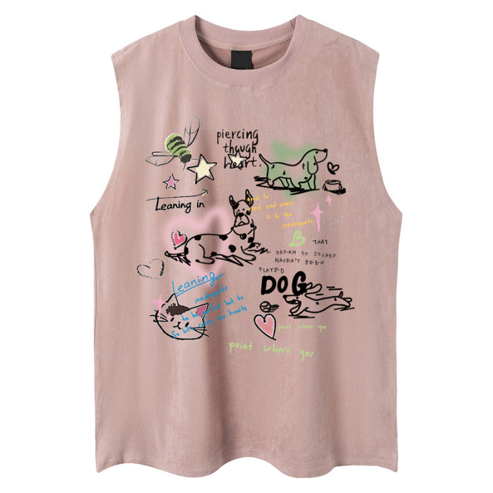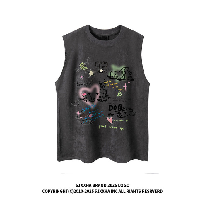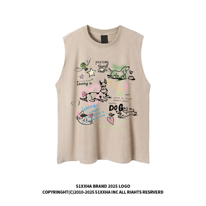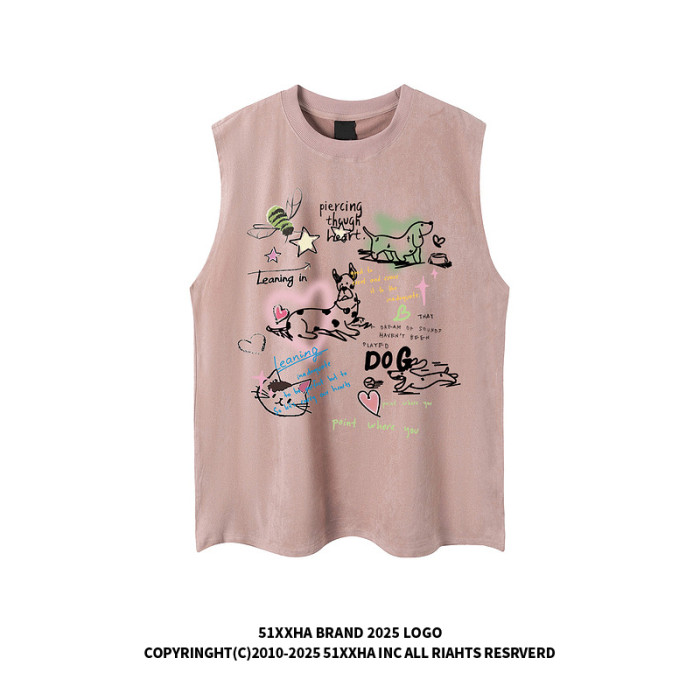 51嘻哈美式復古手繪小狗印花無袖T恤男夏季情侶寬松休閒坎肩背心