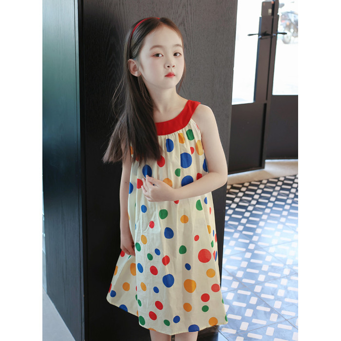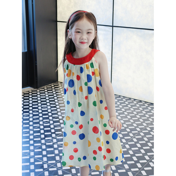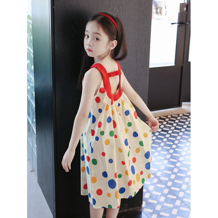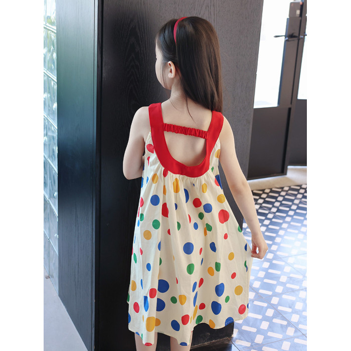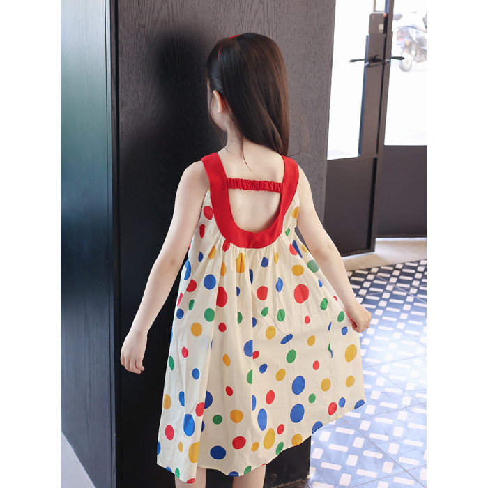 純棉女童連衣裙夏款彩色圓點露背掛脖吊帶背心裙無袖薄款兒童裙子