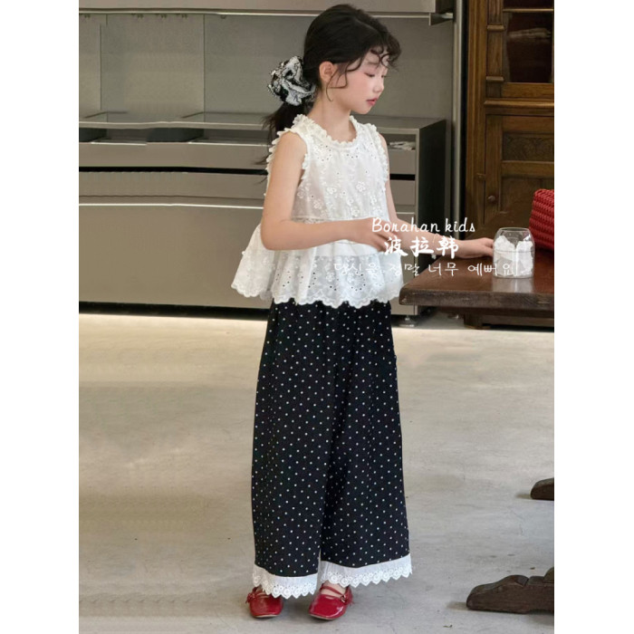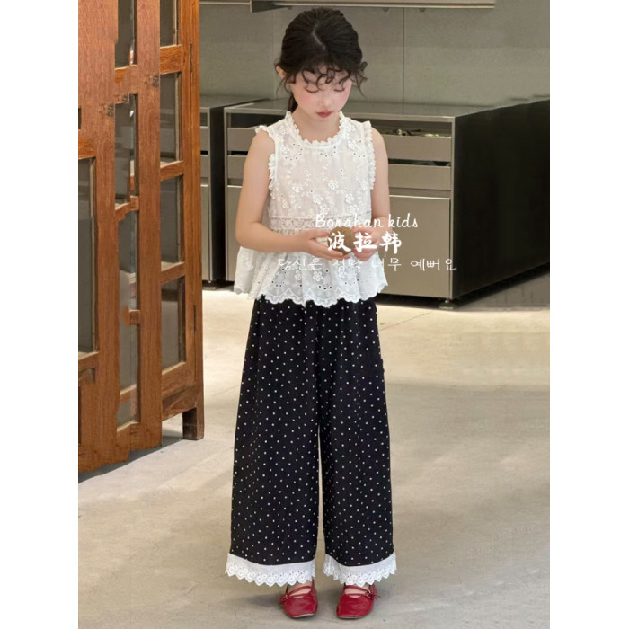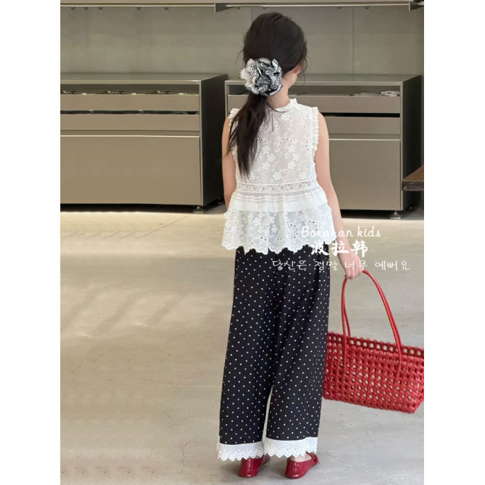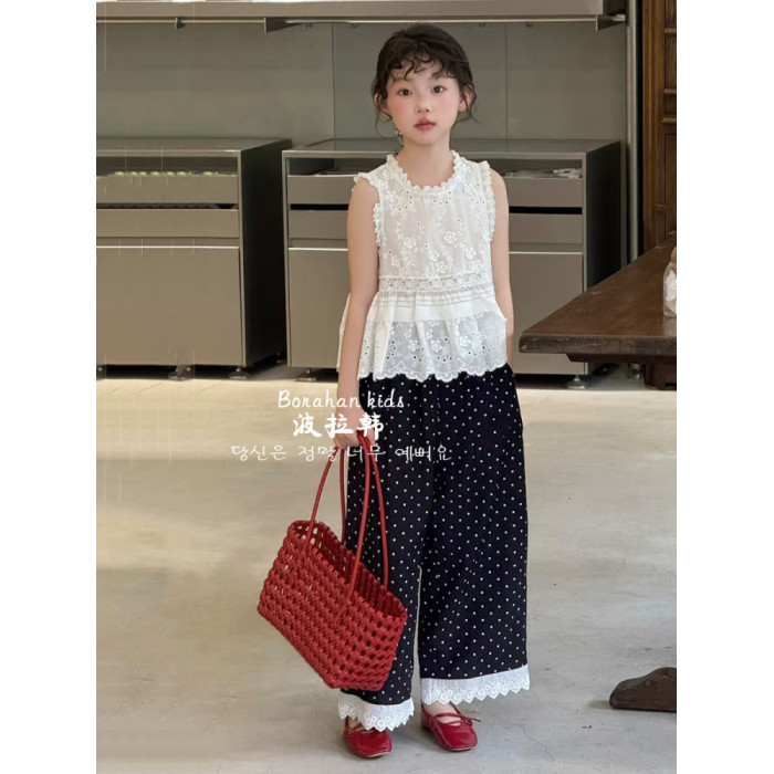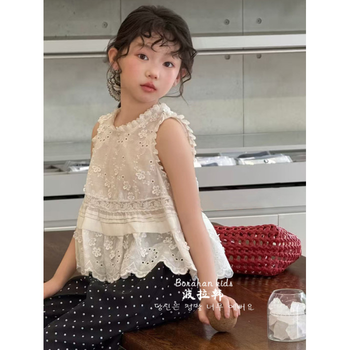 波拉韓女童刺綉鉤花襯衫夏季背心兒童法式娃娃衫中大童花邊襯衣服