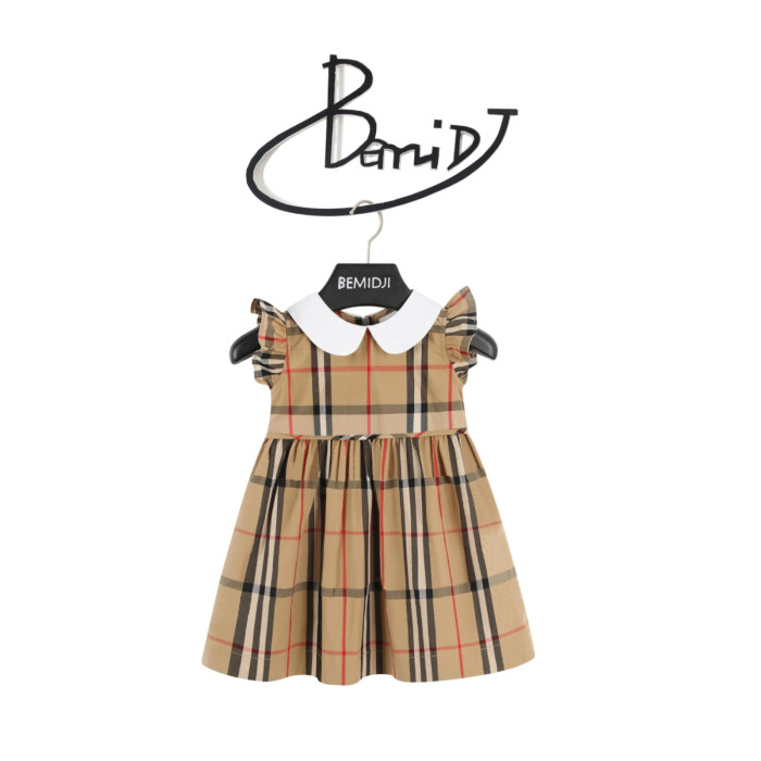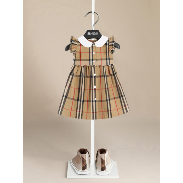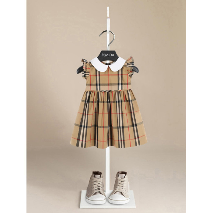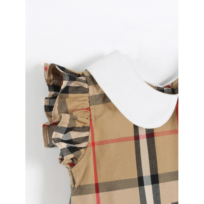 2025夏新款女童格子連衣裙中小童娃娃領洋氣可愛飛袖公主裙1642