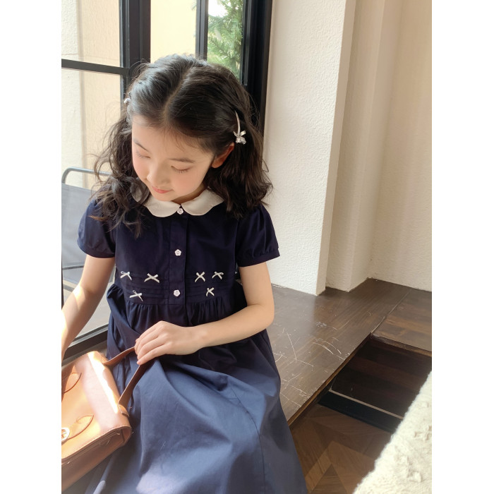 JUNE NUAN日系女童大童夏季手工蝴蝶結波浪領學院風連衣裙