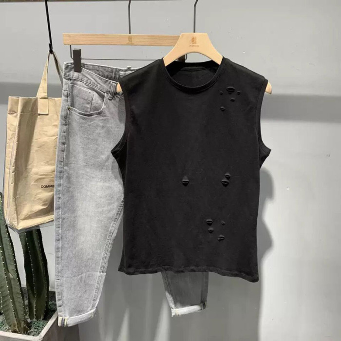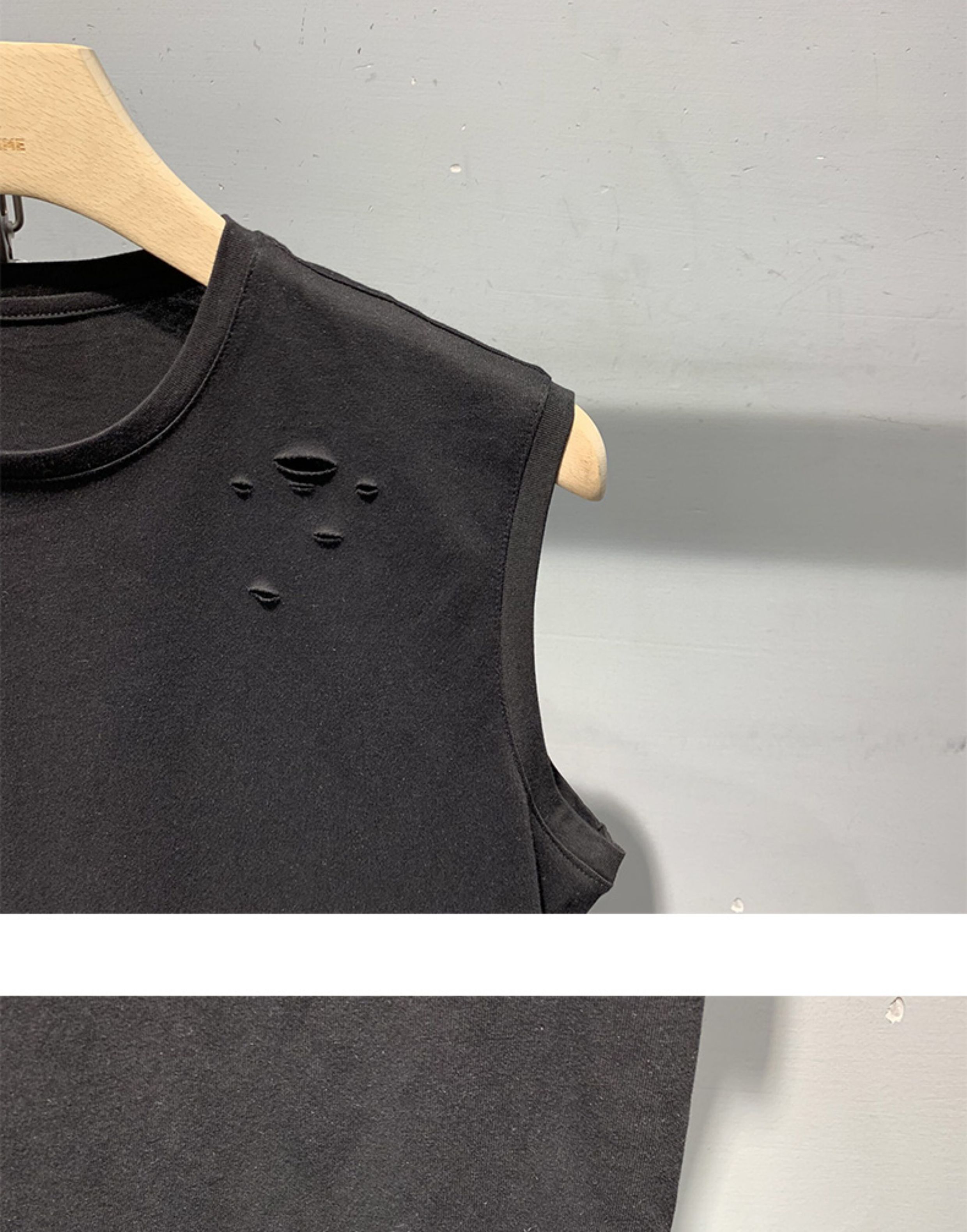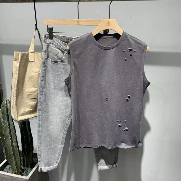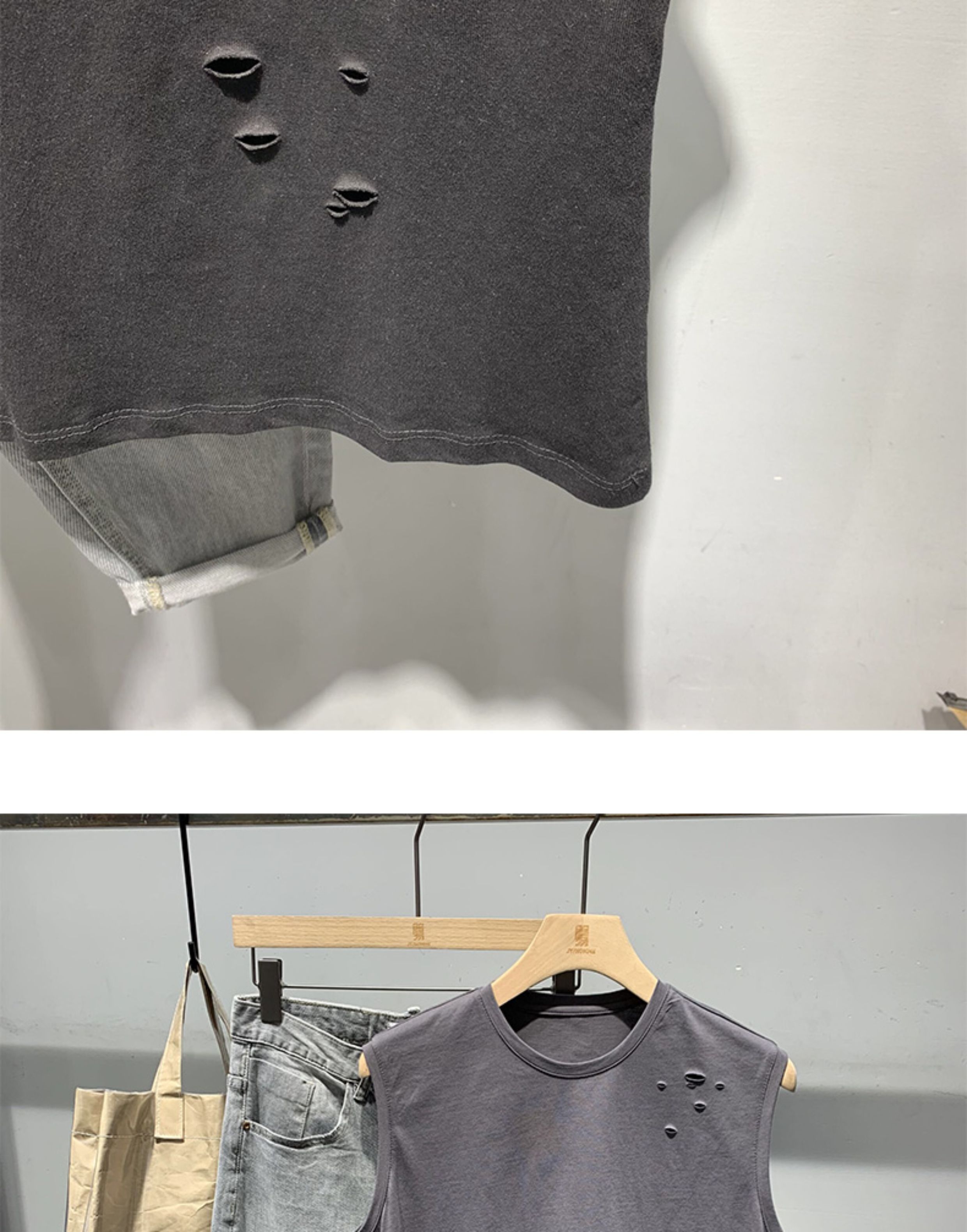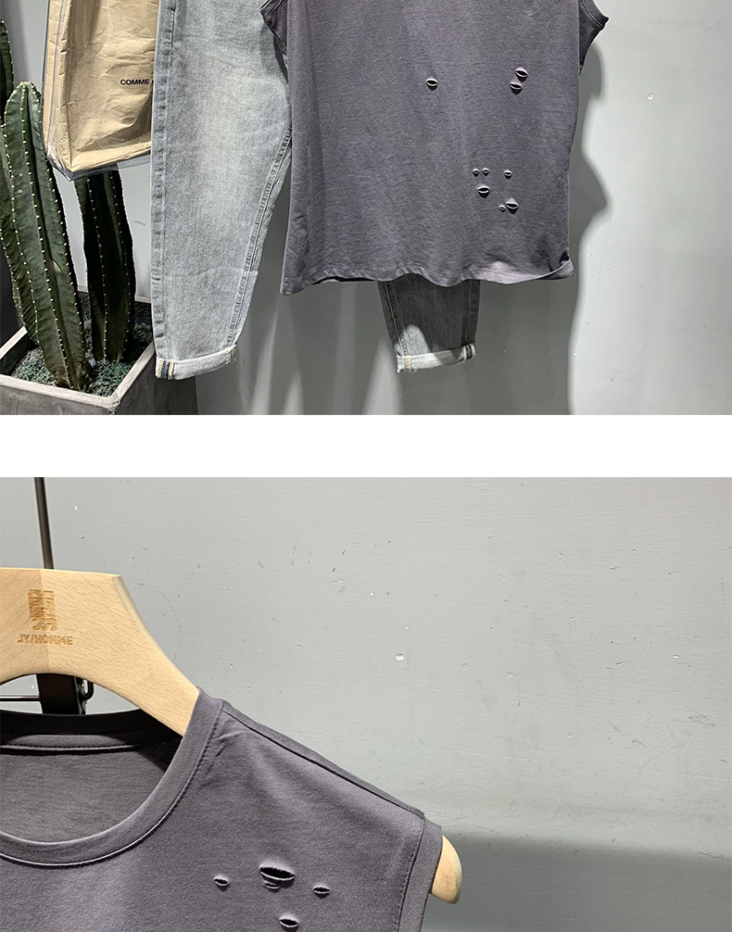 破洞無袖背心男夏季寬松沙灘休閒潮牌外穿打底衫健身運動坎肩t恤