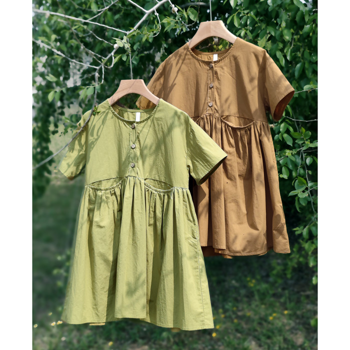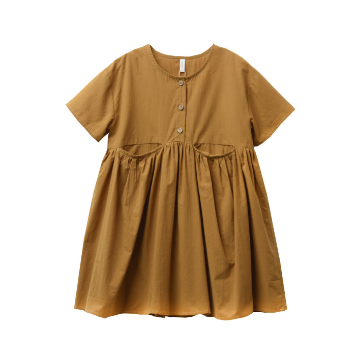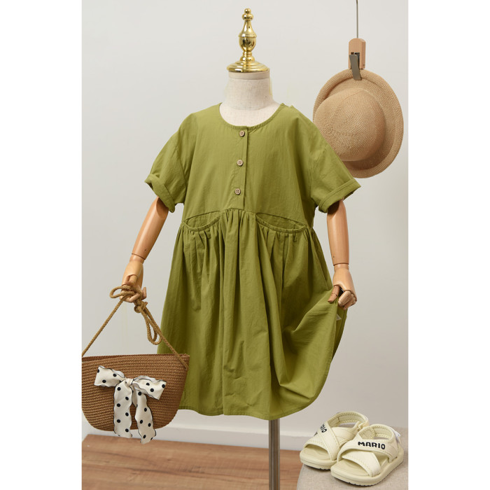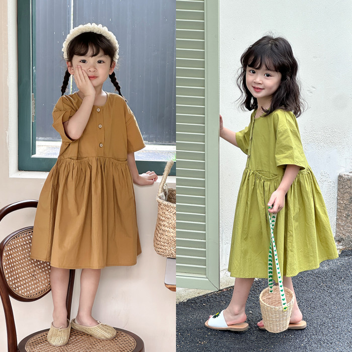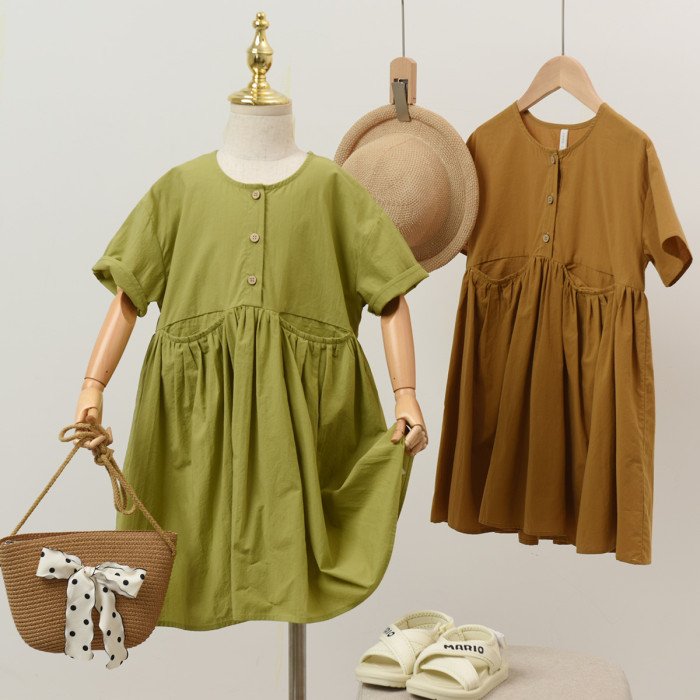 60支高支水洗棉 兒童純棉連衣裙 女童圓領短袖純色裙 中大童夏款