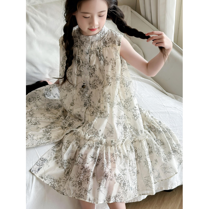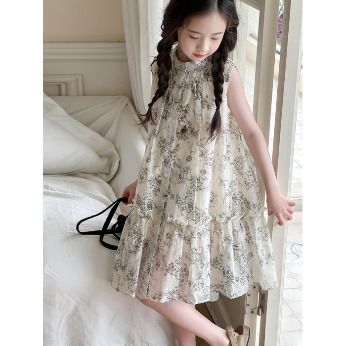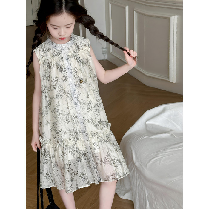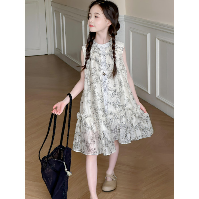 女童連衣裙夏裝2025新款中大童水墨印花公主裙洋氣韓版無袖碎花裙