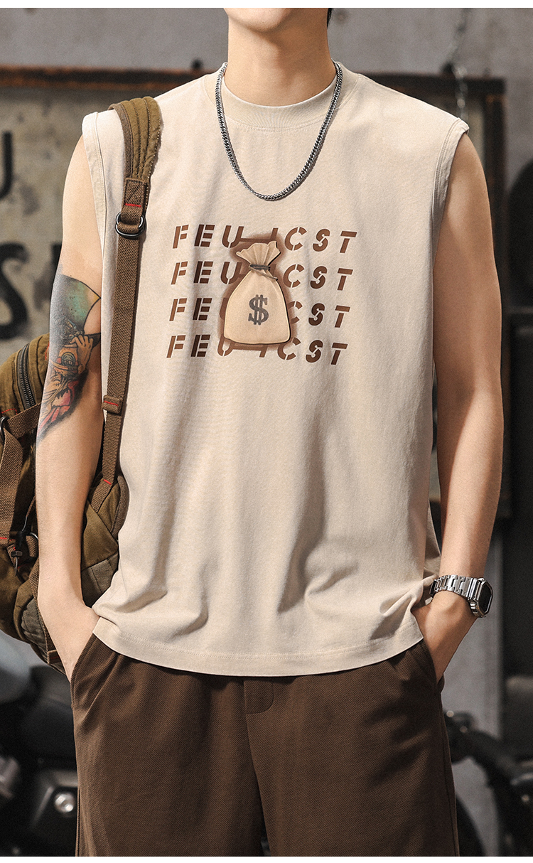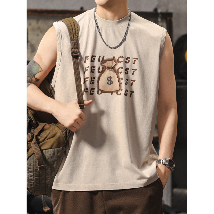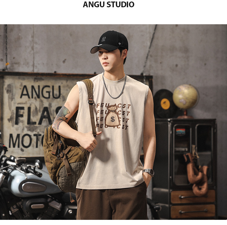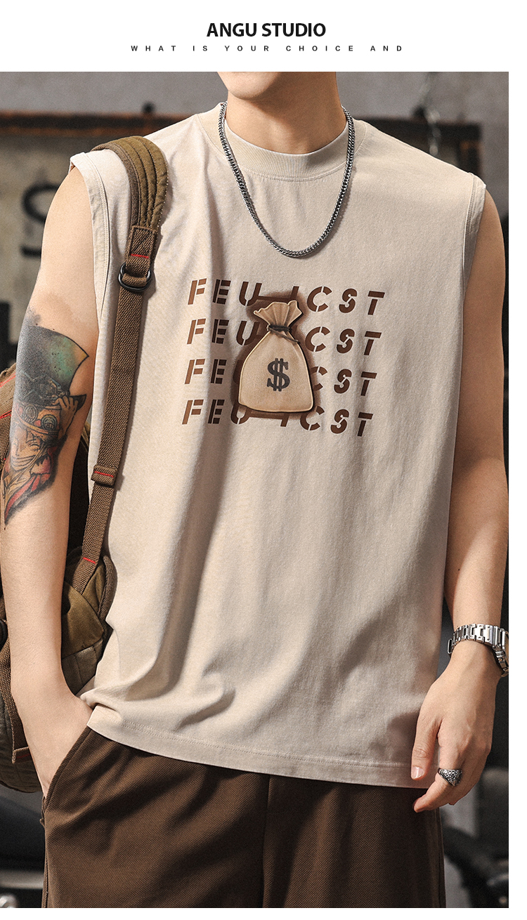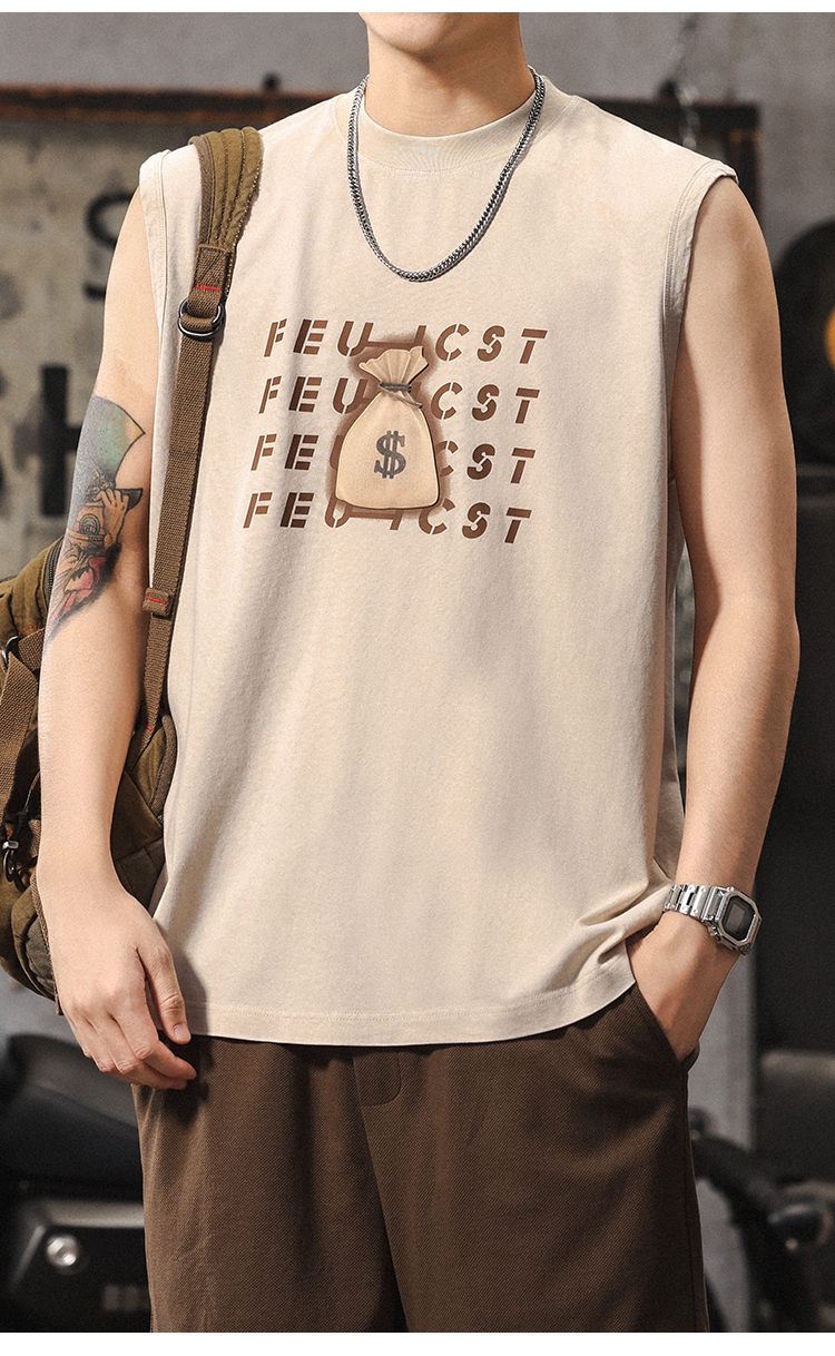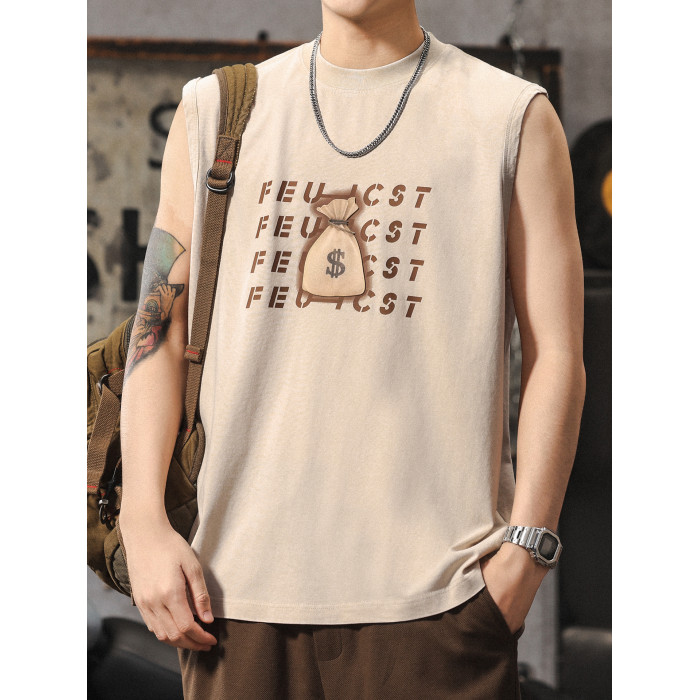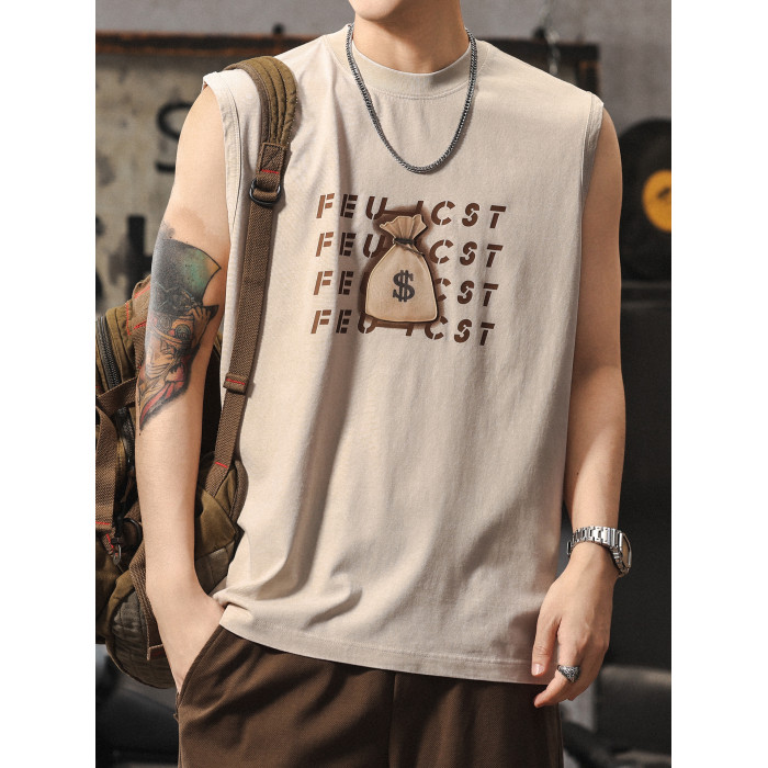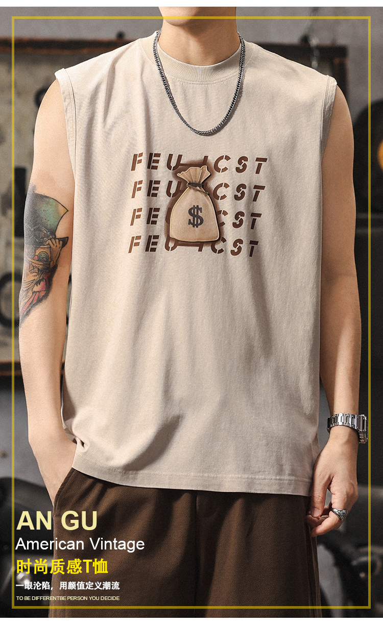 夏季新款無袖t恤男士時尚潮流寬松美式復古印花休閒大碼運動背心