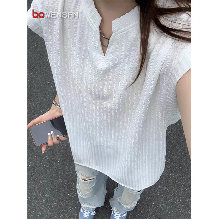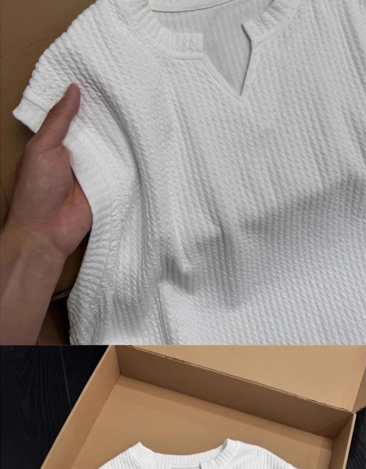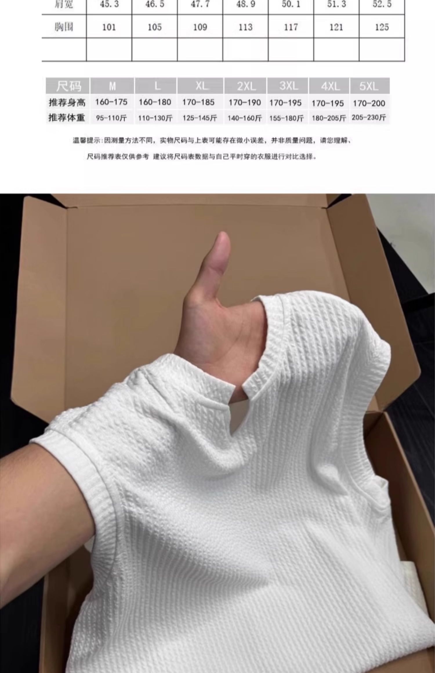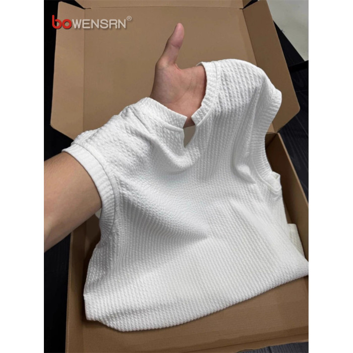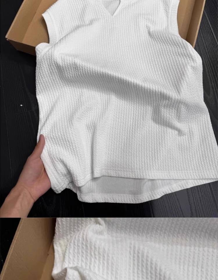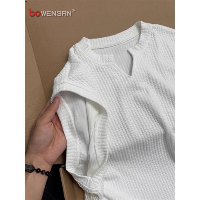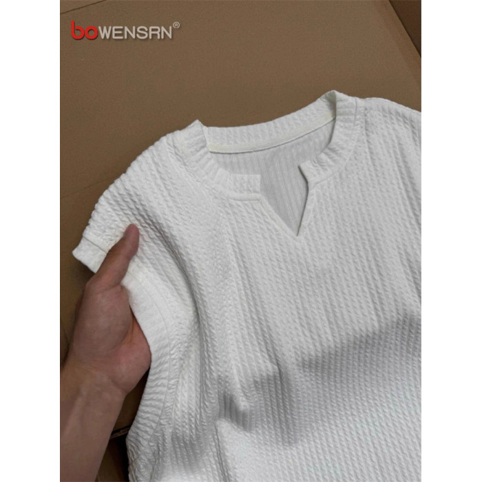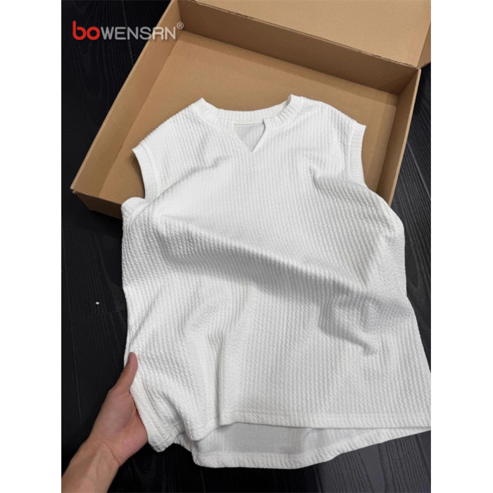 美式潮牌V領褶皺背心男士2025新款夏季高級感坎肩無袖t恤男款汗衫