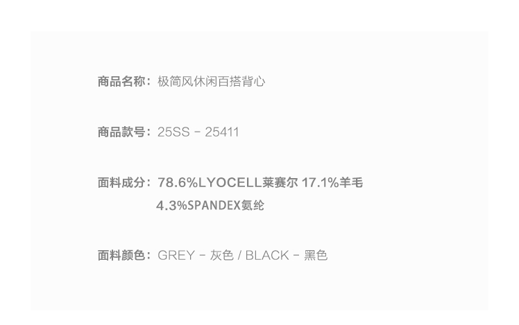 材質成分 | 萊賽爾纖維(萊賽爾)78.6% 綿羊毛17.1% 聚氨酯彈性纖維(氨綸)4.3% |