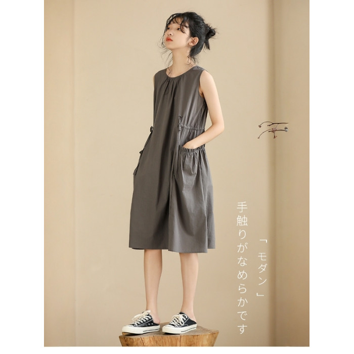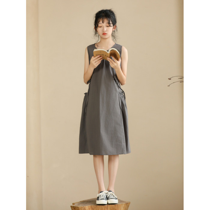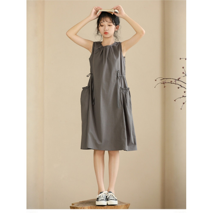 純棉夏季女童連衣裙2025新款中大童慵懶裙子無袖背心裙法式口袋裙