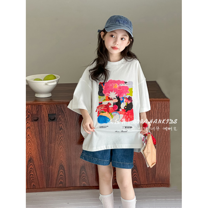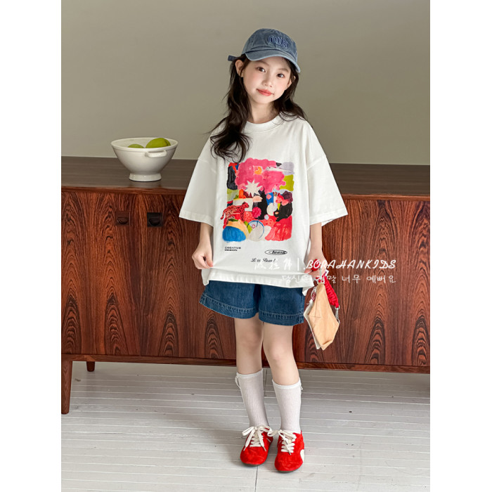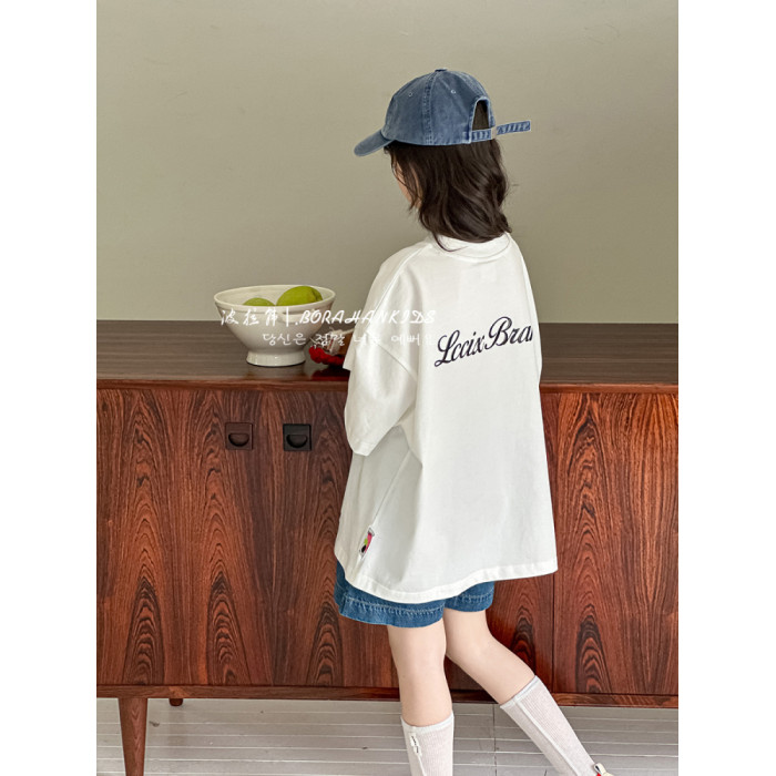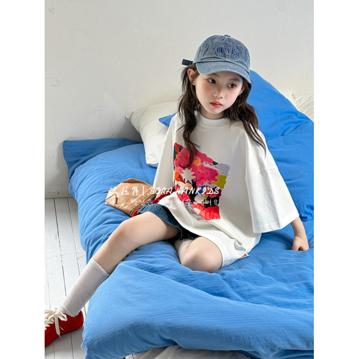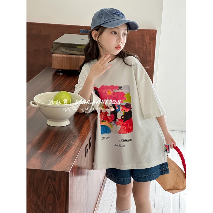 波拉韓女童短袖新款t恤2025夏季中大童純棉上衣兒童夏裝寬松半袖t