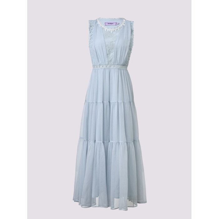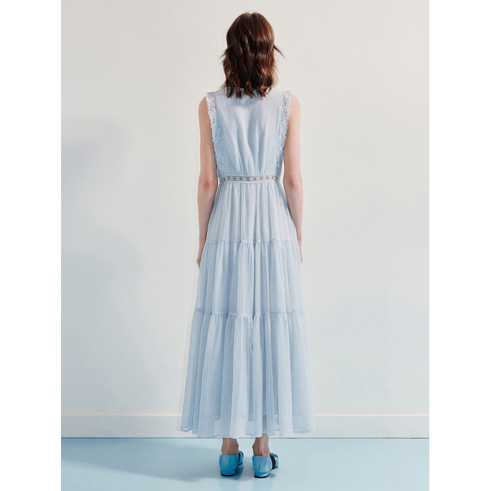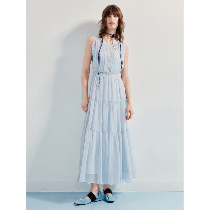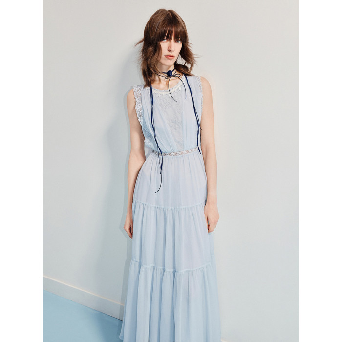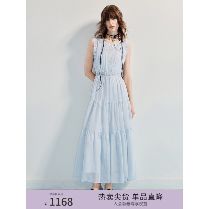 MAXRIENY優雅度假背心連衣裙帕無袖收腰斯蒂爾風航海風蕾絲長裙夏