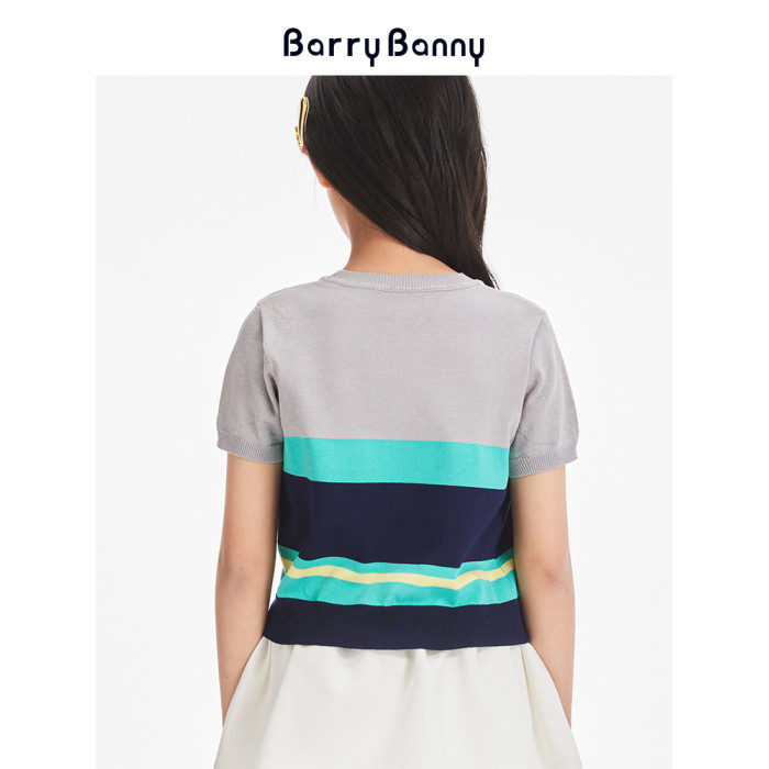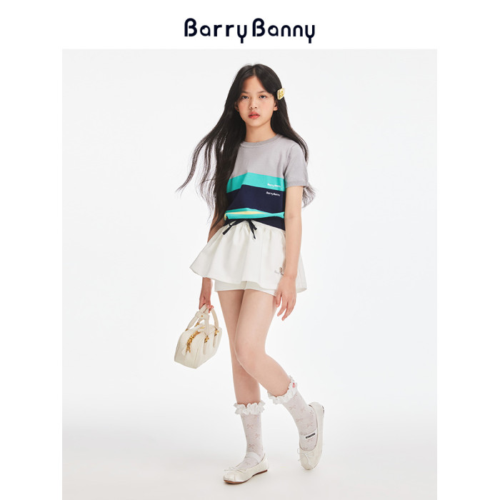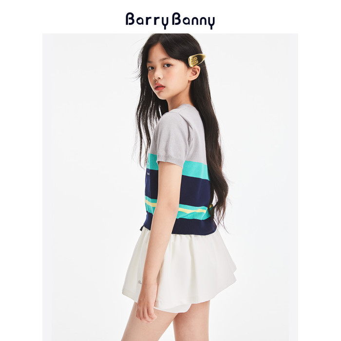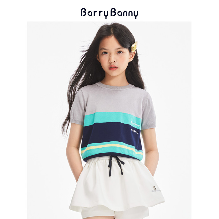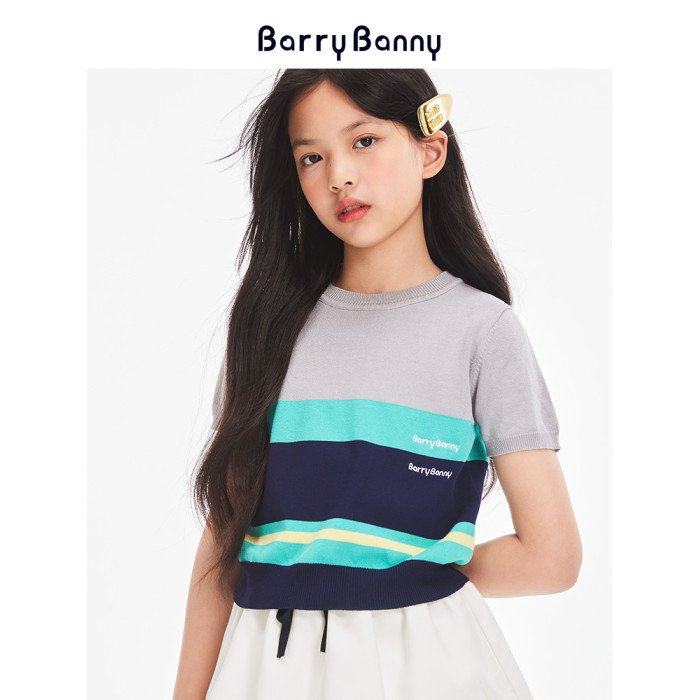 BarryBanny女童冰絲條紋撞色短袖T恤夏季新款中大童抗皺透氣上衣