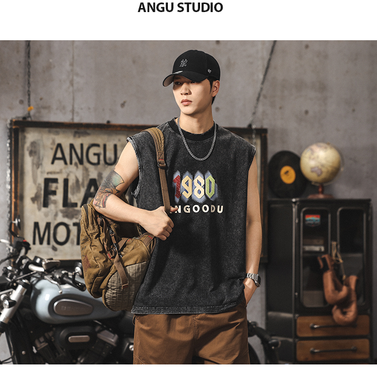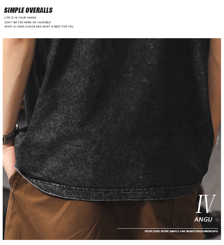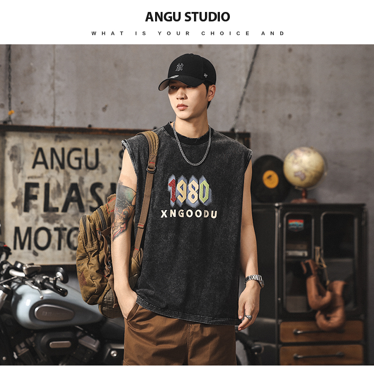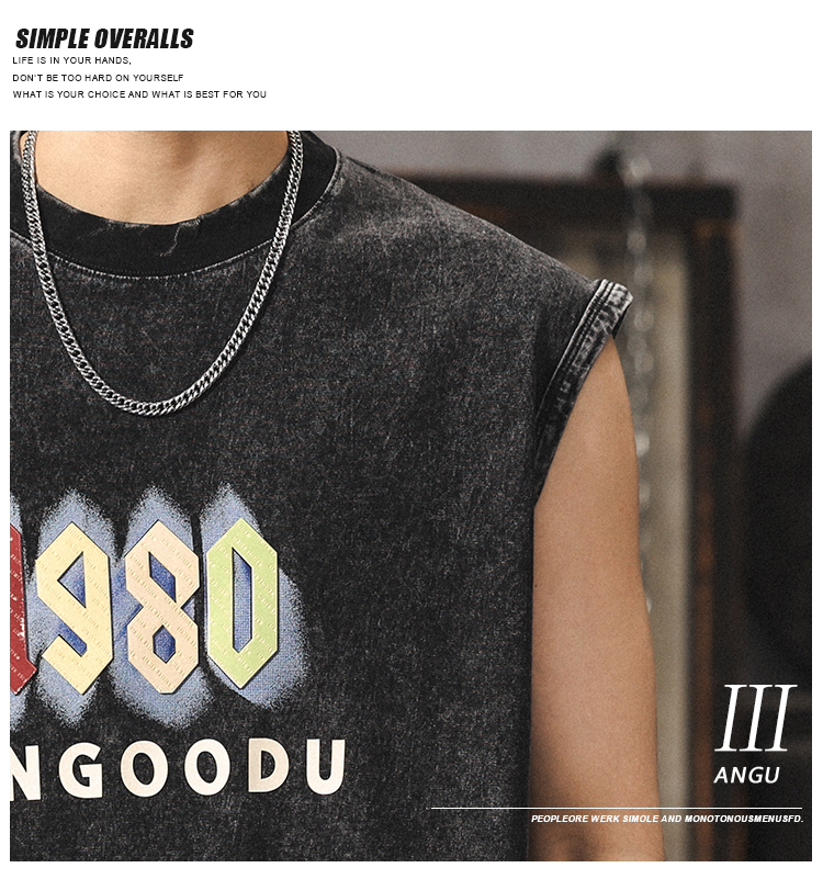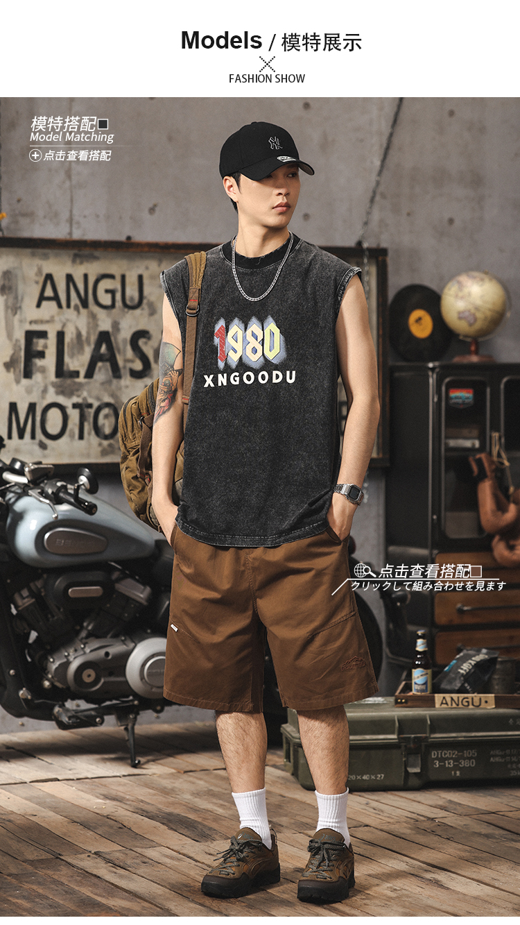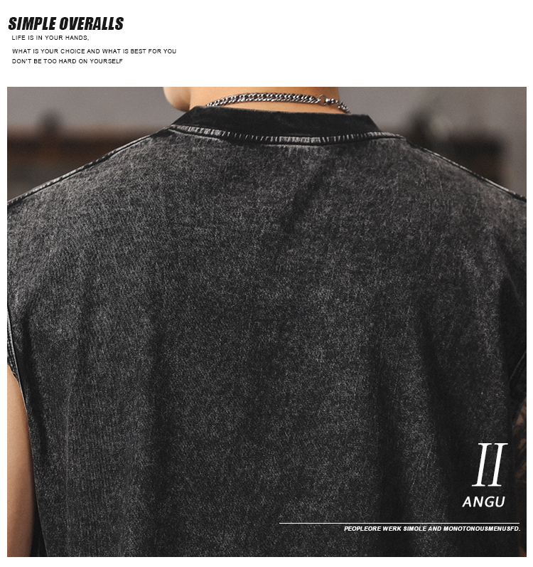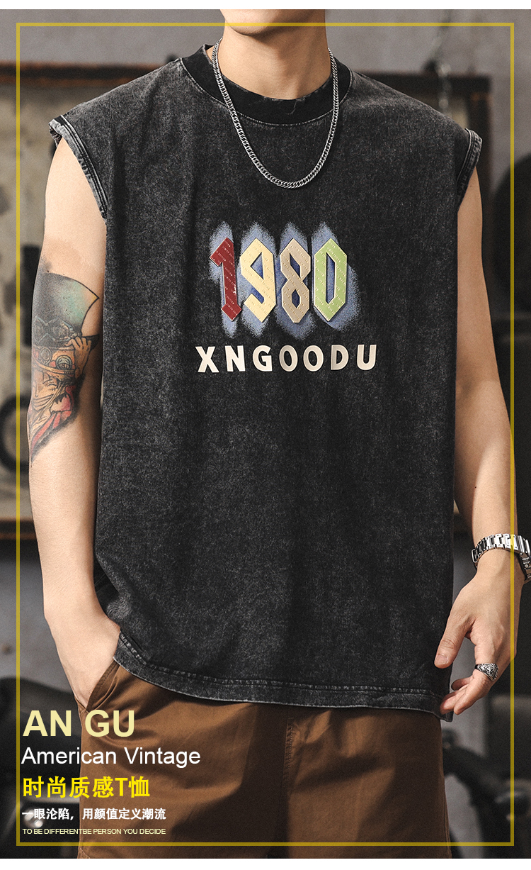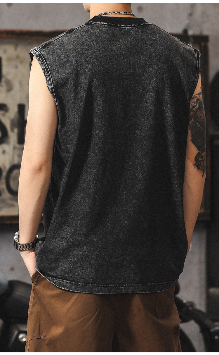 洗水做舊無袖t恤男ins潮牌日系簡約寬松坎肩夏季純棉運動跑步背心
