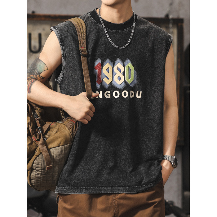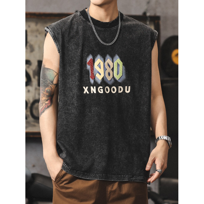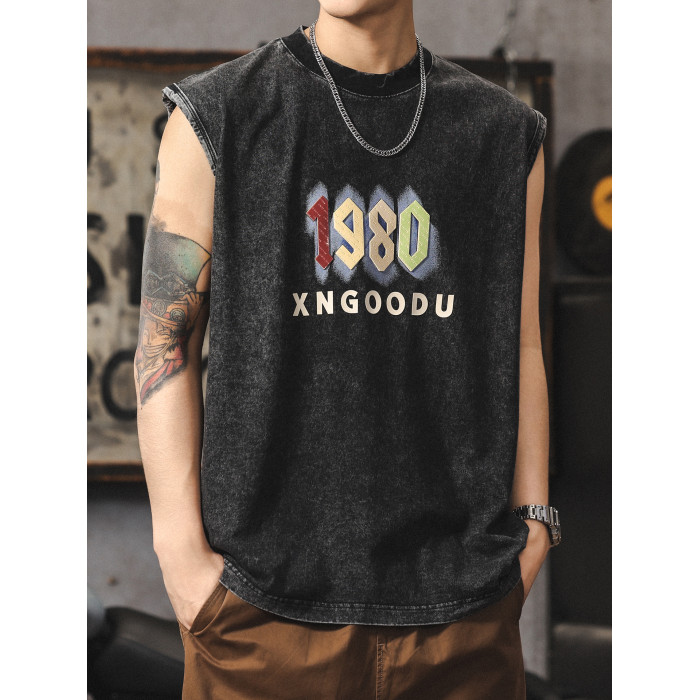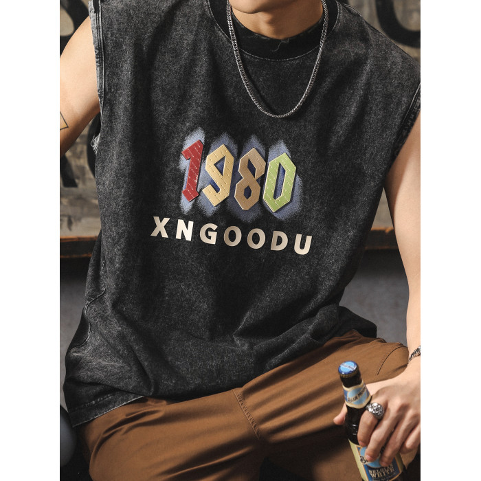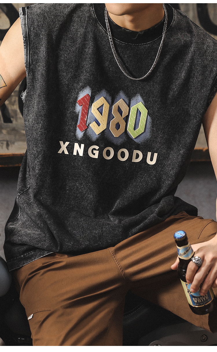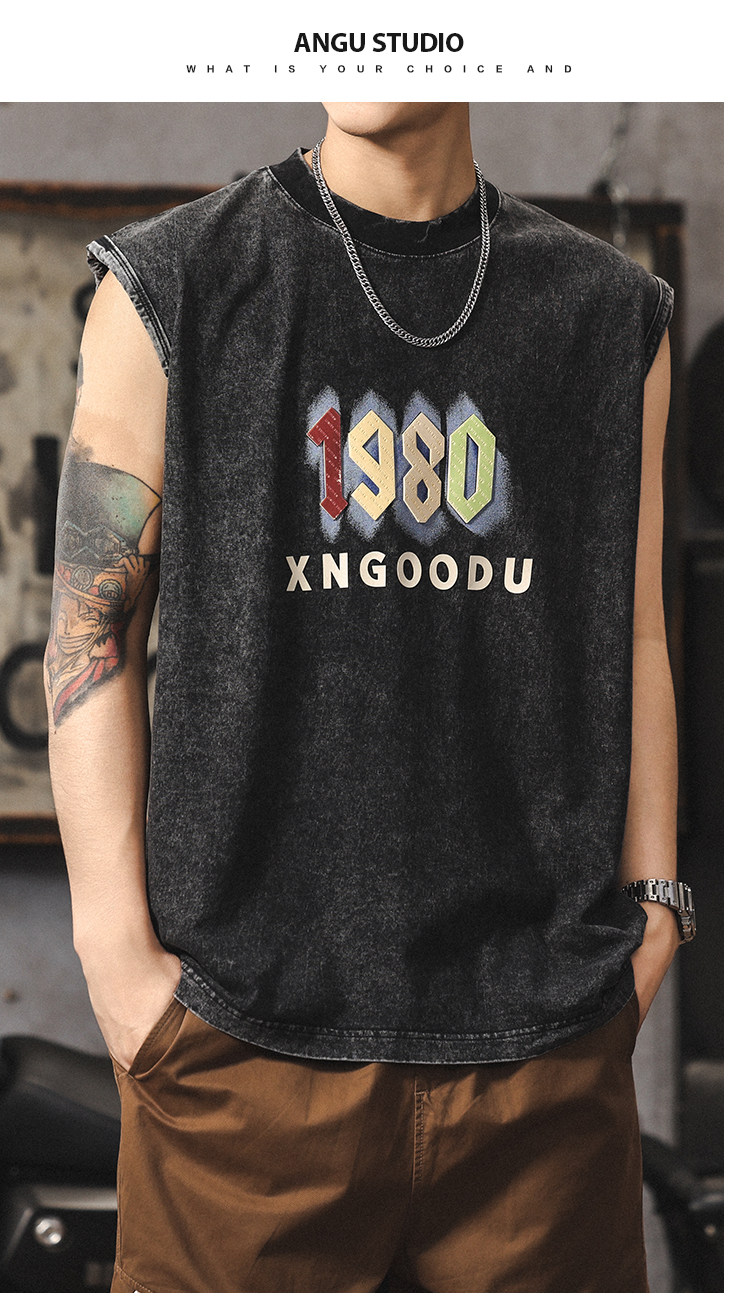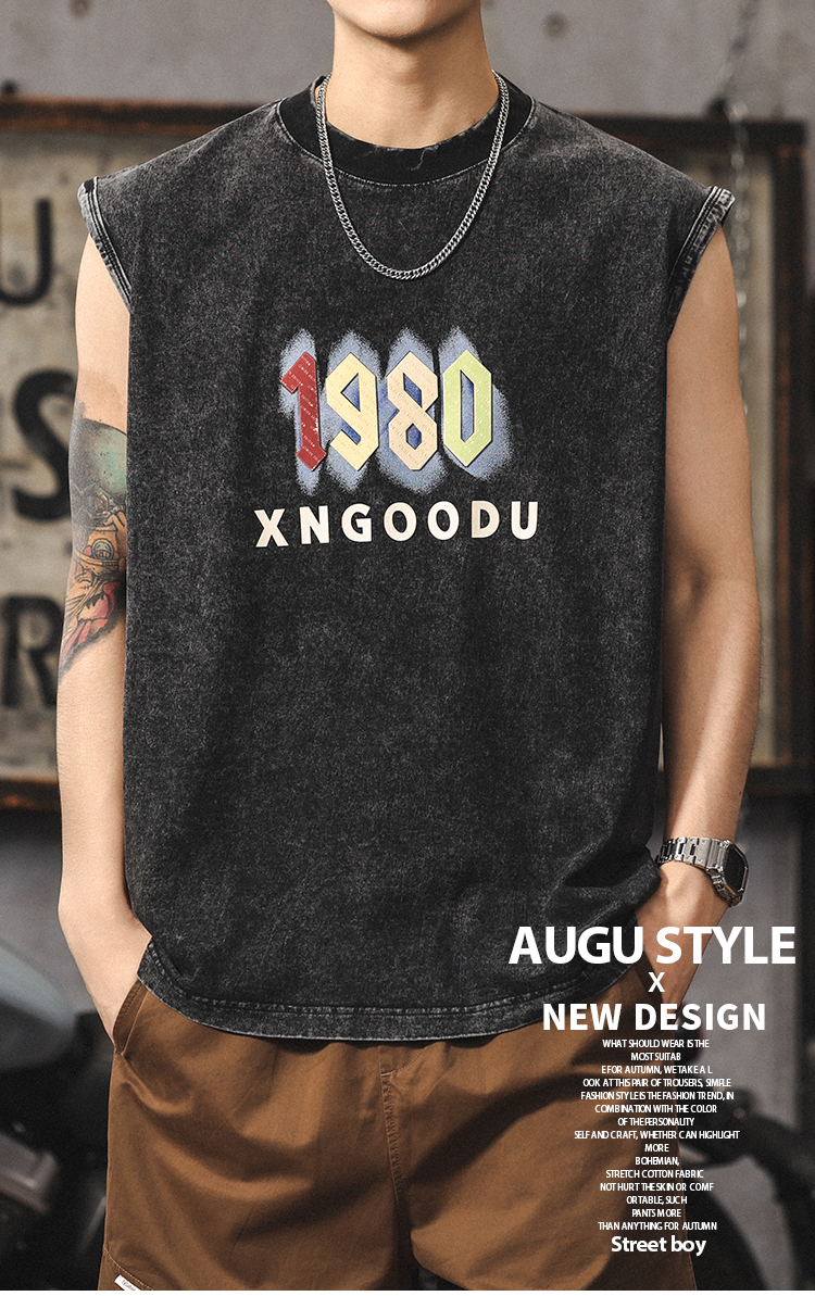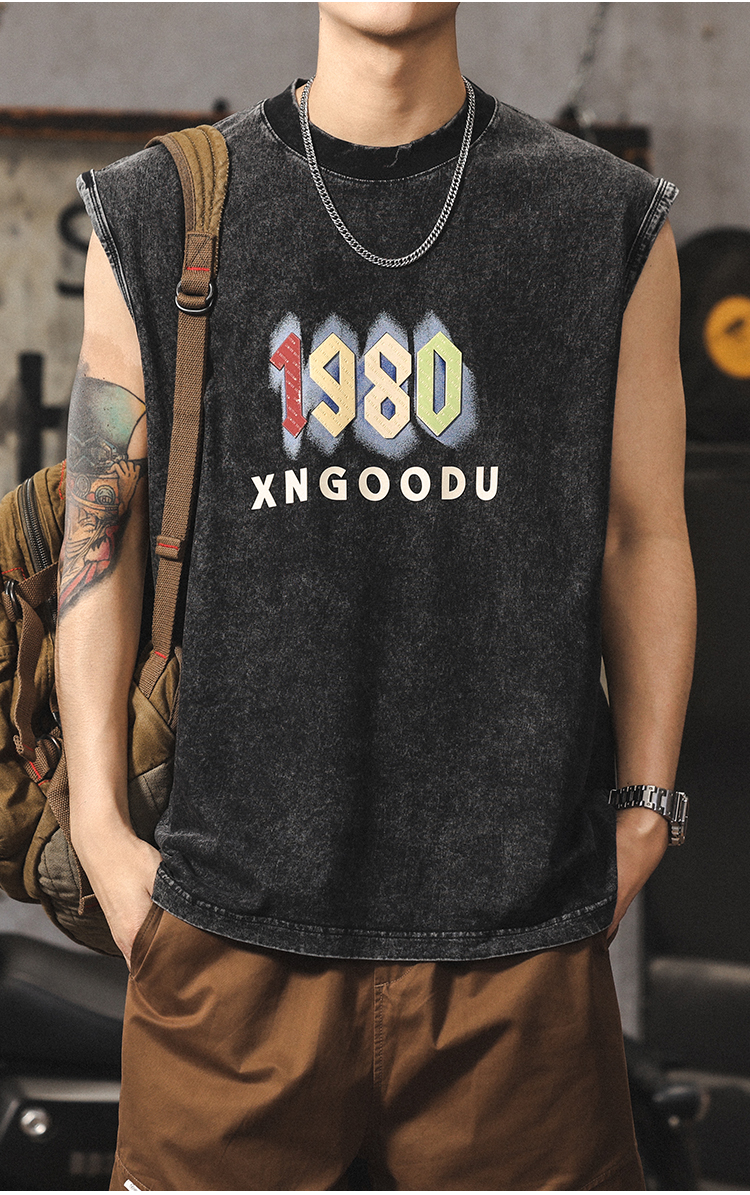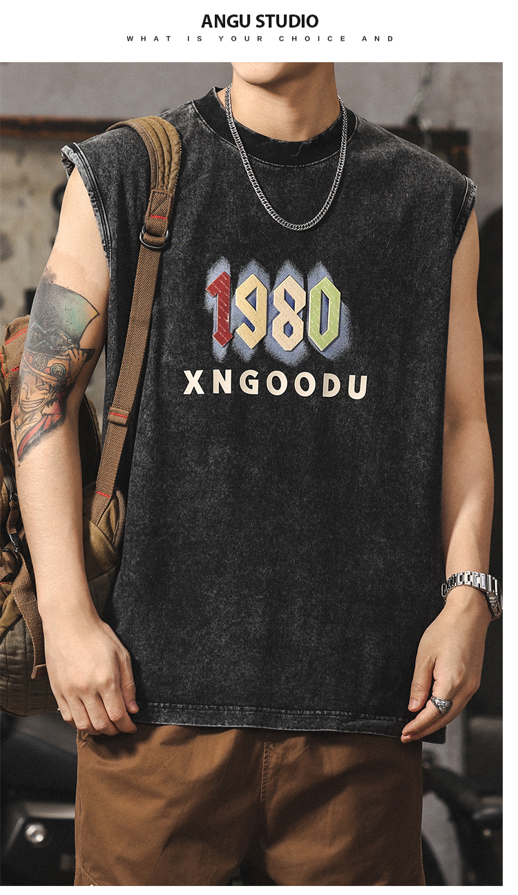 洗水做舊無袖t恤男ins潮牌日系簡約寬松坎肩夏季純棉運動跑步背心