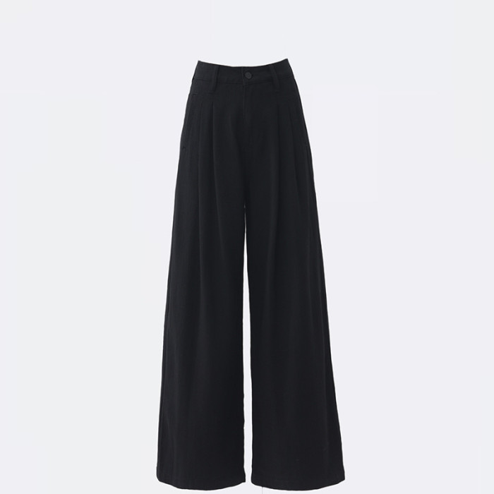 YC&2色復古高腰寬松濶腿褲垂感拖地褶皺百搭顯瘦直筒牛仔褲女初秋