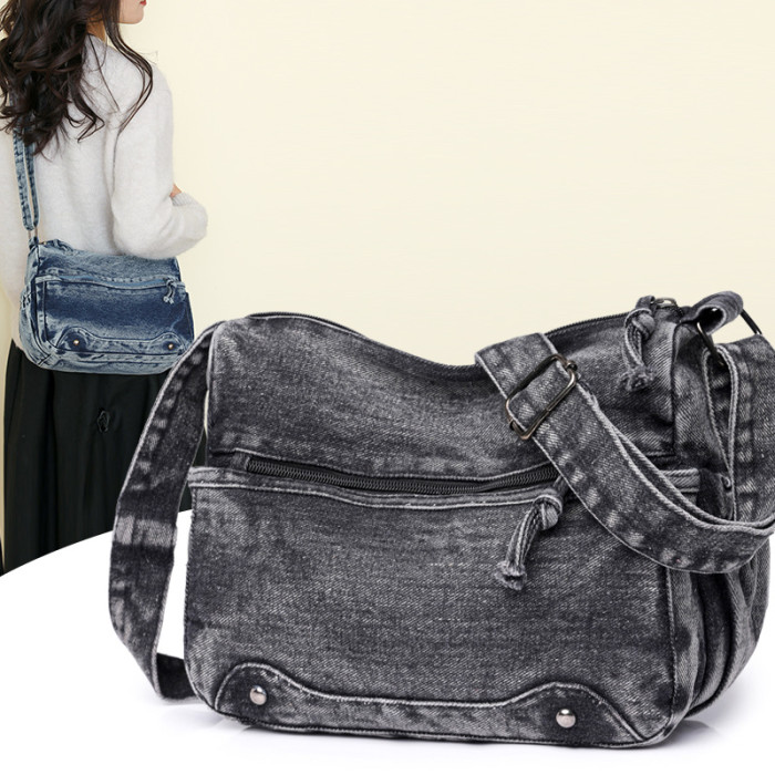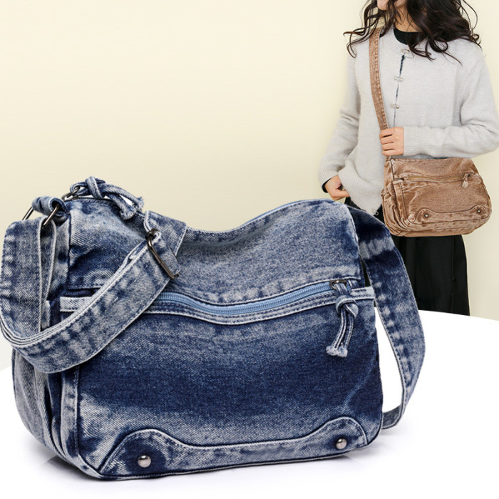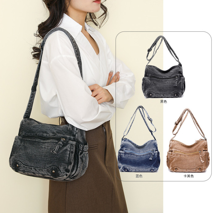 水洗牛仔布斜後背包多口袋輕便布包耐磨復古休閒單肩包大容量托特包