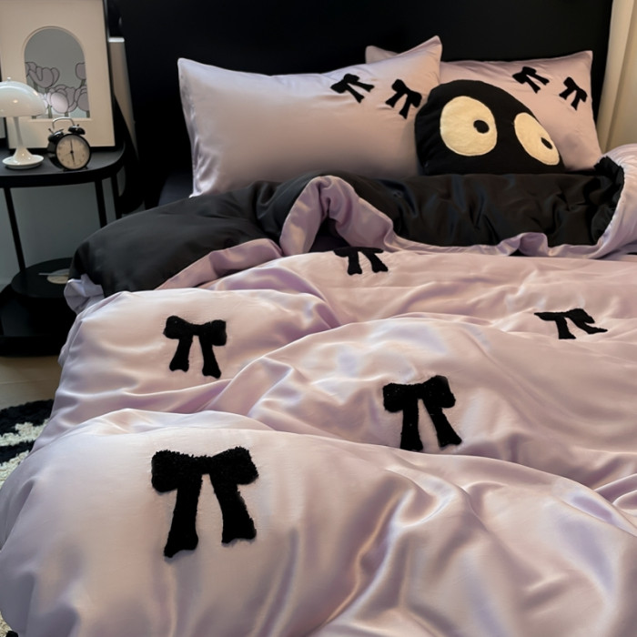 紫黑蝴蝶結毛巾綉冰絲床單四件套夏季涼感水洗真絲被套被單三件套