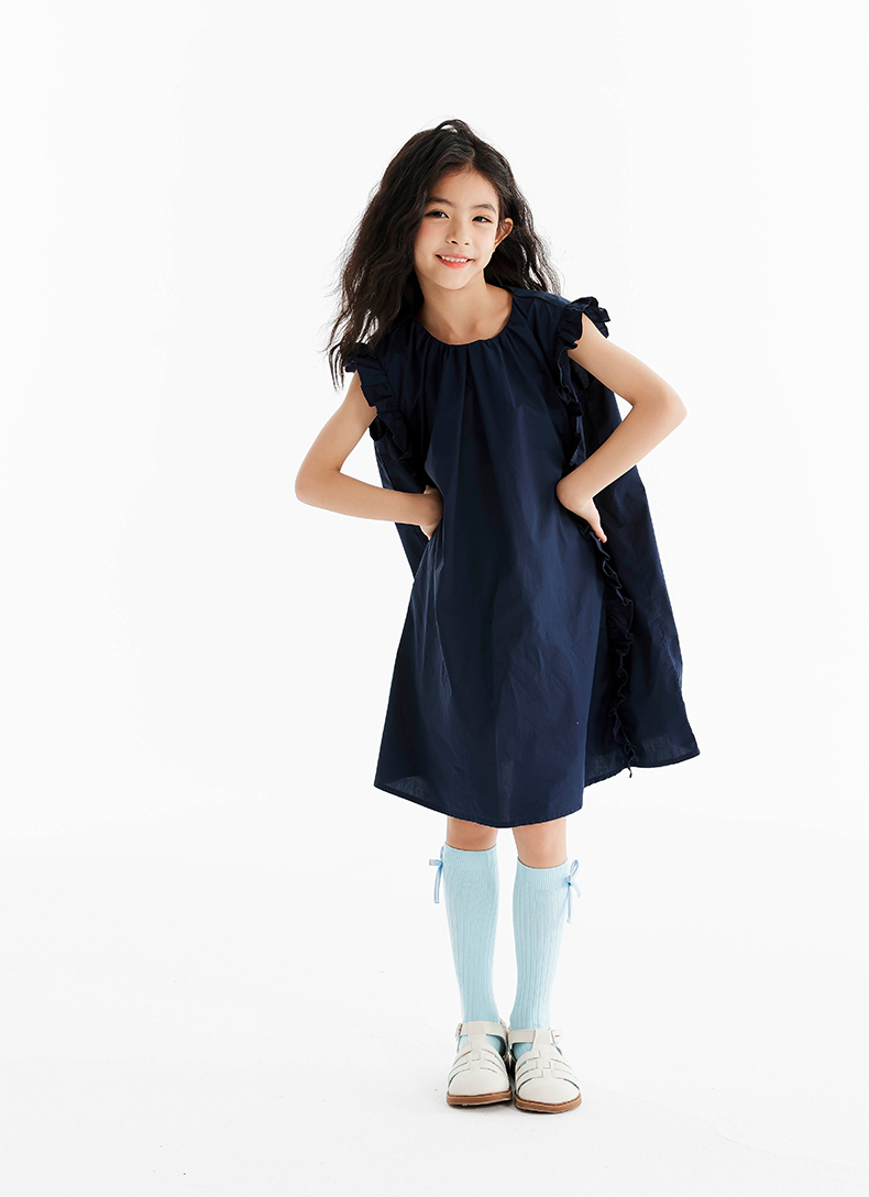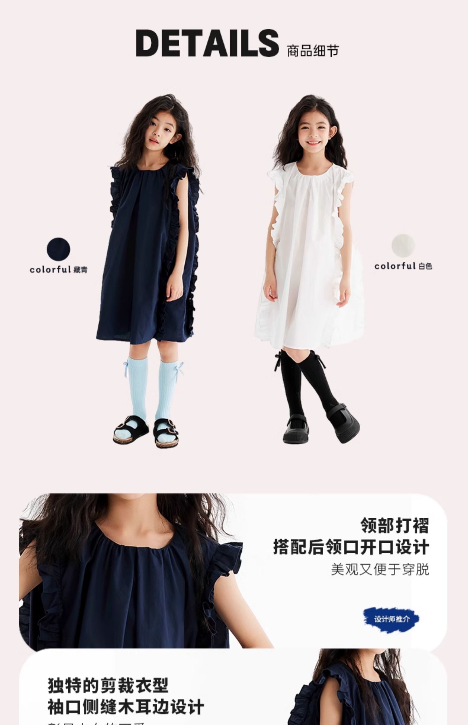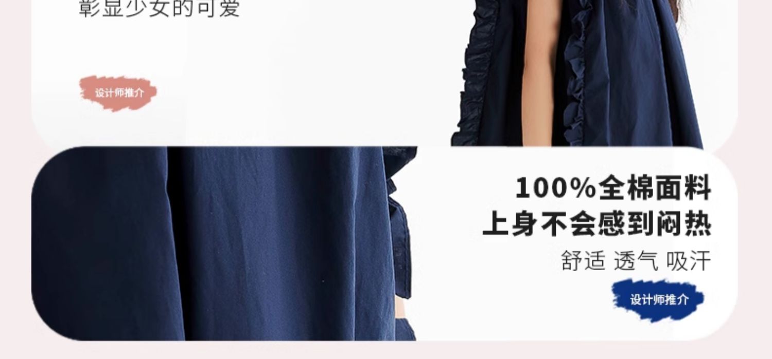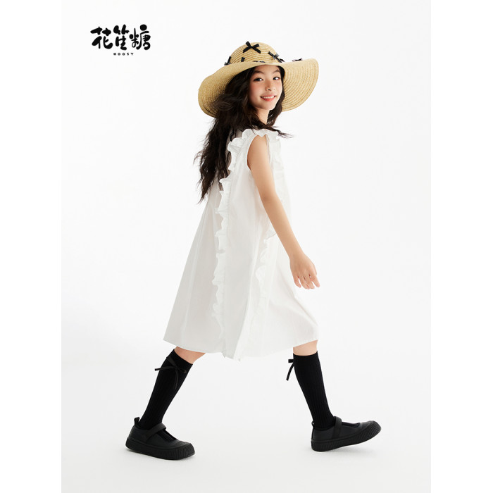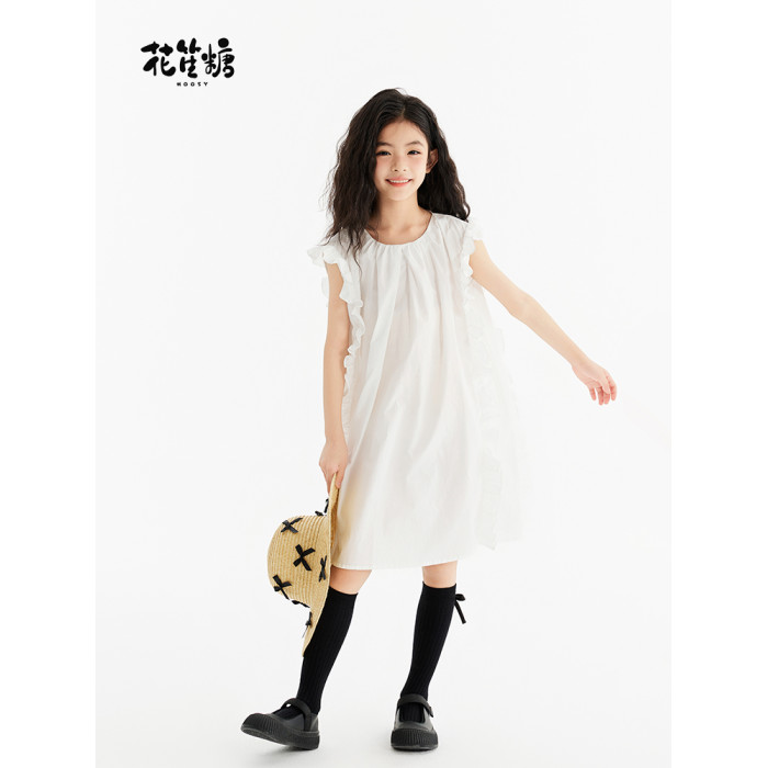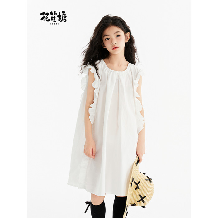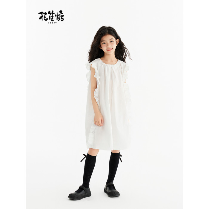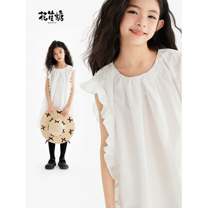 花笙糖中大女童文藝韓版氣質連衣裙純色木耳邊高級簡約小女孩裙子