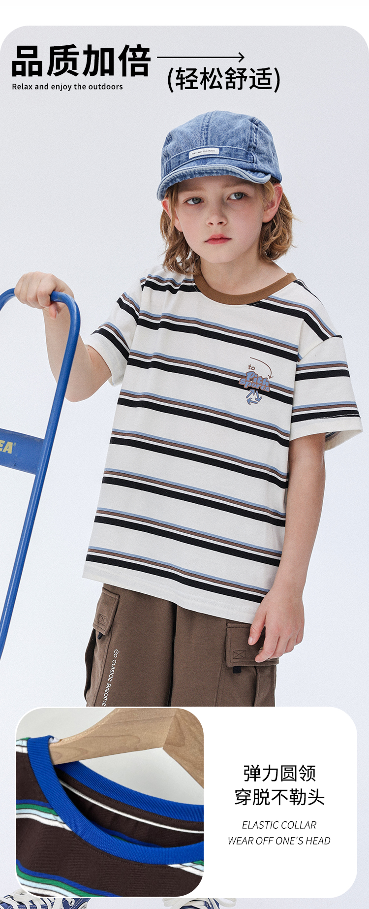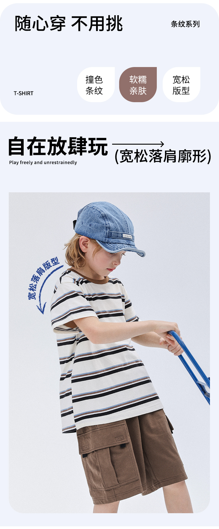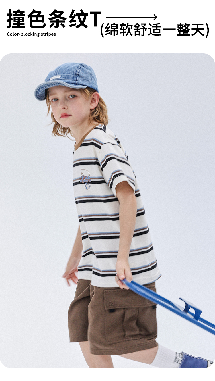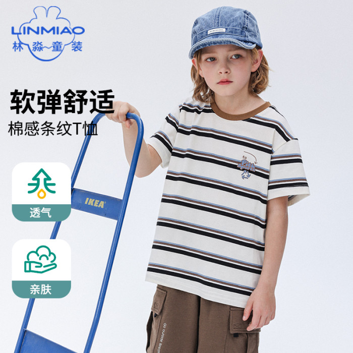 林淼童裝兒童短袖T恤2025夏季新款男童條紋半袖運動休閒百搭上衣
