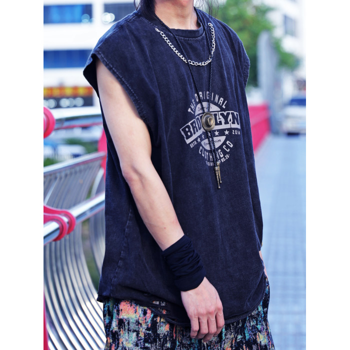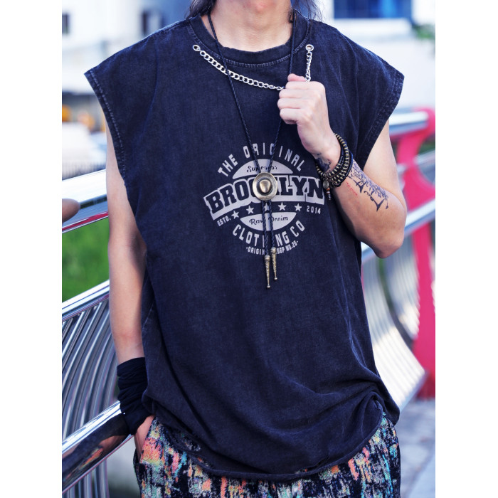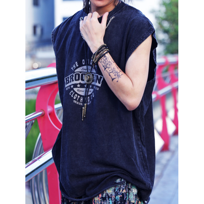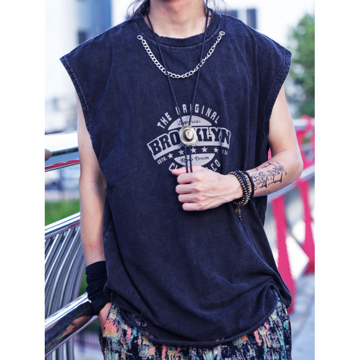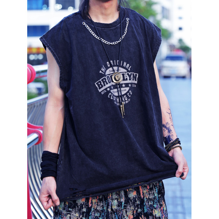 純棉水洗做舊男士背心潮流街頭破洞無袖T恤寬松復古印花上衣夏季