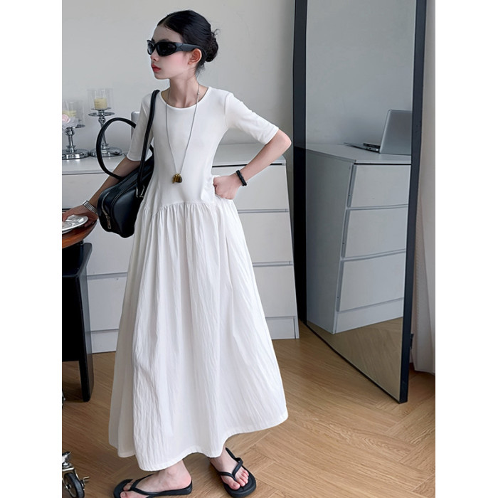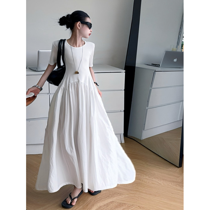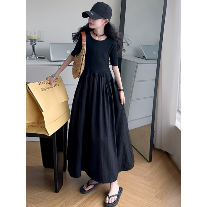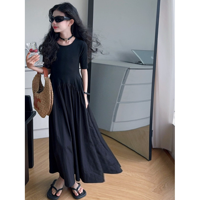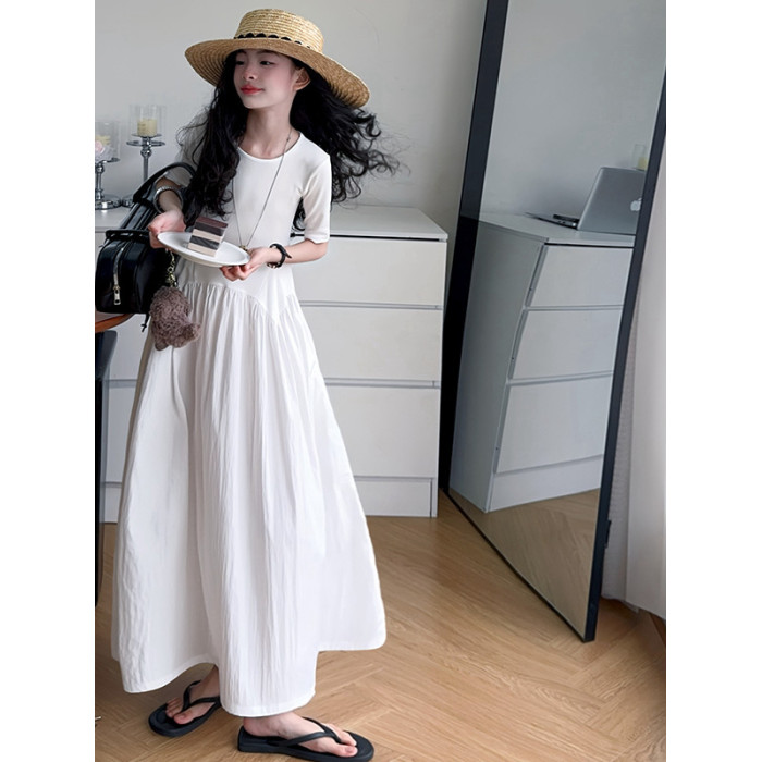 女童法式連衣裙兒童圓領短袖長裙女孩夏裝慵懶風高級感2025大擺裙