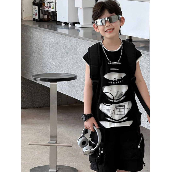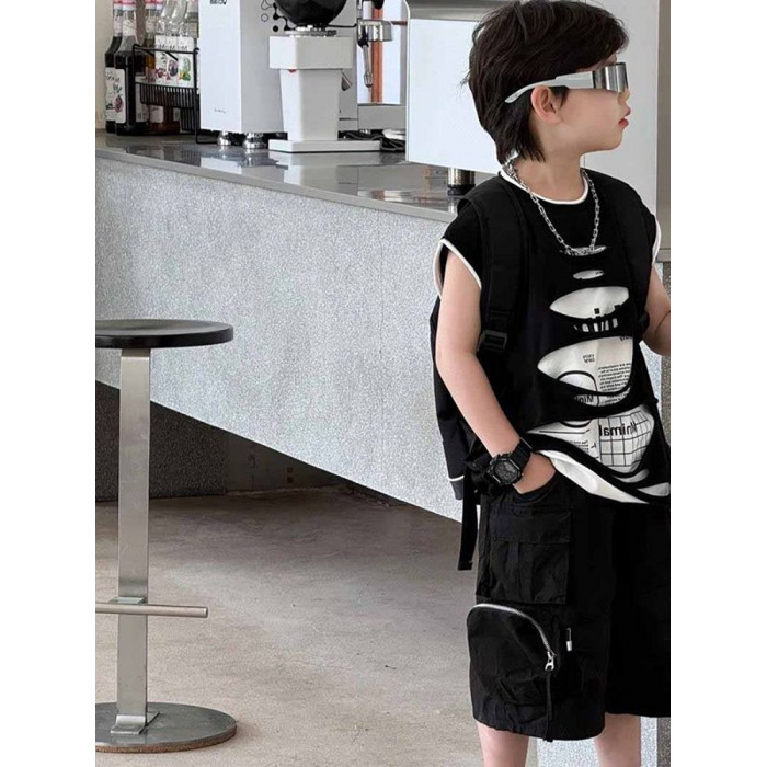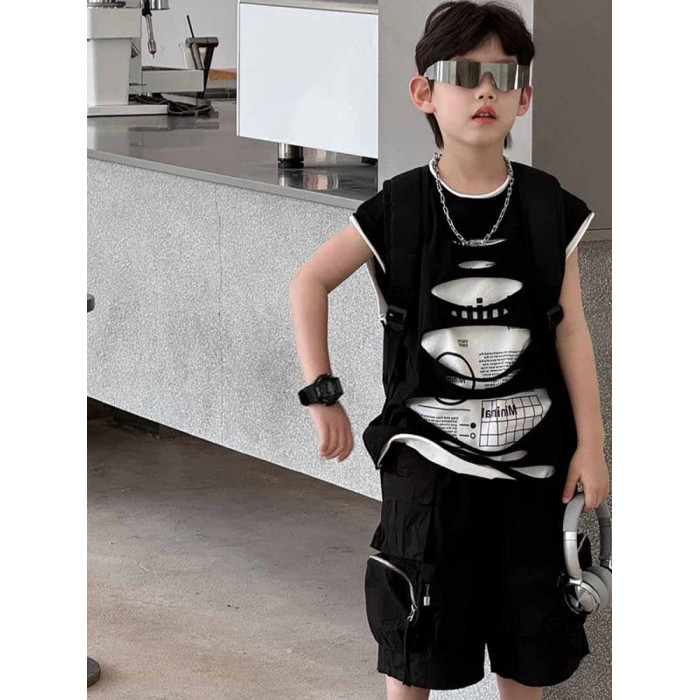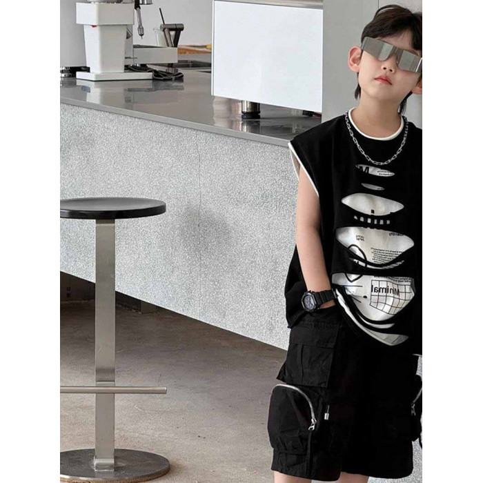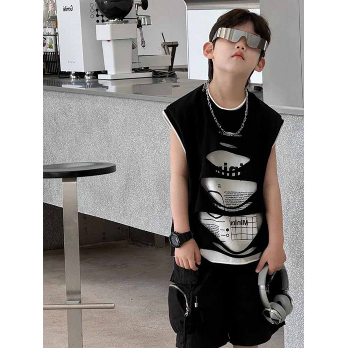 安哼安哼男童酷帥破洞字母假兩件美式背心2025夏季中小童無袖T恤