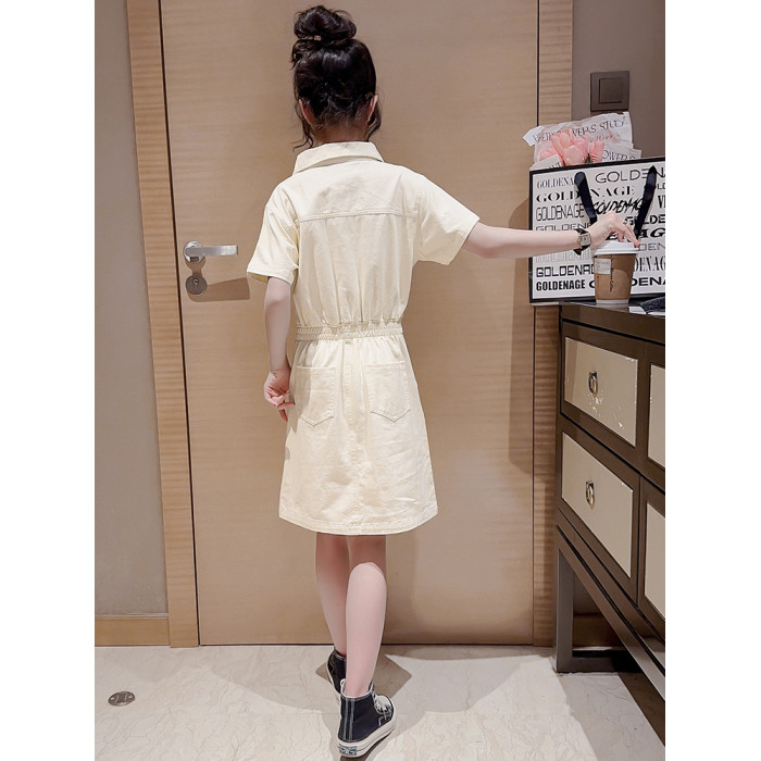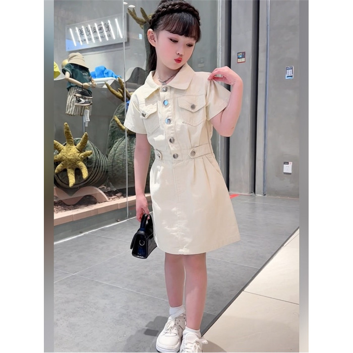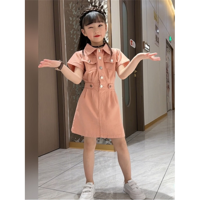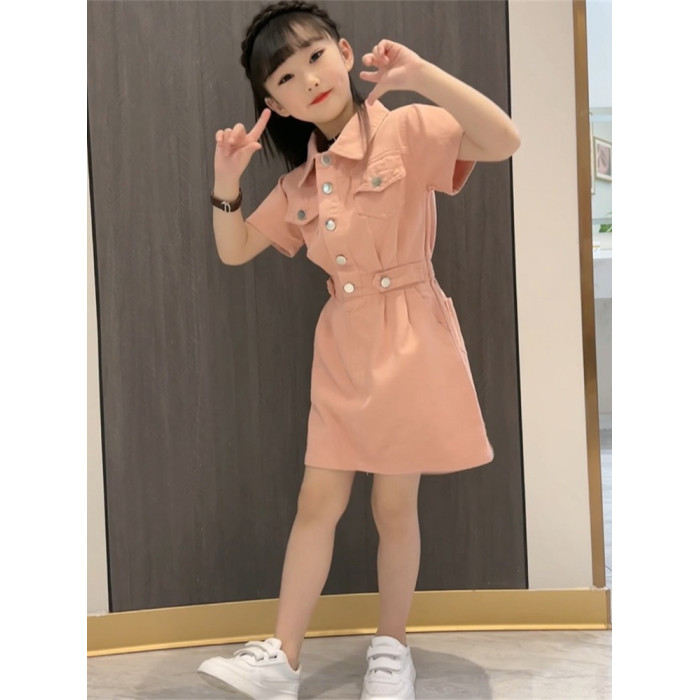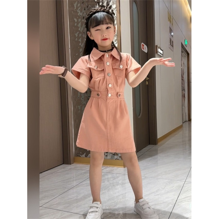 女童工裝學院風薄款連衣裙小女孩洋氣短袖水洗棉布韓版裙子兒童裝
