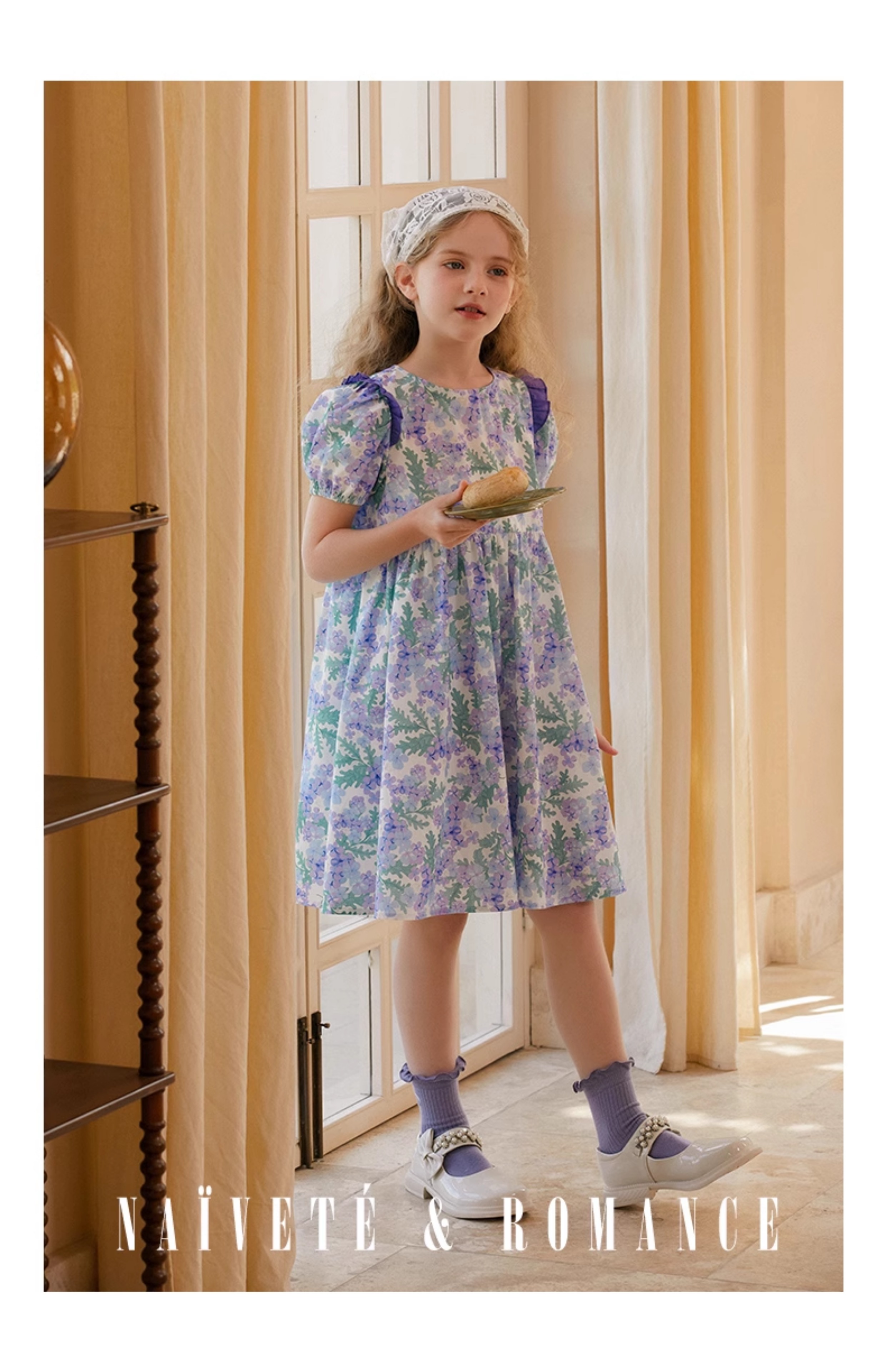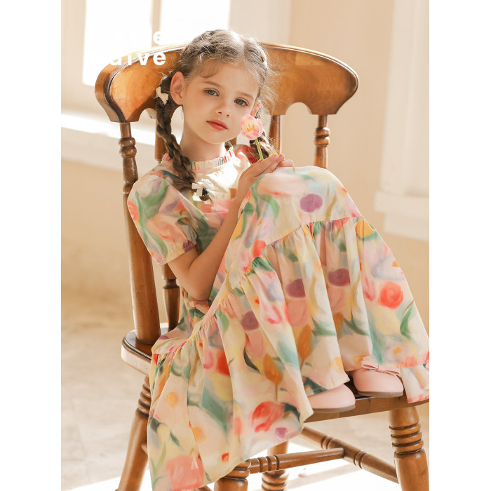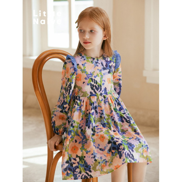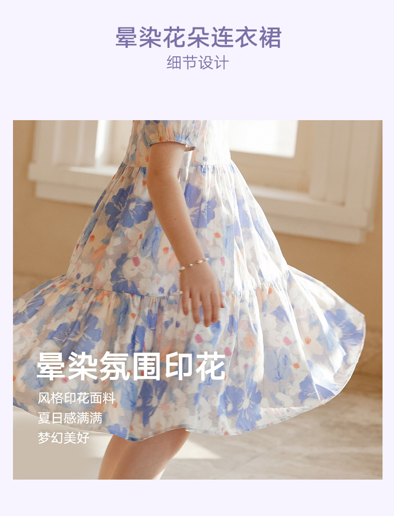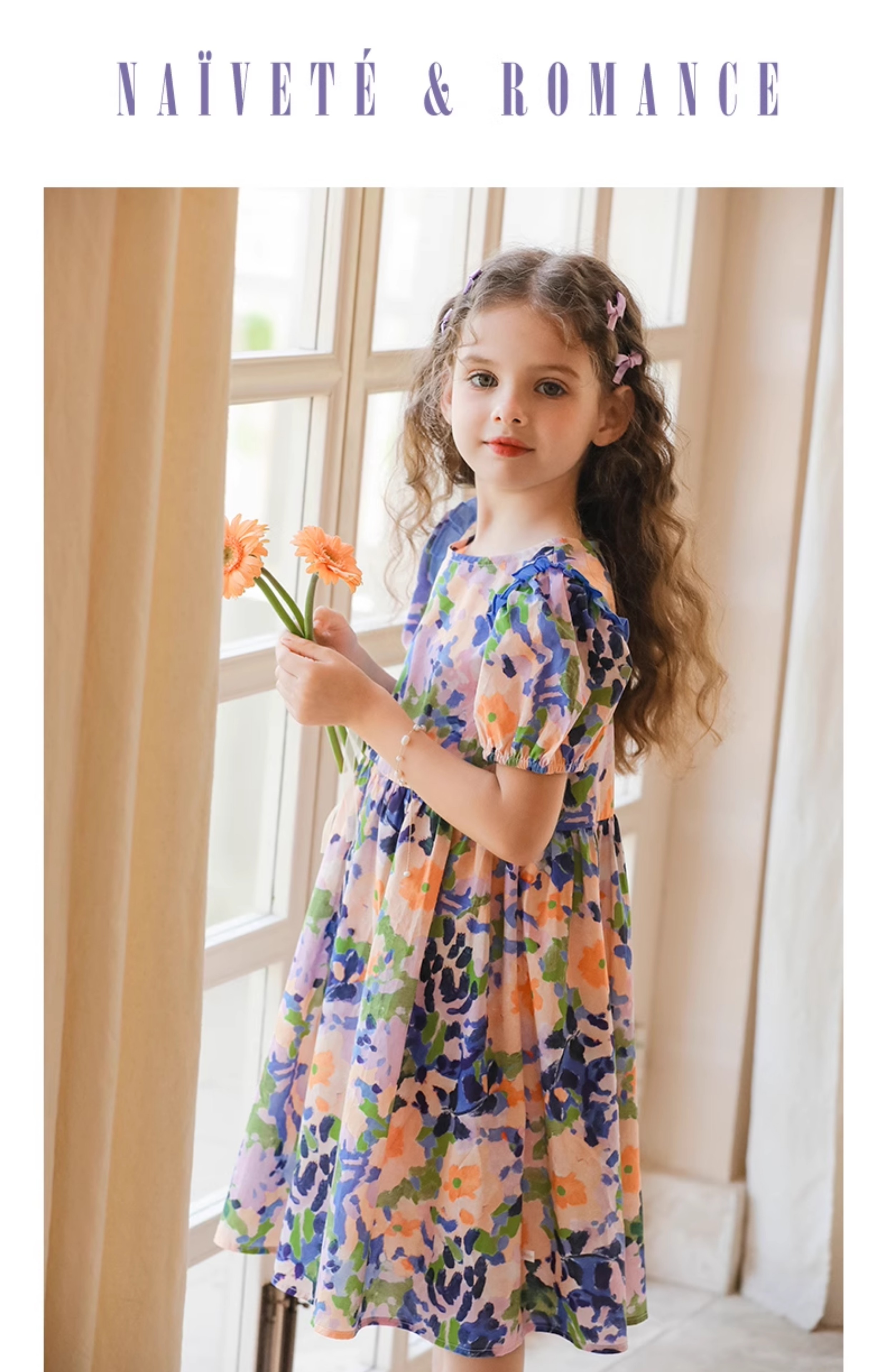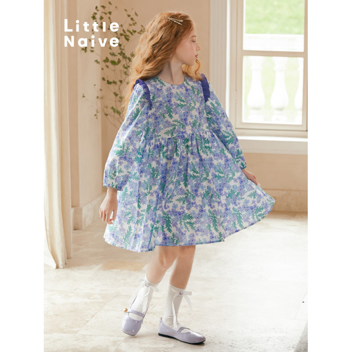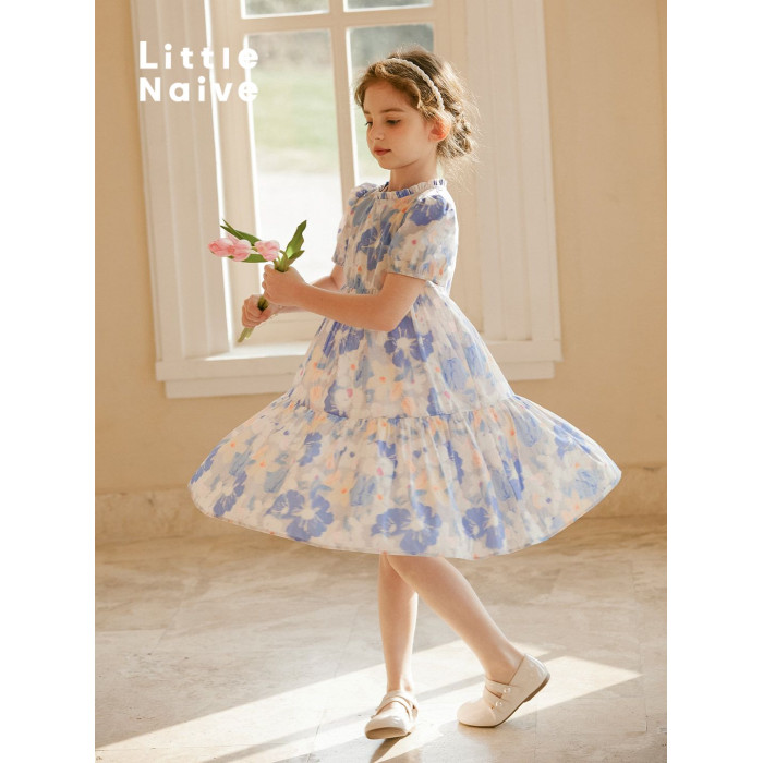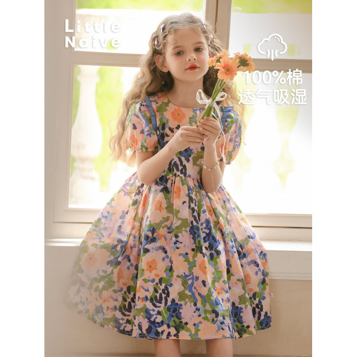 LittleNaive女童連衣裙夏新款多巴胺甜美中大童法式碎花裙子度假